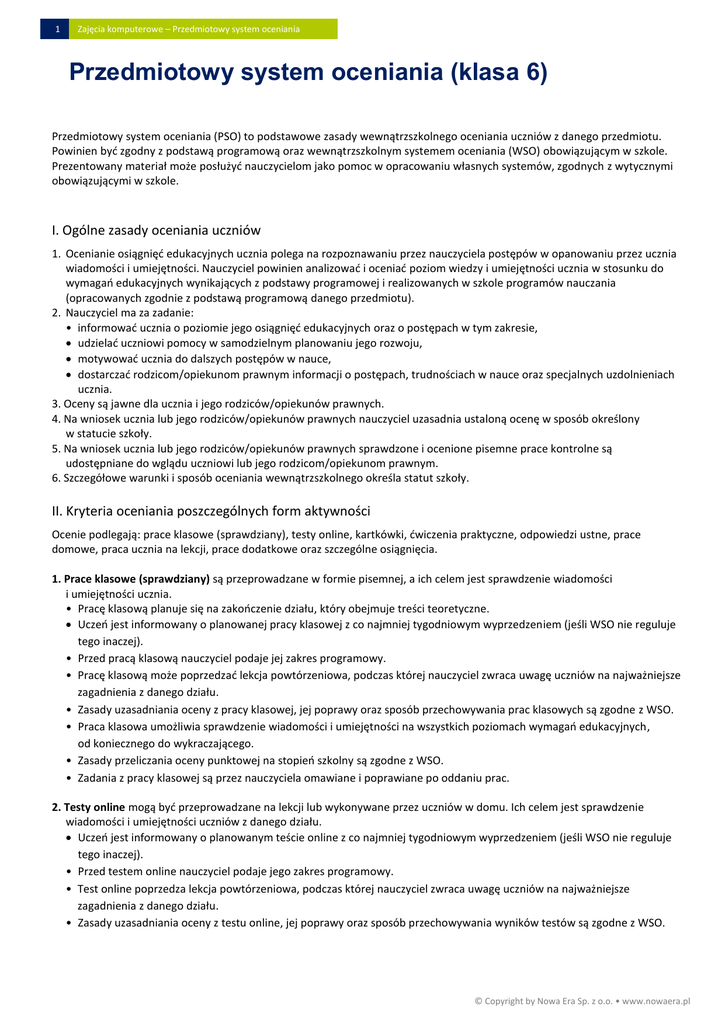1 Zajęcia komputerowe – Przedmiotowy system oceniania Przedmiotowy system oceniania (klasa 6) Przedmiotowy system oceniania (PSO) to podstawowe zasady wewnątrzszkolnego oceniania uczniów z danego przedmiotu. Powinien być zgodny z podstawą programową oraz wewnątrzszkolnym systemem oceniania (WSO) obowiązującym w szkole. Prezentowany materiał może posłużyć nauczycielom jako pomoc w opracowaniu własnych systemów, zgodnych z wytycznymi obowiązującymi w szkole. I. Ogólne zasady oceniania uczniów 1. Ocenianie osiągnięć edukacyjnych ucznia polega na rozpoznawaniu przez nauczyciela postępów w opanowaniu przez ucznia wiadomości i umiejętności. Nauczyciel powinien analizować i oceniać poziom wiedzy i umiejętności ucznia w stosunku do wymagań edukacyjnych wynikających z podstawy programowej i realizowanych w szkole programów nauczania (opracowanych zgodnie z podstawą programową danego przedmiotu). 2. Nauczyciel ma za zadanie: • informować ucznia o poziomie jego osiągnięć edukacyjnych oraz o postępach w tym zakresie, udzielać uczniowi pomocy w samodzielnym planowaniu jego rozwoju, motywować ucznia do dalszych postępów w nauce, dostarczać rodzicom/opiekunom prawnym informacji o postępach, trudnościach w nauce oraz specjalnych uzdolnieniach ucznia. 3. Oceny są jawne dla ucznia i jego rodziców/opiekunów prawnych. 4. Na wniosek ucznia lub jego rodziców/opiekunów prawnych nauczyciel uzasadnia ustaloną ocenę w sposób określony w statucie szkoły. 5. Na wniosek ucznia lub jego rodziców/opiekunów prawnych sprawdzone i ocenione pisemne prace kontrolne są udostępniane do wglądu uczniowi lub jego rodzicom/opiekunom prawnym. 6. Szczegółowe warunki i sposób oceniania wewnątrzszkolnego określa statut szkoły. II. Kryteria oceniania poszczególnych form aktywności Ocenie podlegają: prace klasowe (sprawdziany), testy online, kartkówki, ćwiczenia praktyczne, odpowiedzi ustne, prace domowe, praca ucznia na lekcji, prace dodatkowe oraz szczególne osiągnięcia. 1. Prace klasowe (sprawdziany) są przeprowadzane w formie pisemnej, a ich celem jest sprawdzenie wiadomości i umiejętności ucznia. • Pracę klasową planuje się na zakończenie działu, który obejmuje treści teoretyczne. Uczeń jest informowany o planowanej pracy klasowej z co najmniej tygodniowym wyprzedzeniem (jeśli WSO nie reguluje tego inaczej). • Przed pracą klasową nauczyciel podaje jej zakres programowy. • Pracę klasową może poprzedzać lekcja powtórzeniowa, podczas której nauczyciel zwraca uwagę uczniów na najważniejsze zagadnienia z danego działu. • Zasady uzasadniania oceny z pracy klasowej, jej poprawy oraz sposób przechowywania prac klasowych są zgodne z WSO. • Praca klasowa umożliwia sprawdzenie wiadomości i umiejętności na wszystkich poziomach wymagań edukacyjnych, od koniecznego do wykraczającego. • Zasady przeliczania oceny punktowej na stopień szkolny są zgodne z WSO. • Zadania z pracy klasowej są przez nauczyciela omawiane i poprawiane po oddaniu prac. 2. Testy online mogą być przeprowadzane na lekcji lub wykonywane przez uczniów w domu. Ich celem jest sprawdzenie wiadomości i umiejętności uczniów z danego działu. Uczeń jest informowany o planowanym teście online z co najmniej tygodniowym wyprzedzeniem (jeśli WSO nie reguluje tego inaczej). • Przed testem online nauczyciel podaje jego zakres programowy. • Test online poprzedza lekcja powtórzeniowa, podczas której nauczyciel zwraca uwagę uczniów na najważniejsze zagadnienia z danego działu. • Zasady uzasadniania oceny z testu online, jej poprawy oraz sposób przechowywania wyników testów są zgodne z WSO. © Copyright by Nowa Era Sp. z o.o. • www.nowaera.pl 2 Zajęcia komputerowe – Przedmiotowy system oceniania • Zasady przeliczania oceny punktowej na stopień szkolny są zgodne z WSO. • Zadania z testów online są przez nauczyciela omawiane i poprawiane po zakończeniu testu. 3. Kartkówki są przeprowadzane w formie pisemnej, a ich celem jest sprawdzenie wiadomości i umiejętności ucznia z zakresu programowego ostatnich jednostek lekcyjnych (maksymalnie trzech). • Nauczyciel nie ma obowiązku uprzedzania uczniów o terminie i zakresie programowym kartkówki. • Kartkówka powinna być tak skonstruowana, aby uczeń mógł wykonać wszystkie polecenia w czasie nie dłuższym niż 15 minut. • Kartkówka jest oceniana w skali punktowej, a liczba punktów jest przeliczana na ocenę zgodnie z zasadami WSO. • Zasady przechowywania kartkówek reguluje WSO. 4. Ćwiczenia praktyczne obejmują zadania praktyczne, które uczeń wykonuje podczas lekcji. Oceniając je, nauczyciel bierze pod uwagę: • wartość merytoryczną, stopień zaangażowanie w wykonanie ćwiczenia, dokładność wykonania polecenia, • staranność i estetykę. 5. Odpowiedź ustna obejmuje zakres programowy aktualnie realizowanego działu. Oceniając ją, nauczyciel bierze pod uwagę: • zgodność wypowiedzi z postawionym pytaniem, • prawidłowe posługiwanie się pojęciami, • zawartość merytoryczną wypowiedzi, • sposób formułowania wypowiedzi. 6. Praca domowa jest pisemną (praktyczną) formą ćwiczenia umiejętności i utrwalania wiadomości zdobytych przez ucznia podczas lekcji. • Pracę domową uczeń wykonuje na komputerze (i zapisuje ją w odpowiednim miejscu wskazanym przez nauczyciela, np. w Teczce ucznia), w zeszycie, w zbiorze zadań lub w formie zleconej przez nauczyciela. • Brak pracy domowej jest oceniany zgodnie z umową między nauczycielem a uczniami, z uwzględnieniem zapisów WSO. • Błędnie wykonana praca domowa jest sygnałem dla nauczyciela, mówiącym o konieczności wprowadzenia dodatkowych ćwiczeń utrwalających umiejętności i nie może być oceniona negatywnie. • Przy wystawianiu oceny za pracę domową nauczyciel bierze pod uwagę samodzielność, poprawność i estetykę wykonania. 7. Aktywność i praca ucznia na 