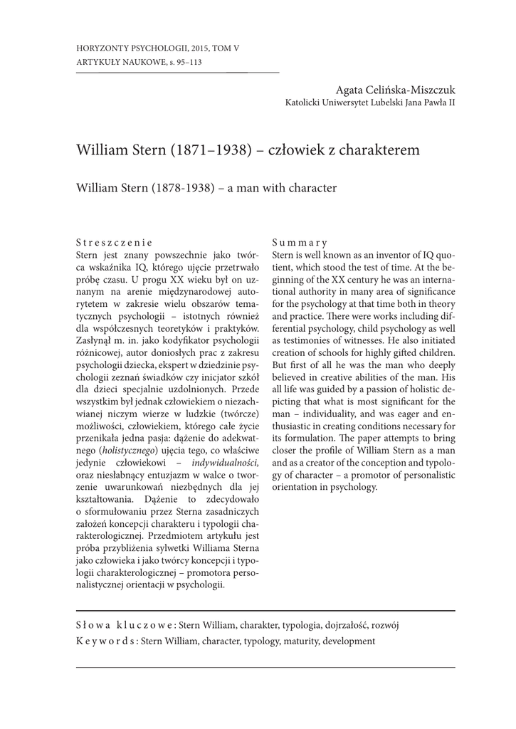 Horyzonty psychologii, 2015, tom V artykuły naukowe, s. 95–113 Agata Celińska-Miszczuk Katolicki Uniwersytet Lubelski Jana Pawła II William Stern (1871–1938) – człowiek z charakterem William Stern (1878-1938) – a man with character Streszczenie Stern jest znany powszechnie jako twórca wskaźnika IQ, którego ujęcie przetrwało próbę czasu. U progu XX wieku był on uznanym na arenie międzynarodowej autorytetem w zakresie wielu obszarów tematycznych psychologii – istotnych również dla współczesnych teoretyków i praktyków. Zasłynął m. in. jako kodyfikator psychologii różnicowej, autor doniosłych prac z zakresu psychologii dziecka, ekspert w dziedzinie psychologii zeznań świadków czy inicjator szkół dla dzieci specjalnie uzdolnionych. Przede wszystkim był jednak człowiekiem o niezachwianej niczym wierze w ludzkie (twórcze) możliwości, człowiekiem, którego całe życie przenikała jedna pasja: dążenie do adekwatnego (holistycznego) ujęcia tego, co właściwe jedynie człowiekowi – indywidualności, oraz niesłabnący entuzjazm w walce o tworzenie uwarunkowań niezbędnych dla jej kształtowania. Dążenie to zdecydowało o sformułowaniu przez Sterna zasadniczych założeń koncepcji charakteru i typologii charakterologicznej. Przedmiotem artykułu jest próba przybliżenia sylwetki Williama Sterna jako człowieka i jako twórcy koncepcji i typologii charakterologicznej – promotora personalistycznej orientacji w psychologii. Summary Stern is well known as an inventor of IQ quotient, which stood the test of time. At the beginning of the XX century he was an international authority in many area of significance for the psychology at that time both in theory and practice. There were works including differential psychology, child psychology as well as testimonies of witnesses. He also initiated creation of schools for highly gifted children. But first of all he was the man who deeply believed in creative abilities of the man. His all life was guided by a passion of holistic depicting that what is most significant for the man – individuality, and was eager and enthusiastic in creating conditions necessary for its formulation. The paper attempts to bring closer the profile of William Stern as a man and as a creator of the conception and typology of character – a promotor of personalistic orientation in psychology. S ł o w a k l u c z o w e : Stern William, charakter, typologia, dojrzałość, rozwój K e y w o r d s : Stern William, character, typology, maturity, development 96 A. Celińska-Miszczuk, William Stern (1871–1938) – człowiek z charakterem Horyzonty psychologii, 2015, tom V – artykuły naukowe Psychologia, którą uprawiamy, jest przejawem tego, co parę osób tu czy gdzie indziej odkryło w sobie samych. Forma, w którą te osoby ubrały swoje doświadczenia, jest niekiedy adekwatna, a czasem nie. […]. C. G. Jung Wprowadzenie William Stern (1871–1938) – niemiecki filozof i psycholog, profesor Uniwersytetu Wrocławskiego1, Uniwersytetu Hamburskiego, jak również Duke University w Durham, określany dziś „ojcem” współczesnej psychologii, zaginiona czy wręcz utracona jej „gwiazda” („A Lost Star”) – był autorytetem w tej dziedzinie u progu XX wieku (por. Lamiell, 2003, s. 1–26; Popińska, 2009, za: Kaszewski, 2009; Koczanowicz-Dehnel, 2014). Wyrazem tego może być fakt, że kiedy zorganizowano międzynarodową konferencję psychologów w amerykańskim Clark University z okazji 20-lecia ufundowania uczelni, na pokładzie transatlantyku George Washington, płynącego z Niemiec do Nowego Jorku, był między innymi Sandor Ferenczi, Sigmunt Freud, Carl Jung i właśnie Stern. Trzydziestego sierpnia 1909 roku New York Times, informując o grupie wyśmienitych uczonych, którzy zawitali do portu, odnotował spośród powyżej wymienionych jedynie nazwisko Sterna. Stern został też pierwszym doktorem honoris causa Clark University (Lamiell, 2003). Pisząc o Sternie w 2009 roku, C. Kaszewski podkreśla, że – choć Stern był „wrocławskim VIP-em z początków XX wieku” – jego nazwiska nie ma w Encyklopedii Wrocławia, w ratuszowej Galerii Sławnych Wrocławian2, zaś dzisiejsi studenci psychologii (zapytani o nazwisko Williama Sterna) „bezradnie wzruszają ramionami lub – w najlepszym razie – odpowiedzą pytaniem: Czy był to ten od IQ?”. Faktem jest, że Stern jest dziś powszechnie znany jako twórca formuły ilorazu inteligencji, wiązany jest zatem z tym fragmentem swojej naukowej aktywności, którego sam nie uznawał za istotny wkład w dziedzinę psychologii (Tyler, 1984, za: Lamiell, 2003). Naukowy dorobek Sterna jest o wiele bogatszy. W 2014 roku I. Koczanowicz-Dehnel publikuje artykuł, w którym podkreśla wagę poglądów Sterna dla genezy współczesnej psychologii. Zaznacza, że osiągnięcia Sterna dały początek wielu współczesnym teoriom z zakresu psychologii personalistycznej, rozwojowej, środowiskowej, osobowości oraz indywidualnych różnic. W. Schmidt (2000) określa go „multispecjalistą”, zaś do kluczowych elementów jego twórczości zalicza między innymi to, że był kodyfikatorem psychologii różnicowej, autorem (z żoną Cla 1 2 Za życia Sterna-Breslau. Podkreślić trzeba jednak, że w 2007 roku, w ramach publikacji poświęconej filozofii na Uniwersytecie Wrocławskim, I. Alechnowicz (2007) omawia filozoficzne podstawy psychologii, zaproponowane przez Sterna. A. Celińska-Miszczuk, William Stern (1871–1938) – człowiek z charakterem Horyzonty psychologii, 2015, tom V – artykuły naukowe 97 rą) kluczowych prac z zakresu psychologii dziecka, uznanym na arenie międzynarodowej ekspertem w dziedzinie psychologii zeznań świadków, twórcą terminu „psychotechnika”, inicjatorem szkół dla dzieci specjalnie uzdolnionych oraz – co dla Sterna (1930) było najistotniejsze – poszukującym adekwatnego (całościowego) sposobu uchwycenia integral
