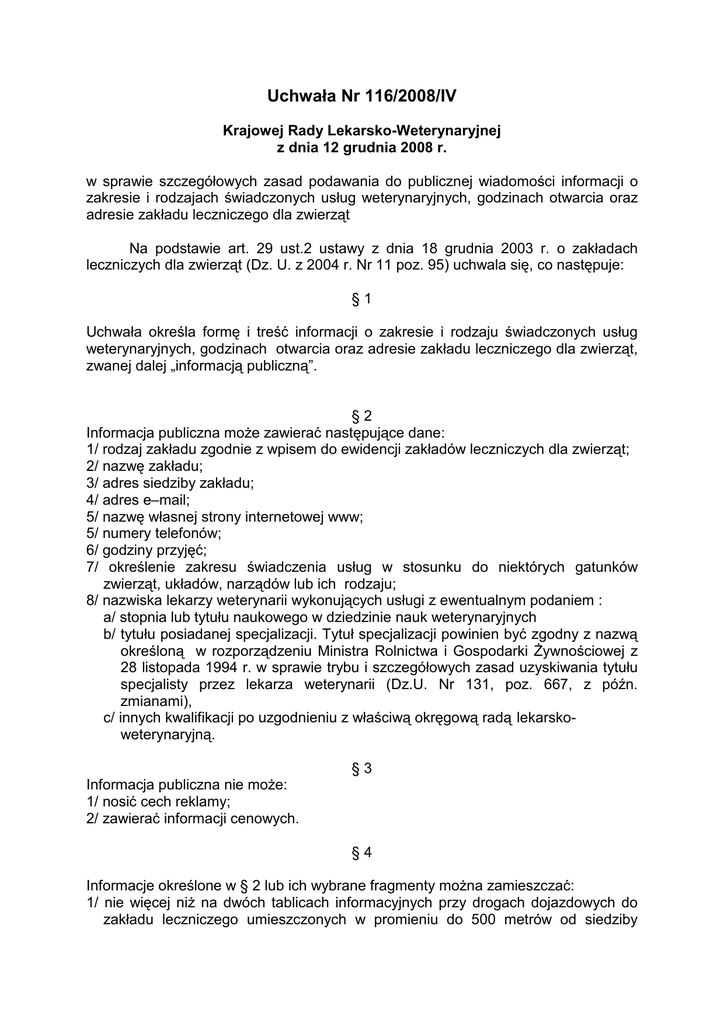 Uchwała Nr 116/2008/IV Krajowej Rady Lekarsko-Weterynaryjnej z dnia 12 grudnia 2008 r. w sprawie szczegółowych zasad podawania do publicznej wiadomości informacji o zakresie i rodzajach świadczonych usług weterynaryjnych, godzinach otwarcia oraz adresie zakładu leczniczego dla zwierząt Na podstawie art. 29 ust.2 ustawy z dnia 18 grudnia 2003 r. o zakładach leczniczych dla zwierząt (Dz. U. z 2004 r. Nr 11 poz. 95) uchwala się, co następuje: §1 Uchwała określa formę i treść informacji o zakresie i rodzaju świadczonych usług weterynaryjnych, godzinach otwarcia oraz adresie zakładu leczniczego dla zwierząt, zwanej dalej „informacją publiczną”. §2 Informacja publiczna moŜe zawierać następujące dane: 1/ rodzaj zakładu zgodnie z wpisem do ewidencji zakładów leczniczych dla zwierząt; 2/ nazwę zakładu; 3/ adres siedziby zakładu; 4/ adres e–mail; 5/ nazwę własnej strony internetowej www; 5/ numery telefonów; 6/ godziny przyjęć; 7/ określenie zakresu świadczenia usług w stosunku do niektórych gatunków zwierząt, układów, narządów lub ich rodzaju; 8/ nazwiska lekarzy weterynarii wykonujących usługi z ewentualnym podaniem : a/ stopnia lub tytułu naukowego w dziedzinie nauk weterynaryjnych b/ tytułu posiadanej specjalizacji. Tytuł specjalizacji powinien być zgodny z nazwą określoną w rozporządzeniu Ministra Rolnictwa i Gospodarki śywnościowej z 28 listopada 1994 r. w sprawie trybu i szczegółowych zasad uzyskiwania tytułu specjalisty przez lekarza weterynarii (Dz.U. Nr 131, poz. 667, z późn. zmianami), c/ innych kwalifikacji po uzgodnieniu z właściwą okręgową radą lekarskoweterynaryjną. §3 Informacja publiczna nie moŜe: 1/ nosić cech reklamy; 2/ zawierać informacji cenowych. §4 Informacje określone w § 2 lub ich wybrane fragmenty moŜna zamieszczać: 1/ nie więcej niŜ na dwóch tablicach informacyjnych przy drogach dojazdowych do zakładu leczniczego umieszczonych w promieniu do 500 metrów od siedziby zakładu. W przypadkach spornych dotyczących miejsca usytuowania tablic spór rozstrzyga okręgowa rada lekarsko weterynaryjna, 2/ na tablicy informacyjnej zewnątrz i wewnątrz obiektu zakładu leczniczego, 3/ w ksiąŜkach telefonicznych w dziale dotyczącym usług weterynaryjnych, 4/ w informatorach gospodarczych, 5/ na stronach internetowych, 6/ na wizytówkach, 7/ w broszurach informacyjnych zakładu leczniczego, 8/ w prasie w rubrykach dotyczących usług weterynaryjnych, 9/ na samochodach uŜywanych przez zakład leczniczy dla zwierząt, właściciela i kierownika zakładu leczniczego dla zwierząt. §5 1. Informacja prasowa i w ksiąŜce telefonicznej nie moŜe przekraczać powierzchni 1800 mm kwadratowych. 2. Niedozwolona jest wszelka aktywna forma informacji o zakładzie leczniczym dla zwierząt w formie: 1/ rozdawania ulotek, wizytówek, broszur lub innych materiałów reklamowych poza siedzibą zakładu leczniczego dla zwierząt; 2/ wysyłania ogłoszeń pocztą, internetowych i SMS-owych; 3/ artykułów na zamówienie w mediach; 4/ artykułów sponsorowanych w mediach; 5/ plakatów z wyjątkiem ogłoszeń o obowiązkowych szczepieniach, 6/ informacji wielkoformatowej przekraczającej 4 metry kwadratowe, 7/ informacji na samochodach, autobusach lub innych środkach komunikacji z wyjątkiem samochodu uŜywanego przez zakład leczniczy dla zwierząt, właściciela i kierownika tego zakładu; 8/ tworzenia w celach reklamowania usług: prezentacji, filmów z przeprowadzanych zabiegów, stosowanego leczenia, dostępnych powszechnie (np. strony internetowe); 9/ umieszczania informacji na przystankach komunikacji publicznej. 3. Niedopuszczalne jest zamawianie lub sponsorowanie audycji i publikacji w mediach na temat zakładu leczniczego dla zwierząt. §6 Lekarz weterynarii prowadzący praktykę w zakładzie leczniczym dla zwierząt odpowiada za treść publikacji prasowych, radiowych i telewizyjnych z jego udziałem. Podawana przy tej okazji informacja moŜe zawierać jego nazwisko, stopień lub tytuł naukowy wyłącznie w dziedzinie nauk weterynaryjnych i specjalizację określoną w rozporządzeniu Ministra Rolnictwa i Gospodarki śywnościowej z 28 listopada 1994 r. w sprawie trybu i szczegółowych zasad uzyskiwania tytułu specjalisty przez lekarza weterynarii (Dz.U. Nr 131, poz. 667 z późn. zm.) oraz miejscowość, w której prowadzona jest praktyka. §7 Za realizację postanowień niniejszej uchwały odpowiedzialny jest kierownik zakładu leczniczego dla zwierząt. §8 Zakłady lecznicze dla zwierząt wpisane do ewidencji prowadzonej przez okręgowe rady lekarsko-weterynaryjne obowiązane są dostosować dotychczas stosowane formy informacji publicznej do przepisów uchwały do dnia 30 czerwca 2009 roku §9 . Traci moc uchwała Krajowej Rady Lekarsko-Weterynaryjnej Nr 109/2005/IV z dnia 25 maja 2005 roku w sprawie zasad informowania o wykonywaniu praktyk lekarskoweterynaryjnych, zmieniona uchwałą 82/2007/IV z dnia 6 września 2007 r. § 10 Uchwała wchodzi w Ŝycie z dniem podjęcia . Sekretarz Krajowej Rady LekarskoWeterynaryjnej Prezes Krajowej Rady LekarskoWeterynaryjnej ................................................ Marek Mastalerek ................................................ Tadeusz Jakubowski