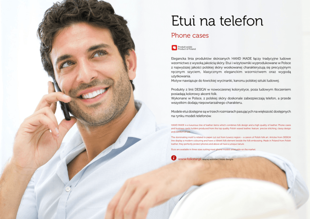 Etui na telefon Phone cases Produkt polski Product of Poland Elegancka linia produktów skórzanych HAND MADE łączy tradycyjne ludowe wzornictwo z wysoką jakością skóry. Etui i wizytowniki wyprodukowane w Polsce z najwyższej jakości polskiej skóry woskowanej charakteryzują się precyzyjnym ręcznym szyciem, klasycznym eleganckim wzornictwem oraz wygodą użytkowania. Motyw nawiązuje do łowickiej wycinanki, kanonu polskiej sztuki ludowej. Produkty z linii DESIGN w nowoczesnej kolorystyce, poza ludowym tłoczeniem posiadają kolorowy akcent folk. Wykonane w Polsce, z polskiej skóry doskonale zabezpieczają telefon, a przede wszystkim dodają niepowtarzalnego charakteru. Modele etui dostępne są w trzech rozmiarach pasujących na większość dostępnych na rynku modeli telefonów. HAND MADE is a luxurious line of leather items which combines folk design and a high quality of leather. Phone cases and business cards holders produced from the top quality Polish waxed leather, feature precise stitching, classy design and comfort of use. The dominating motif is related to paper cut out from Łowicz region – a canon of Polish folk art. Articles from DESIGN line display a modern colouring and have a vibrant folk element beside the folk embossing. Made in Poland from Polish leather, they perfectly protect phones and above all have a unique nature. Etuis are available in three sizes suiting most phone models attainable on the market. www.folkstar.pl więcej wzorów / more designs Linia HAND MADE Rękodzieło Hand Made Etiu na telefon Phone case Ręcznie szyte etui na telefon z wysokiej jakości polskiej woskowanej skóry. Rozmiary M,L,XL ( więcej o rozmiarach na www.folkstar.pl/rozmiary ) 12895 12896 12897 12898 95 PLN Projekt Design Linia DESIGN Wizytownik Business Card Holder Ręcznie szyty wizytownik z wysokiej jakości polskiej woskowanej skóry. 12905 12906 55 PLN Etiu na telefon Phone case Nowoczesne etui na telefon z wysokiej jakości polskiej skóry. Rozmiary M,L,XL ( więcej o rozmiarach na www.folkstar.pl/rozmiary ) 12899 12900 12901 12902 12903 12904 65 PLN