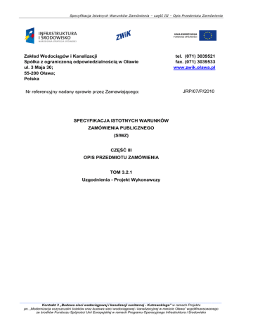 Specyfikacja Istotnych Warunków Zamówienia – część III – Opis Przedmiotu Zamówienia Zakład Wodociągów i Kanalizacji Spółka z ograniczoną odpowiedzialnością w Oławie ul. 3 Maja 30; 55-200 Oława; Polska tel. (071) 3039521 fax. (071) 3039533 www.zwik.olawa.pl Nr referencyjny nadany sprawie przez Zamawiającego: JRP/07/P/2010 SPECYFIKACJA ISTOTNYCH WARUNKÓW ZAMÓWIENIA PUBLICZNEGO (SIWZ) CZĘŚĆ III OPIS PRZEDMIOTU ZAMÓWIENIA TOM 3.2.1 Uzgodnienia - Projekt Wykonawczy _______________________________________________________________________________________________ Kontrakt 3 „Budowa sieci wodociągowej i kanalizacji sanitarnej - Kutrowskiego” w ramach Projektu pn. „Modernizacja oczyszczalni ścieków oraz budowa sieci wodociągowej i kanalizacyjnej w mieście Oława” współfinansowanego ze środków Funduszu Spójności Unii Europejskiej w ramach Programu Operacyjnego Infrastruktura i Środowisko Specyfikacja Istotnych Warunków Zamówienia – część III – Opis Przedmiotu Zamówienia Zamawiający załącza następujące decyzje i inne dokumenty: Lp. Lokalizacja Nazwa dokumentu Wydany przez Starostwo Powiatowe w Oławie 1 Tom 3.1.2 cz. III Opinia ZUDP-2530/2008 uzgodnienia dokumentacji projektowej Wydział Geodezji i Gospodarki Nieruchomościami 55-200 Oława, Ul. 3-go Maja1 Decyzja Nr 26/07 o ustaleniu lokalizacji inwestycji celu 2 Tom 3.1.1a cz. III publicznego Burmistrz Miasta Oława UA-73311-25/07 2a Tom 3.1.1.a cz. III Zaświadczenie. Urząd Miejski w Oławie UA-7358/83/08 pl. Zamkowy 15 Decyzja Nr 25/08 o ustaleniu lokalizacji inwestycji celu 3 Tom 3.1.2 cz. III publicznego Burmistrz Miasta Oława UA-73311/27/08 Decyzja o środowiskowych uwarunkowaniach zgody na 4 Tom 3.1.2 cz. III realizacje przedsięwzięcia Burmistrz Miasta Oława GKM-7624/7/2006 Ministerstwo Środowiska 5 Tom 3.1.1.a cz. III Pismo DDOŚ – 072 – 46/6785/07/ef Departament Oceny Oddziaływania na Środowisko Generalna Dyrekcja Dróg 6 Tom 3.1.1.a cz. III Generalna Dyrekcja Dróg Krajowych i Autostrad Krajowych i Autostrad GDDKiA-O/WR-Z.3/O/4350/181/2008 Oddz. Wrocław Ul. Powstańców Śląskich 186 7 Tom 3.1.1a cz. III Decyzja UZG/61/08 o uzgodnieniu przebiegu sieci Zarząd Dróg Miejskich i wodociągowej i kanalizacji sanitarnej w drogach gminnych Zieleni, wewnętrznych należących do Gminy Miejskiej Oława ul. 3 Maja 30 Oława Decyzja ZDMiZ/UZG/61/08 Tel. 071 313 94 45 Zarząd Dróg Miejskich i 8 Tom 3.1.1.a cz. III Zarząd Dróg Miejskich Zieleni, Postanowienie nr 44/2008 ul. 3 Maja 30 Oława Tel. 071 313 94 45 Zatwierdzenie Nr 53/2008 projektu organizacji ruchu 9 Tom 3.1.1a cz. III zastępczego na czas budowy sieci wodociągowej i Starostwo Powiatowe w kanalizacyjnej w pasie dróg gminnych w rejonie ulicy Oławie, ul 3 Maja 1, 55-200 Kutrowskiego w Oławie Oława Zatwierdzenie KM.5420-75/08 10 Tom 3.1.1.a cz. III Gmina Miasto Oława Gmina Miasto Oława Pismo: INW/7020-175/08 pl. Zamkowy 15 Dolnośląski Zarząd Melioracji 11 Tom 3.1.2 cz. III Pismo ME-460/46/08, Ldz.177/08/Oława i Wodnych we Wrocławiu, Inspektorat w Oławie, 55200 Oława, ul. 3 Maja 1 _______________________________________________________________________________________________ Kontrakt 3 „Budowa sieci wodociągowej i kanalizacji sanitarnej - Kutrowskiego” w ramach Projektu pn. „Modernizacja oczyszczalni ścieków oraz budowa sieci wodociągowej i kanalizacyjnej w mieście Oława” współfinansowanego ze środków Funduszu Spójności Unii Europejskiej w ramach Programu Operacyjnego Infrastruktura i Środowisko Specyfikacja Istotnych Warunków Zamówienia – część III – Opis Przedmiotu Zamówienia Uzgodnienie projektu sieci wodociągowej i kanalizacji 12 Tom 3.1.2 cz. III sanitarnej dla zadania 4 w rejonie ulicy Kutrowskiego w Oławie Uzgodnienie RDE54/PK/3430/2008 EnergiaPro GRUPA TAURON S.A. Oddział we Wrocławiu, Rejon Dystrybucji Strzelin, 57-100 Strzelin, ul. Dzierżoniowska 51 Telekomunikacja Polska Pion 13 Tom 3.1.2 cz. III Uzgodnienie projektu sieci wodociągowej i kanalizacji Sieci i Platform Usługowych sanitarnej dla zadania 4 w rejonie ulicy Kutrowskiego w Grupy TP, Obszar Oławie Eksploatacji we Wrocławiu, Uzgodnienie TSSWWZEU-OA.2110-021/08/JS ul. Purkyniego 2, 50-155 Wrocław Uzgodnienie projektu sieci wodociągowej i kanalizacji 14 Tom 3.1.2 cz. III sanitarnej dla zadania 4 w rejonie ulicy Kutrowskiego w Oławie Uzgodnienie E/S/08/732/IS Uzgodnienie projektu sieci wodociągowej i kanalizacji 15 Tom 3.1.2 cz. III sanitarnej dla zadania 4 w rejonie ulicy Kutrowskiego w Oławie Uzgodnienie RTT-8/150/382-1/2008 Uzgodnienie projektu sieci wodociągowej i kanalizacji 16 Tom 3.1.2 cz. III sanitarnej dla zadania 4 w rejonie ulicy Kutrowskiego w Oławie Uzgodnienie OGP/TT-7/PSG/010-1/2008 Ericsson Sp. z o.o., 47-100 Strzelce Opolskie, ul. Marka Prawego 23 Dolnośląski Operator Systemu Dystrybucyjnego Sp. z o.o, Oddział Dystrybucji Wrocław, 50-507 Wrocław, ul. Ziębicka 44 Operator Gazociągów Przesyłowych GAZ-SYSTEM S.A. Oddział we Wrocławiu, 50-513 Wrocław, ul. Gazowa 3 Zakład Wodociągów i 17 Tom 3.1.2 cz. III Warunki techniczne wykonania sieci wodociągowej i Kanalizacji Spółka z kanalizacyjnej i podłączenia do miejskich sieci sanitarnych ograniczoną – rejon ulicy Kutrowskiego w Oławie odpowiedzialnością w Oławie PT/274/2008 55-200 Oława Ul. 3 Maja 30 Zakład Wodociągów i 18 Tom 3.1.2 cz. III Uzgodnienie projektu sieci wodociągowej i kanalizacji Kanalizacji Spółka z sanitarnej dla zadania 4 w rejonie ulicy Kutrowskiego w ograniczoną Oławie odpowiedzialnością w Oławie PT/456/2008 55-200 Oława Ul. 3 Maja 30 Zakład Wodociągów i 19 Tom 3.2.1 cz. II Uzgodnienie projektu wykonawczego sieci wodociągowej i Kanalizacji Spółka z kanalizacji sanitarnej dla zadania 4 w rejonie ulicy ograniczoną Kutrowskiego w Oławie odpowiedzialnością w Oławie PT/620/2008 55-200 Oława Ul. 3 Maja 30 Uzgodnienie projektu sieci wodociągowej i kanalizacji 20 Tom 3.1
