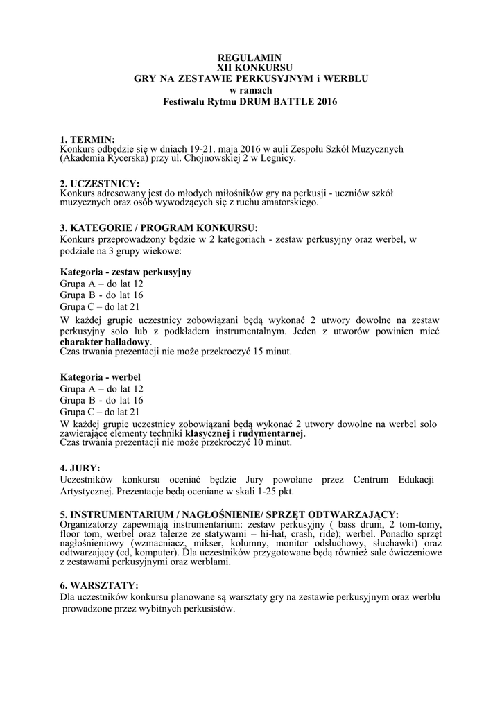 REGULAMIN XII KONKURSU GRY NA ZESTAWIE PERKUSYJNYM i WERBLU w ramach Festiwalu Rytmu DRUM BATTLE 2016 1. TERMIN: Konkurs odbędzie się w dniach 19-21. maja 2016 w auli Zespołu Szkół Muzycznych (Akademia Rycerska) przy ul. Chojnowskiej 2 w Legnicy. 2. UCZESTNICY: Konkurs adresowany jest do młodych miłośników gry na perkusji - uczniów szkół muzycznych oraz osób wywodzących się z ruchu amatorskiego. 3. KATEGORIE / PROGRAM KONKURSU: Konkurs przeprowadzony będzie w 2 kategoriach - zestaw perkusyjny oraz werbel, w podziale na 3 grupy wiekowe: Kategoria - zestaw perkusyjny Grupa A – do lat 12 Grupa B - do lat 16 Grupa C – do lat 21 W każdej grupie uczestnicy zobowiązani będą wykonać 2 utwory dowolne na zestaw perkusyjny solo lub z podkładem instrumentalnym. Jeden z utworów powinien mieć charakter balladowy. Czas trwania prezentacji nie może przekroczyć 15 minut. Kategoria - werbel Grupa A – do lat 12 Grupa B - do lat 16 Grupa C – do lat 21 W każdej grupie uczestnicy zobowiązani będą wykonać 2 utwory dowolne na werbel solo zawierające elementy techniki klasycznej i rudymentarnej. Czas trwania prezentacji nie może przekroczyć 10 minut. 4. JURY: Uczestników konkursu oceniać będzie Jury powołane przez Centrum Edukacji Artystycznej. Prezentacje będą oceniane w skali 1-25 pkt. 5. INSTRUMENTARIUM / NAGŁOŚNIENIE/ SPRZĘT ODTWARZAJĄCY: Organizatorzy zapewniają instrumentarium: zestaw perkusyjny ( bass drum, 2 tom-tomy, floor tom, werbel oraz talerze ze statywami – hi-hat, crash, ride); werbel. Ponadto sprzęt nagłośnieniowy (wzmacniacz, mikser, kolumny, monitor odsłuchowy, słuchawki) oraz odtwarzający (cd, komputer). Dla uczestników przygotowane będą również sale ćwiczeniowe z zestawami perkusyjnymi oraz werblami. 6. WARSZTATY: Dla uczestników konkursu planowane są warsztaty gry na zestawie perkusyjnym oraz werblu prowadzone przez wybitnych perkusistów. 7. KONCERTY: Uczestnicy konkursu oraz ich opiekunowie mają bezpłatny wstęp na wszystkie koncerty w ramach XII Festiwalu Rytmu Drum Battle 2016. 8. ZGŁOSZENIA: wypełniony formularz zgłoszeniowy (wg. załączonego wzoru) wraz z kopią dowodu wpłaty wpisowego w wysokości: - 90 zł w przypadku uczestnictwa w jednej kategorii - 140 zł w przypadku uczestnictwa w dwóch kategoriach na ( konto: Rada Rodziców przy ZSM w Legnicy BZ WBK S.A. O/L-ca 06 1090 2066 0000 0005 4200 5133 z dopiskiem – wpisowe konkurs Drum Battle 2016 ) należy przesłać do 30 kwietnia 2016 faxem, pocztą lub mailem na adres organizatora. W razie rezygnacji kandydata wpisowe nie podlega zwrotowi. Potwierdzenie uczestnictwa i harmonogram konkursu oraz warsztatów uczestnicy otrzymają do dnia 09 maja 2016. 8. MATERIAŁY NUTOWE: W kategorii werbel, każdy z uczestników konkursu zobowiązany jest dostarczyć najpóźniej do dnia rozpoczęcia konkursu 3 egzemplarze nut wykonywanego programu. 9. NAGRODY: Dla laureatów przeznaczono atrakcyjne nagrody w postaci wysokiej klasy instrumentów, akcesoriów perkusyjnych oraz materiałów dydaktycznych. Każdy z uczestników otrzyma dyplom uczestnictwa oraz drobny perkusyjny upominek. 10. ZAKWATEROWANIE / WYŻYWIENIE: Uczestnicy sami dokonują rezerwacji zakwaterowania i pokrywają wszystkie koszty związane z przejazdem i pobytem w czasie konkursu. Poniżej podajemy informację o możliwościach zakwaterowania i wyżywienia. Noclegi: - Hotel „Arkadia” ul. Gliwicka 6, tel. (076) 85 07 801 - Hotel „Pałacyk” ul. Kościuszki 37, Tel (076) 862 04 44 - Hotelik „Parkowy” ul. Parkowa 1, tel (076) 722 95 95 - Hotel „Kamieniczka” ul. Młynarska 15-16, Tel.(076) 723 73 92 - Apartamenty „Swisspol”, ul. Środkowa 24, Tel.(076) 722 65 53 - Hotelik „Villa” ul. Ks. Bronisława Gładysza 12, Tel (602) 490 854 - Hostel „Kolorowa”, ul. Dziennikarska 7, Tel. (076) 742 85 70 - Akademik ”Miedzianka” ul. Żółkiewskiego , tel (076) 801 20 53, 723 80 47 - Akademik PWSZ im Witelona ul.Mickiewicza 10, tel (076) 723 23 45 - Pokoje gościnne „Erkada” ul. Janowska 20, Tel. (604) 29 66 78 - Pokoje gościnne „U Kovi” ul. Wielogórska 78, Tel (730) 66 19 14 - Pokoje Gościnne „Oberża”, ul Gwiezdna 4, Tel (076) 722 22 72 - Pokoje gościnne „Avli” ul Odrzańska 18, tel (513) 015 790 - Centrum Noclegowe „Majorka” ul. Pszeniczna 5, tel (076) 854 02 71 - Hotel Turystyczny „Narol” ul. Gliwicka 1, tel (076) 862 69 27 - Hotel „Tramp” ul. Kardynala Kominka 7, Tel. (076) 862 00 10 - Schronisko Młodzieżowe ul. Jordana 17, tel (076) 862 54 12, - Internat IV LO ul. Pancerna 10, tel (076) 72 33 107, 72 33 108 Posiłki: - Bar “Hort – Cafe” ul. N.M. Panny 1 , tel. (076) 856 05 36 - Bar „Pod Basztą” ul. Gwarna 1a, tel. (076) 854 56 64 - Restauracja „Rynek 10”, ul. Rynek 10 , Tel. (076) 862 30 79 - Restauracja „Kolorowa”, ul Dziennikarska 7, Tel (076) 742 85 70 - Klub „Cubana”, ul. Rynek 33, Tel. (076) 861 21 20 - Kebab „Cyrus”, ul. Rynek 20, Tel. (509) 969 117 - Pizzeria „Da Grasso”, ul. Jaworzyńska 7, Tel (076) 722 33 23 11. SZCZEGÓŁOWE INFORMACJE: W celu uzyskania szczegółowych informacji należy kontaktować się z sekretariatem ZSM w Legnicy, ul. Chojnowska 2, tel./fax (076) 856 54 66 e-mail: [email protected] lub z Jackiem Muziołem tel (0693) 18 52 91, mail: [email protected]. Aktualne informacje na temat imprezy również na stronach internetowych: www.zsmuz.cal.pl oraz www.drumbattle.pl