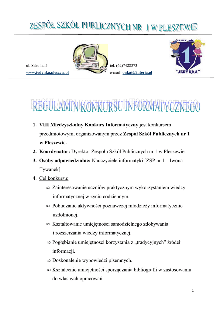 ul. Szkolna 5 tel. (62)7428373 www.jedynka.pleszew.pl e-mail: [email protected] 1. VIII Międzyszkolny Konkurs Informatyczny jest konkursem przedmiotowym, organizowanym przez Zespół Szkół Publicznych nr 1 w Pleszewie. 2. Koordynator: Dyrektor Zespołu Szkół Publicznych nr 1 w Pleszewie. 3. Osoby odpowiedzialne: Nauczyciele informatyki [ZSP nr 1 – Iwona Tywanek] 4. Cel konkursu: • Zainteresowanie uczniów praktycznym wykorzystaniem wiedzy informatycznej w życiu codziennym. • Pobudzanie aktywności poznawczej młodzieży informatycznie uzdolnionej. • Kształtowanie umiejętności samodzielnego zdobywania i rozszerzania wiedzy informatycznej. • Pogłębianie umiejętności korzystania z „tradycyjnych” źródeł informacji. • Doskonalenie wypowiedzi pisemnych. • Kształcenie umiejętności sporządzania bibliografii w zastosowaniu do własnych opracowań. 1 • Motywowanie uczniów do samodzielnego poszerzania wiedzy i zdobywania nowych umiejętności • Stwarzanie młodzieży możliwości współzawodnictwa. • Stworzenie warunków nauczycielom informatyki do twórczej pracy z młodzieżą. 5. Organizacja konkursu: • Konkurs jest przeprowadzany w ZSP nr 1 w Pleszewie • Konkurs jest przeznaczony dla uczniów szkół podstawowych i gimnazjalnych. • Konkurs odbywa się w jednym etapie. 6. Przebieg konkursu: GIMNAZJUM: • Przygotowanie strony internetowej na temat: „Polska prezydencja w Unii Europejskiej”. Walory turystyczne i kulturowe wybranego regionu geograficznego, np. regionu zamieszkania. Budowa i funkcjonowanie organizmu człowieka. Wybrane regiony świata. Sąsiedzi Polski. SZKOŁA PODSTAWOWA: • Multimedialny przekaz w programie Windows Movie Maker lub Microsoft PowerPoint: Mistrzostwa Europy w Piłce Nożnej „Euro 2012”. Polska Pierwszych Piastów. Wielkie odkrycia geograficzne, m.in.: wyprawy Krzysztofa Kolumba. Figury płaskie - pola i obwody. 2 7. Prace nadesłane na konkurs nie mogą być powieleniem prac już wcześniej nagrodzonych lub wyróżnionych oraz nie mogą naruszać praw autorskich osób trzecich. 8. Praca powinna być wykonana samodzielnie przez ucznia, udział indywidualny. 9. Zgłoszenie prac konkursowych upływa z dniem 16 kwietnia 2012 roku. 10.Prace należy dostarczyć osobiście składając u organizatora konkursu Iwony Tywanek lub wysłać odpowiednio wcześniej na adres szkoły z dopiskiem "Konkurs informatyczny". 11.Zgłoszenie powinno zawierać: imię i nazwisko ucznia, klasę, nazwę szkoły i nazwisko opiekuna. (załącznik nr 1) 12. Nagrody: Ogłoszenie wyników i wręczenie nagród oraz prezentacja przez autorów nagrodzonych prac odbędzie się dnia 15 maja 2012 roku o godzinie 1200 w auli szkoły. Nagrody otrzymają prace, które zajmą trzy pierwsze miejsca. Pozostałe ciekawsze prace mogą zostać wyróżnione. 13. Kryteria oceny prac: pomysłowość autora poprawność techniczna poprawność merytoryczna łatwość obsługi zastosowane środki wyrazu (film, dźwięk, obrazy) estetyka wykonania (łącznie z estetyką opakowania prezentacji) krótki opis pracy, wymagania techniczne i programowe. Serdecznie zapraszamy!!!! 3