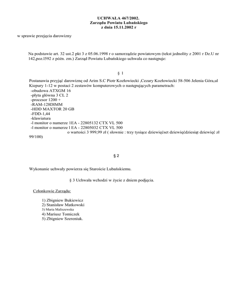 UCHWAŁA 467/2002. Zarządu Powiatu Lubańskiego z dnia 15.11.2002 r w sprawie przejęcia darowizny Na podstawie art. 32 ust.2 pkt 3 z 05.06.1998 r o samorządzie powiatowym (tekst jednolity z 2001 r Dz.U nr 142,poz.l592 z póżn. zm.) Zarząd Powiatu Lubańskiego uchwala co następuje: § l Postanawia przyjąć darowiznę od Arim S.C Piotr Kozłowiecki ,Cezary Kozłowiecki 58-506 Jelenia Góra,ul Kiepury 1-12 w postaci 2 zestawów komputerowych o następujących parametrach: -obudowa ATXGM 16 -płyta główna 3 CL 2 -procesor 1200 + -RAM-128DIMM -HDD MAXTOR 20 GB -FDD-1,44 -klawiatura -l monitor o numerze 1EA - 22805132 CTX VL 500 -l monitor o numerze l EA - 22805032 CTX VL 500 o wartości 3 999,99 zł ( słownie : trzy tysiące dziewięćset dziewięćdziesiąt dziewięć zł 99/100) §2 Wykonanie uchwały powierza się Staroście Lubańskiemu. § 3 Uchwała wchodzi w życie z dniem podjęcia. Członkowie Zarządu: 1) Zbigniew Bukiewicz 2) Stanisław Matkowski 3) Maria Maliszewska 4) Mariusz Tomiczek 5) Zbigniew Szereniuk.