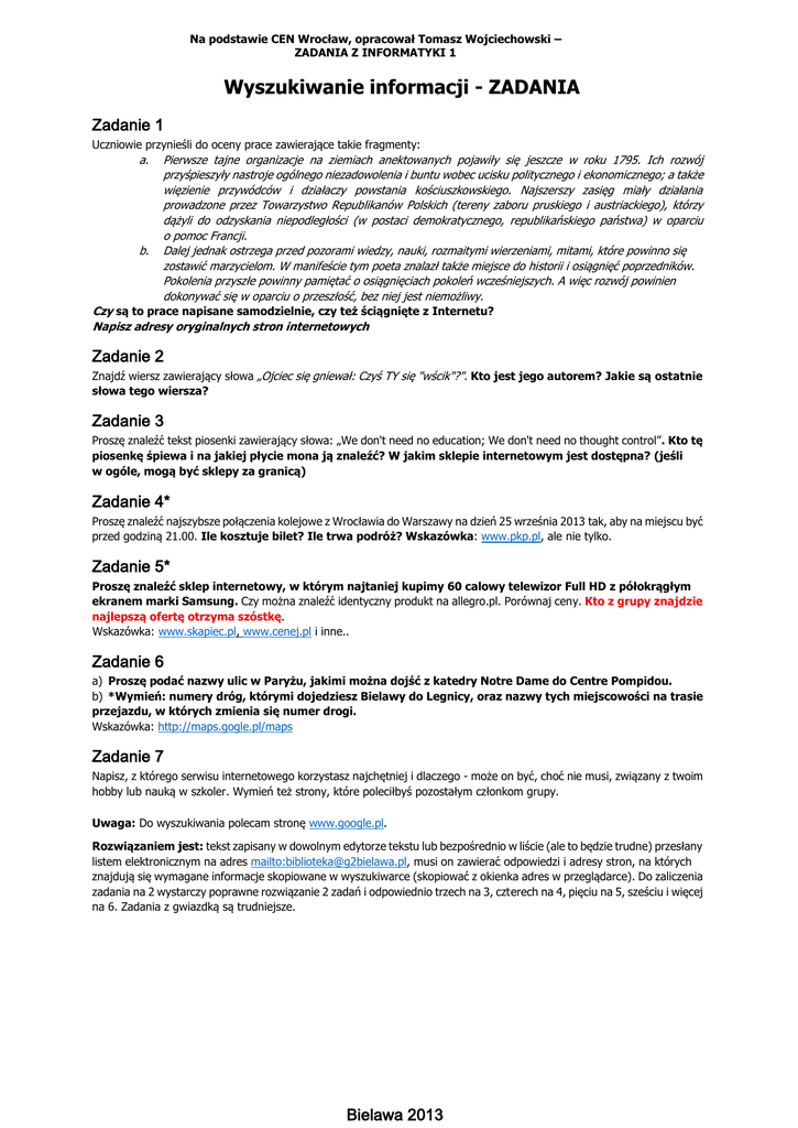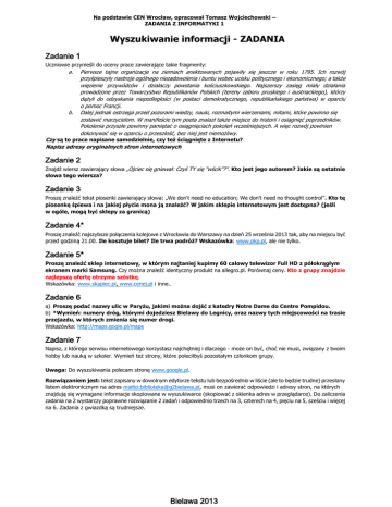 Na podstawie CEN Wrocław, opracował Tomasz Wojciechowski – ZADANIA Z INFORMATYKI 1 Wyszukiwanie informacji - ZADANIA Zadanie 1 Uczniowie przynieśli do oceny prace zawierające takie fragmenty: a. b. Pierwsze tajne organizacje na ziemiach anektowanych pojawiły się jeszcze w roku 1795. Ich rozwój przyśpieszyły nastroje ogólnego niezadowolenia i buntu wobec ucisku politycznego i ekonomicznego; a także więzienie przywódców i działaczy powstania kościuszkowskiego. Najszerszy zasięg miały działania prowadzone przez Towarzystwo Republikanów Polskich (tereny zaboru pruskiego i austriackiego), którzy dążyli do odzyskania niepodległości (w postaci demokratycznego, republikańskiego państwa) w oparciu o pomoc Francji. Dalej jednak ostrzega przed pozorami wiedzy, nauki, rozmaitymi wierzeniami, mitami, które powinno się zostawić marzycielom. W manifeście tym poeta znalazł także miejsce do historii i osiągnięć poprzedników. Pokolenia przyszłe powinny pamiętać o osiągnięciach pokoleń wcześniejszych. A więc rozwój powinien dokonywać się w oparciu o przeszłość, bez niej jest niemożliwy. Czy są to prace napisane samodzielnie, czy też ściągnięte z Internetu? Napisz adresy oryginalnych stron internetowych Zadanie 2 Znajdź wiersz zawierający słowa „Ojciec się gniewał: Czyś TY się "wścik"?". Kto jest jego autorem? Jakie są ostatnie słowa tego wiersza? Zadanie 3 Proszę znaleźć tekst piosenki zawierający słowa: „We don't need no education; We don't need no thought control”. Kto tę piosenkę śpiewa i na jakiej płycie mona ją znaleźć? W jakim sklepie internetowym jest dostępna? (jeśli w ogóle, mogą być sklepy za granicą) Zadanie 4* Proszę znaleźć najszybsze połączenia kolejowe z Wrocławia do Warszawy na dzień 25 września 2013 tak, aby na miejscu być przed godziną 21.00. Ile kosztuje bilet? Ile trwa podróż? Wskazówka: www.pkp.pl, ale nie tylko. Zadanie 5* Proszę znaleźć sklep internetowy, w którym najtaniej kupimy 60 calowy telewizor Full HD z półokrągłym ekranem marki Samsung. Czy można znaleźć identyczny produkt na allegro.pl. Porównaj ceny. Kto z grupy znajdzie najlepszą ofertę otrzyma szóstkę. Wskazówka: www.skapiec.pl, www.cenej.pl i inne.. Zadanie 6 a) Proszę podać nazwy ulic w Paryżu, jakimi można dojść z katedry Notre Dame do Centre Pompidou. b) *Wymień: numery dróg, którymi dojedziesz Bielawy do Legnicy, oraz nazwy tych miejscowości na trasie przejazdu, w których zmienia się numer drogi. Wskazówka: http://maps.gogle.pl/maps Zadanie 7 Napisz, z którego serwisu internetowego korzystasz najchętniej i dlaczego - może on być, choć nie musi, związany z twoim hobby lub nauką w szkoler. Wymień też strony, które poleciłbyś pozostałym członkom grupy. Uwaga: Do wyszukiwania polecam stronę www.google.pl. Rozwiązaniem jest: tekst zapisany w dowolnym edytorze tekstu lub bezpośrednio w liście (ale to będzie trudne) przesłany listem elektronicznym na adres mailto:[email protected], musi on zawierać odpowiedzi i adresy stron, na których znajdują się wymagane informacje skopiowane w wyszukiwarce (skopiować z okienka adres w przeglądarce). Do zaliczenia zadania na 2 wystarczy poprawne rozwiązanie 2 zadań i odpowiednio trzech na 3, czterech na 4, pięciu na 5, sześciu i więcej na 6. Zadania z gwiazdką są trudniejsze. Bielawa 2013