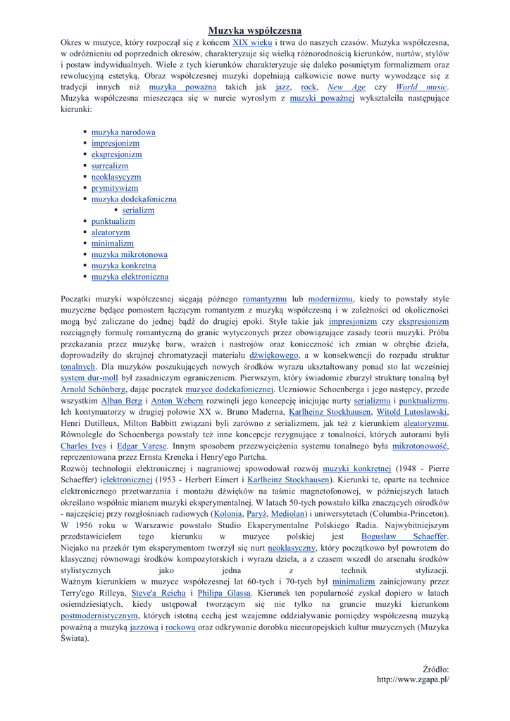 Muzyka współczesna Okres w muzyce, który rozpoczął się z końcem XIX wieku i trwa do naszych czasów. Muzyka współczesna, w odróżnieniu od poprzednich okresów, charakteryzuje się wielką różnorodnością kierunków, nurtów, stylów i postaw indywidualnych. Wiele z tych kierunków charakteryzuje się daleko posuniętym formalizmem oraz rewolucyjną estetyką. Obraz współczesnej muzyki dopełniają całkowicie nowe nurty wywodzące się z tradycji innych niż muzyka poważna takich jak jazz, rock, New Age czy World music. Muzyka współczesna mieszcząca się w nurcie wyrosłym z muzyki poważnej wykształciła następujące kierunki: muzyka narodowa impresjonizm ekspresjonizm surrealizm neoklasycyzm prymitywizm muzyka dodekafoniczna serializm punktualizm aleatoryzm minimalizm muzyka mikrotonowa muzyka konkretna muzyka elektroniczna Początki muzyki współczesnej sięgają późnego romantyzmu lub modernizmu, kiedy to powstały style muzyczne będące pomostem łączącym romantyzm z muzyką współczesną i w zależności od okoliczności mogą być zaliczane do jednej bądź do drugiej epoki. Style takie jak impresjonizm czy ekspresjonizm rozciągnęły formułę romantyczną do granic wytyczonych przez obowiązujące zasady teorii muzyki. Próba przekazania przez muzykę barw, wrażeń i nastrojów oraz konieczność ich zmian w obrębie dzieła, doprowadziły do skrajnej chromatyzacji materiału dźwiękowego, a w konsekwencji do rozpadu struktur tonalnych. Dla muzyków poszukujących nowych środków wyrazu ukształtowany ponad sto lat wcześniej system dur-moll był zasadniczym ograniczeniem. Pierwszym, który świadomie zburzył strukturę tonalną był Arnold Schönberg, dając początek muzyce dodekafonicznej. Uczniowie Schoenberga i jego następcy, przede wszystkim Alban Berg i Anton Webern rozwinęli jego koncepcję inicjując nurty serializmu i punktualizmu. Ich kontynuatorzy w drugiej połowie XX w. Bruno Maderna, Karlheinz Stockhausen, Witold Lutosławski, Henri Dutilleux, Milton Babbitt związani byli zarówno z serializmem, jak też z kierunkiem aleatoryzmu. Równolegle do Schoenberga powstały też inne koncepcje rezygnujące z tonalności, których autorami byli Charles Ives i Edgar Varese. Innym sposobem przezwyciężenia systemu tonalnego była mikrotonowość, reprezentowana przez Ernsta Kreneka i Henry'ego Partcha. Rozwój technologii elektronicznej i nagraniowej spowodował rozwój muzyki konkretnej (1948 - Pierre Schaeffer) ielektronicznej (1953 - Herbert Eimert i Karlheinz Stockhausen). Kierunki te, oparte na technice elektronicznego przetwarzania i montażu dźwięków na taśmie magnetofonowej, w późniejszych latach określano wspólnie mianem muzyki eksperymentalnej. W latach 50-tych powstało kilka znaczących ośrodków - najczęściej przy rozgłośniach radiowych (Kolonia, Paryż, Mediolan) i uniwersytetach (Columbia-Princeton). W 1956 roku w Warszawie powstało Studio Eksperymentalne Polskiego Radia. Najwybitniejszym przedstawicielem tego kierunku w muzyce polskiej jest Bogusław Schaeffer. Niejako na przekór tym eksperymentom tworzył się nurt neoklasyczny, który początkowo był powrotem do klasycznej równowagi środków kompozytorskich i wyrazu dzieła, a z czasem wszedł do arsenału środków stylistycznych jako jedna z technik stylizacji. Ważnym kierunkiem w muzyce współczesnej lat 60-tych i 70-tych był minimalizm zainicjowany przez Terry'ego Rilleya, Steve'a Reicha i Philipa Glassa. Kierunek ten popularność zyskał dopiero w latach osiemdziesiątych, kiedy ustępował tworzącym się nie tylko na gruncie muzyki kierunkom postmodernistycznym, których istotną cechą jest wzajemne oddziaływanie pomiędzy współczesną muzyką poważną a muzyką jazzową i rockową oraz odkrywanie dorobku nieeuropejskich kultur muzycznych (Muzyka Świata). Źródło: http://www.zgapa.pl/