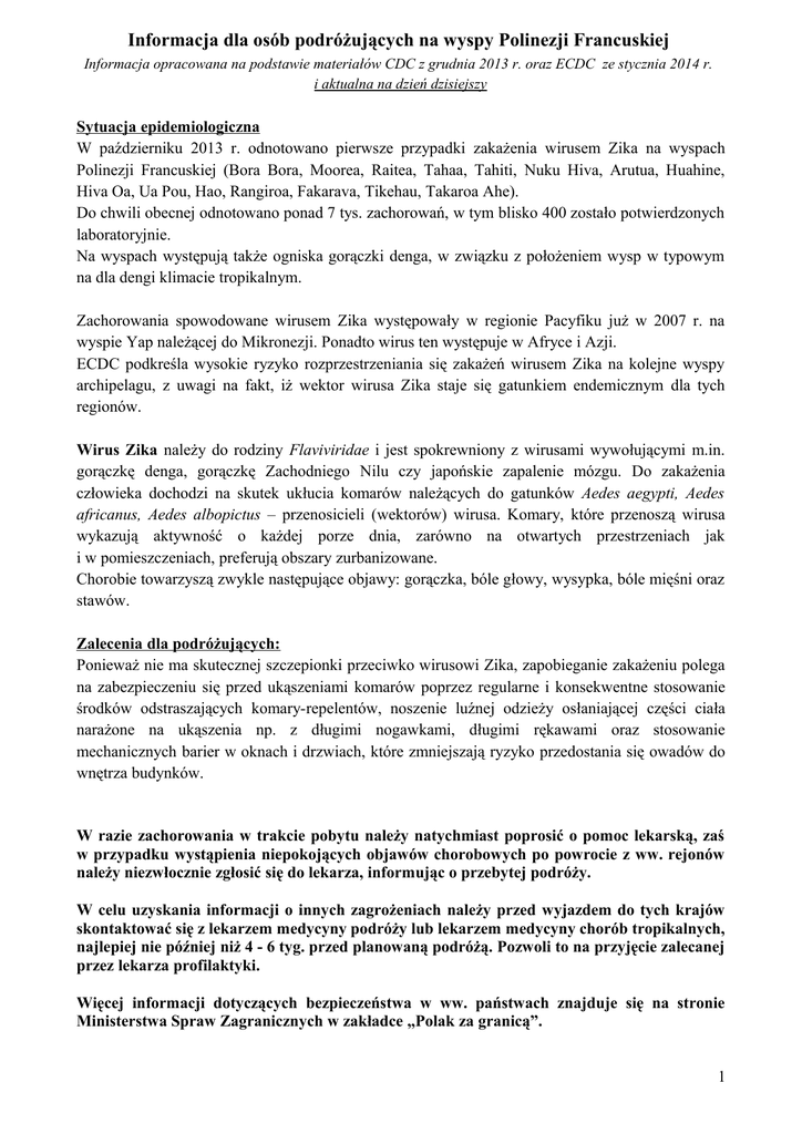 Informacja dla osób podróżujących na wyspy Polinezji Francuskiej Informacja opracowana na podstawie materiałów CDC z grudnia 2013 r. oraz ECDC ze stycznia 2014 r. i aktualna na dzień dzisiejszy Sytuacja epidemiologiczna W październiku 2013 r. odnotowano pierwsze przypadki zakażenia wirusem Zika na wyspach Polinezji Francuskiej (Bora Bora, Moorea, Raitea, Tahaa, Tahiti, Nuku Hiva, Arutua, Huahine, Hiva Oa, Ua Pou, Hao, Rangiroa, Fakarava, Tikehau, Takaroa Ahe). Do chwili obecnej odnotowano ponad 7 tys. zachorowań, w tym blisko 400 zostało potwierdzonych laboratoryjnie. Na wyspach występują także ogniska gorączki denga, w związku z położeniem wysp w typowym na dla dengi klimacie tropikalnym. Zachorowania spowodowane wirusem Zika występowały w regionie Pacyfiku już w 2007 r. na wyspie Yap należącej do Mikronezji. Ponadto wirus ten występuje w Afryce i Azji. ECDC podkreśla wysokie ryzyko rozprzestrzeniania się zakażeń wirusem Zika na kolejne wyspy archipelagu, z uwagi na fakt, iż wektor wirusa Zika staje się gatunkiem endemicznym dla tych regionów. Wirus Zika należy do rodziny Flaviviridae i jest spokrewniony z wirusami wywołującymi m.in. gorączkę denga, gorączkę Zachodniego Nilu czy japońskie zapalenie mózgu. Do zakażenia człowieka dochodzi na skutek ukłucia komarów należących do gatunków Aedes aegypti, Aedes africanus, Aedes albopictus – przenosicieli (wektorów) wirusa. Komary, które przenoszą wirusa wykazują aktywność o każdej porze dnia, zarówno na otwartych przestrzeniach jak i w pomieszczeniach, preferują obszary zurbanizowane. Chorobie towarzyszą zwykle następujące objawy: gorączka, bóle głowy, wysypka, bóle mięśni oraz stawów. Zalecenia dla podróżujących: Ponieważ nie ma skutecznej szczepionki przeciwko wirusowi Zika, zapobieganie zakażeniu polega na zabezpieczeniu się przed ukąszeniami komarów poprzez regularne i konsekwentne stosowanie środków odstraszających komary-repelentów, noszenie luźnej odzieży osłaniającej części ciała narażone na ukąszenia np. z długimi nogawkami, długimi rękawami oraz stosowanie mechanicznych barier w oknach i drzwiach, które zmniejszają ryzyko przedostania się owadów do wnętrza budynków. W razie zachorowania w trakcie pobytu należy natychmiast poprosić o pomoc lekarską, zaś w przypadku wystąpienia niepokojących objawów chorobowych po powrocie z ww. rejonów należy niezwłocznie zgłosić się do lekarza, informując o przebytej podróży. W celu uzyskania informacji o innych zagrożeniach należy przed wyjazdem do tych krajów skontaktować się z lekarzem medycyny podróży lub lekarzem medycyny chorób tropikalnych, najlepiej nie później niż 4 - 6 tyg. przed planowaną podróżą. Pozwoli to na przyjęcie zalecanej przez lekarza profilaktyki. Więcej informacji dotyczących bezpieczeństwa w ww. państwach znajduje się na stronie Ministerstwa Spraw Zagranicznych w zakładce „Polak za granicą”. 1