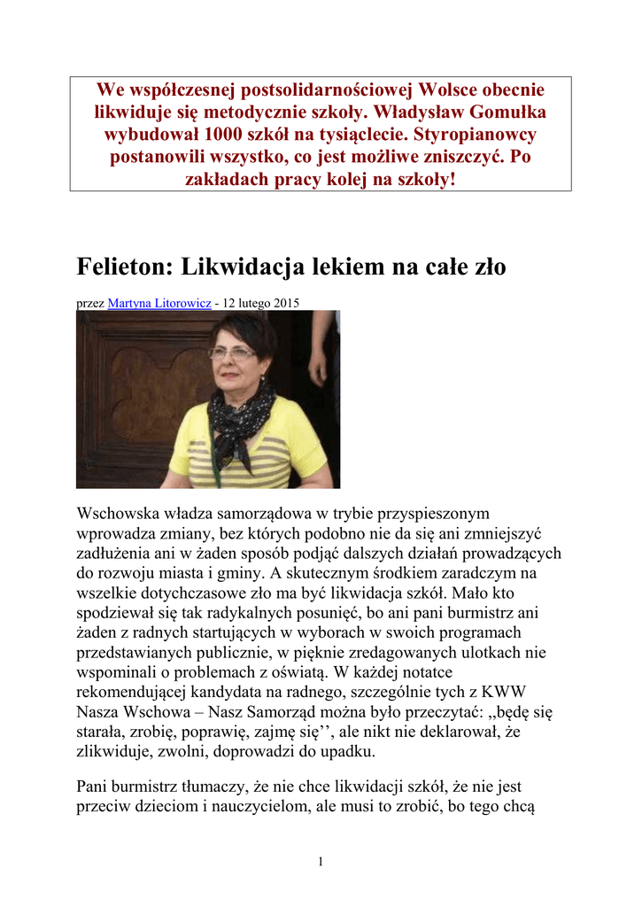 We współczesnej postsolidarnościowej Wolsce obecnie likwiduje się metodycznie szkoły. Władysław Gomułka wybudował 1000 szkół na tysiąclecie. Styropianowcy postanowili wszystko, co jest możliwe zniszczyć. Po zakładach pracy kolej na szkoły! Felieton: Likwidacja lekiem na całe zło przez Martyna Litorowicz - 12 lutego 2015 Wschowska władza samorządowa w trybie przyspieszonym wprowadza zmiany, bez których podobno nie da się ani zmniejszyć zadłużenia ani w żaden sposób podjąć dalszych działań prowadzących do rozwoju miasta i gminy. A skutecznym środkiem zaradczym na wszelkie dotychczasowe zło ma być likwidacja szkół. Mało kto spodziewał się tak radykalnych posunięć, bo ani pani burmistrz ani żaden z radnych startujących w wyborach w swoich programach przedstawianych publicznie, w pięknie zredagowanych ulotkach nie wspominali o problemach z oświatą. W każdej notatce rekomendującej kandydata na radnego, szczególnie tych z KWW Nasza Wschowa – Nasz Samorząd można było przeczytać: ,,będę się starała, zrobię, poprawię, zajmę się’’, ale nikt nie deklarował, że zlikwiduje, zwolni, doprowadzi do upadku. Pani burmistrz tłumaczy, że nie chce likwidacji szkół, że nie jest przeciw dzieciom i nauczycielom, ale musi to zrobić, bo tego chcą 1 radni. Nie wiadomo czy radni chcą, ale pewne jest, że sami nie wymyślili pozbycia się w taki sposób kłopotu finansowego miasta. Możliwe, że i pomysłodawcą nie była pani burmistrz. Tym bardziej, że wielu z nas dobrze pamięta ostatni numer (listopad 2014) gazetki propagandowej SOS ,,Nasze Wschowskie Sprawy” wydany przed drugą turą wyborów, gdzie pod takim tytułem: ,,Kłamstwa, oszczerstwa, brudna gra‘’ pani Danuta Patalas dementuje plotki: ,,Uprzedzaliśmy naszych wyborców, że w drugiej turze zapanuje istne szaleństwo i tak się dzieje. Kłamstw i oszczerstw pod moim adresem rozpowszechnianych plotkami i w internecie już nie nadążamy notować. Dowiedziałam się, że będę zdejmować krzyże w szkołach, że będę likwidować szkoły, a pierwszą w Lginiu, że będziemy wyrzucać na bruk ludzi w spółce komunalnej, w ratuszu i we wszystkich podległych burmistrzowi instytucjach. To nie wszystko. Przeze mnie pracę stracą nie tylko nauczyciele, a nawet sprzątaczki w szkołach ‘’. Ostatnie wydarzenia pokazują, że albo plotki nie były bezpodstawne albo pani burmistrz rzeczywiście nie wiedziała, że będzie likwidowała szkoły, biuro promocji, zwalniała nauczycieli i sprzątaczki a nawet wyrzucała na bruk zarząd spółki komunalnej. Dlatego tłumaczenia i argumenty, że ekonomia jest nieubłagana, że miasto jest biedne i nie stać je na utrzymywanie szkół, że jest zadłużone i grozi mu bankructwo, że nie ma dzieci, nie są wiarygodne ani zrozumiałe. I nie tylko dla dzieci, młodzieży, nauczycieli, rodziców, ale także dla bardzo wielu mieszkańców, którzy uwierzyli zapewnieniom pani burmistrz. Już chyba każdy wie albo się domyśla, że próba likwidacji szkół i inne dotychczasowe posunięcia to decyzje pana wiceburmistrza Miłosza Czopka. To on pracował wcześniej w urzędzie i radzie miejskiej i doskonale wiedział na jaką kwotę zadłużone jest miasto. Nie wiadomo czy to hipokryzja, manipulacja czy zwykłe przeoczenie, że przed wyborami szef kampanii wyborczej nie poinformował kandydatów na radnych oraz pretendentkę do fotela burmistrza, że po zdobyciu władzy pierwszą rzeczą do wykonania – oczywiście w imię ratowania miasta i gminy przed bankructwem – będzie likwidacja tego, co było a dopiero potem zabiorą się za budowanie i doprowadzanie do rozwoju. Niewiedza, bezradność a może brak doświadczenia radnych były widoczne w momencie kiedy otrzymali uchwałę w sprawie zamiaru 2 likwidacji Gimnazjum Nr 1. Zdziwieni (radny Giezek był nawet w szoku), posłuszni jak małe dzieci bez dyskusji podnieśli rękę za tym, co im przygotował wiceburmistrz i – obecnie najważniejszy w Ratuszu – naczelnik Wydziału Spraw Organizacyjnych i Społecznych. Ta decyzja wywołała ogromne emocje, podzieliła mieszkańców, rozpętała walkę słowną między zwolennikami a przeciwnikami. Padło już wiele gorzkich słów, pouczeń a nawet oskarżeń. Pewni swojej nieomylności pomysłodawcy i zwolennicy likwidacji gimnazjum, zaślepieni prawami ekonomii nie widzą problemu z przesunięciem, niczym pionki na szachownicy, młodzieży do innej szkoły. Nie martwią się, że wszyscy pracownicy obsługi i większość nauczycieli straci pracę, bo to już nie ich problem – szukanie komuś zatrudnienia (szczególnie tym, którzy nie zamieszkują w naszej gminie). Mają dla nich jedną radę – zawsze przecież można założyć szkołę niepubliczną i tam realizować swoje marzenia o pracy nauczyciela. Wiejskim placówkom pozwolono łaskawie funkcjonować przez rok, ale postawiono przed nimi zadanie niemal niewykonalne – zmniejszyć koszty utrzymania. Czy szkoły mają się zamienić w gospodarstwa rolne, zakłady rzemieślnicze i fabryki, tak jak w Bangladeszu, gdzie dzieci szyją dla nas ubrania? Czy szkoły muszą się samofinansować, bo ci, do których należy to zadanie są zbyt biedni? Choć pomysłodawcy likwidacji gimnazjum nie powiedzieli tego głośno, to ich zwolennicy nie ukrywają, że to właśnie nauczyciele, a dokładnie ich wynagrodzenia, są powodem wielkiej dziury budżetowej. Mało tego, wyjątkowi cynicy mają ogromną satysfakcję, że nauczyciele (i inni pracownicy już zwolnieni albo żyjący w stresie i niepewności, kto następny) zostaną bez pracy. Trudno oprzeć się stwierdzeniu, że plany likwidacji gimnazjum dały niektórym mieszkańcom okazję do ataku na nauczycieli, do bezkarnego upokarzania ich, wytykania błędów i pouczania, że nie mają prawa walczyć o swoje miejsca pracy. Jak dotąd nikt nie jest w stanie określić wymiernych zysków jakie ma przynieść za-mknięcie gimnazjum. Str