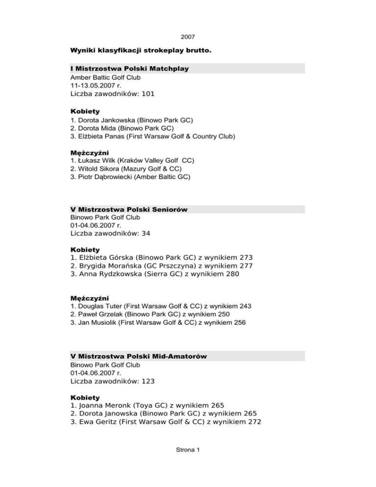 2007 Wyniki klasyfikacji strokeplay brutto. I Mistrzostwa Polski Matchplay Amber Baltic Golf Club 11-13.05.2007 r. Liczba zawodników: 101 Kobiety 1. Dorota Jankowska (Binowo Park GC) 2. Dorota Mida (Binowo Park GC) 3. Elżbieta Panas (First Warsaw Golf & Country Club) Mężczyźni 1. Łukasz Wilk (Kraków Valley Golf CC) 2. Witold Sikora (Mazury Golf & CC) 3. Piotr Dąbrowiecki (Amber Baltic GC) V Mistrzostwa Polski Seniorów Binowo Park Golf Club 01-04.06.2007 r. Liczba zawodników: 34 Kobiety 1. Elżbieta Górska (Binowo Park GC) z wynikiem 273 2. Brygida Morańska (GC Prszczyna) z wynikiem 277 3. Anna Rydzkowska (Sierra GC) z wynikiem 280 Mężczyźni 1. Douglas Tuter (First Warsaw Golf & CC) z wynikiem 243 2. Paweł Grzelak (Binowo Park GC) z wynikiem 250 3. Jan Musiolik (First Warsaw Golf & CC) z wynikiem 256 V Mistrzostwa Polski Mid-Amatorów Binowo Park Golf Club 01-04.06.2007 r. Liczba zawodników: 123 Kobiety 1. Joanna Meronk (Toya GC) z wynikiem 265 2. Dorota Janowska (Binowo Park GC) z wynikiem 265 3. Ewa Geritz (First Warsaw Golf & CC) z wynikiem 272 Strona 1 2007 Mężczyźni 1. Timothy Hyland (First Warsaw Golf & Country Club) z wynikiem 234 2. Piotr Robełek (First Warsaw Golf & CC) z wynikiem 237 3. Radosław Kanas (Binowo Park GC) z wynikiem 244 XIII Mistrzostwa Polski Juniorów First Warsaw Golf & Country Club 25-26.06.2007 r. Liczba zawodników: 54 Juniorzy starsi 1. Mateusz Jędrzejczyk (First Warsaw Golf & CC) z wynikiem 144 2. Robin Kokociński (Eslov GK) z wynikiem 150 3. Jakub Żelazny (Binowo Park GC) z wynikiem 152 Juniorzy młodsi 1. Piotr Ragankiewicz (First Wrocław GC) z wynikiem 157 2. Adrian Meronk (KG Toya) z wynikiem 160 3. Michał Karczmarczyk (Tokary GC) z wynikiem 164 XIII Międzynarodowe Mistrzostwa Polski Mężczyzn Toya Golf & Country Club 29.06-02.07.2007 r. Liczba zawodników: 137 ZWYCIĘZCY 1. Stanislav Matus (Prosper GC Celadna) z wynikiem 209 2. Maksymilian Sałuda (Binowo Park GC) z wynikiem 214 3. James Jankowski (Potters Bar GC) z wynikiem 218 III Międzynarodowe Mistrzostwa Polski Kobiet First Warsaw Golf & Country Club 04-05.08.2007 r. Liczba zawodniczek: 72 ZWYCIĘŻCZYNIE 1. Sandra Jantova (Zamecku GC Kravare) z wynikiem161 2. Martyna Mierzwa (Panorama GC) z wynikiem 162 3. Lucie Hinnerova (Prosper GC Celadna) z wynikiem 169 Strona 2 2007 XI Polish Open Postołowo Golf Club 06-09.09.2007 r. Liczba zawodników: 105 ZWYCIĘZCY 1. Taco Remkes (EPD Tour) z wynikiem 278 2. Damian Urlich (GC Ennetsee) z wynikiem 279 3. Tobias Schwartzer (EPD Tour) z wynikiem 282 VI Klubowe Mistrzostwa Polski Mazury Golf & Country Club 30.08-01.09.2007 r. Liczba drużyn: brak danych ZWYCIĘZCY 1. Klub Golfowy Toya A 2. Binowo Park Golf Club A 3. Kraków Valley Golf Club A 4. First Warsaw Golf & Country Club A III PZG Masters Rosa Private Golf Club 12-14.10.2007 r. Liczba zawodników: 89 Kobiety 1. Martyna Mierzwa (Panorama GC)) z wynikiem 234 2. Dorota Mida (Binowo Park GC) z wynikiem 279 3. Ewa Geritz (First Warsaw Golf & CC) z wynikiem 286 Mężczyźni 1. Tomasz Pulsakowski (KG Toya) z wynikiem 232 2. Maksymilian Sałuda (Binowo Park GC) 233 3. Michał Kasprowicz (KG Toya) z wynikiem 236 Strona 3