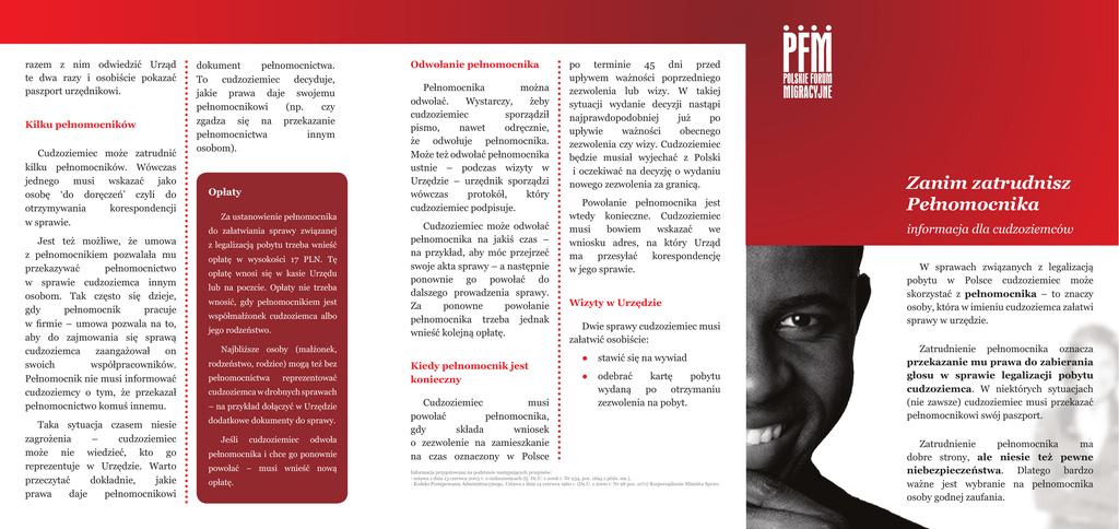 razem z nim odwiedzić Urząd te dwa razy i osobiście pokazać paszport urzędnikowi. Kilku pełnomocników Cudzoziemiec może zatrudnić kilku pełnomocników. Wówczas jednego musi wskazać jako osobę ‘do doręczeń’ czyli do otrzymywania korespondencji w sprawie. Jest też możliwe, że umowa z pełnomocnikiem pozwalała mu przekazywać pełnomocnictwo w sprawie cudzoziemca innym osobom. Tak często się dzieje, gdy pełnomocnik pracuje w firmie – umowa pozwala na to, aby do zajmowania się sprawą cudzoziemca zaangażował on swoich współpracowników. Pełnomocnik nie musi informować cudzoziemcy o tym, że przekazał pełnomocnictwo komuś innemu. Taka sytuacja czasem niesie zagrożenia – cudzoziemiec może nie wiedzieć, kto go reprezentuje w Urzędzie. Warto przeczytać dokładnie, jakie prawa daje pełnomocnikowi dokument pełnomocnictwa. To cudzoziemiec decyduje, jakie prawa daje swojemu pełnomocnikowi (np. czy zgadza się na przekazanie pełnomocnictwa innym osobom). Opłaty Za ustanowienie pełnomocnika do załatwiania sprawy związanej z legalizacją pobytu trzeba wnieść opłatę w wysokości 17 PLN. Tę opłatę wnosi się w kasie Urzędu lub na poczcie. Opłaty nie trzeba wnosić, gdy pełnomocnikiem jest współmałżonek cudzoziemca albo jego rodzeństwo. Odwołanie pełnomocnika Pełnomocnika można odwołać. Wystarczy, żeby cudzoziemiec sporządził pismo, nawet odręcznie, że odwołuje pełnomocnika. Może też odwołać pełnomocnika ustnie – podczas wizyty w Urzędzie – urzędnik sporządzi wówczas protokół, który cudzoziemiec podpisuje. Cudzoziemiec może odwołać pełnomocnika na jakiś czas – na przykład, aby móc przejrzeć swoje akta sprawy – a następnie ponownie go powołać do dalszego prowadzenia sprawy. Za ponowne powołanie pełnomocnika trzeba jednak wnieść kolejną opłatę. Najbliższe osoby (małżonek, rodzeństwo, rodzice) mogą też bez pełnomocnictwa reprezentować cudzoziemca w drobnych sprawach – na przykład dołączyć w Urzędzie dodatkowe dokumenty do sprawy. Jeśli cudzoziemiec odwoła pełnomocnika i chce go ponownie powołać – musi wnieść nową opłatę. Kiedy pełnomocnik jest konieczny Cudzoziemiec musi powołać pełnomocnika, gdy składa wniosek o zezwolenie na zamieszkanie na czas oznaczony w Polsce po terminie 45 dni przed upływem ważności poprzedniego zezwolenia lub wizy. W takiej sytuacji wydanie decyzji nastąpi najprawdopodobniej już po upływie ważności obecnego zezwolenia czy wizy. Cudzoziemiec będzie musiał wyjechać z Polski i oczekiwać na decyzję o wydaniu nowego zezwolenia za granicą. Powołanie pełnomocnika jest wtedy konieczne. Cudzoziemiec musi bowiem wskazać we wniosku adres, na który Urząd ma przesyłać korespondencję w jego sprawie. Wizyty w Urzędzie Dwie sprawy cudzoziemiec musi załatwić osobiście: ●● stawić się na wywiad ●● odebrać kartę pobytu wydaną po otrzymaniu zezwolenia na pobyt. Informacja przygotowana na podstawie następujących przepisów: - ustawa z dnia 13 czerwca 2003 r. o cudzoziemcach (tj. Dz.U. z 2006 r. Nr 234, poz. 1694 z późn. zm.), - Kodeks Postępowania Administracyjnego, Ustawa z dnia 14 czerwca 1960 r. (Dz.U. z 2000 r. Nr 98 poz. 1071) Rozporządzenie Ministra Spraw. Zanim zatrudnisz Pełnomocnika informacja dla cudzoziemców W sprawach związanych z legalizacją pobytu w Polsce cudzoziemiec może skorzystać z pełnomocnika – to znaczy osoby, która w imieniu cudzoziemca załatwi sprawy w urzędzie. Zatrudnienie pełnomocnika oznacza przekazanie mu prawa do zabierania głosu w sprawie legalizacji pobytu cudzoziemca. W niektórych sytuacjach (nie zawsze) cudzoziemiec musi przekazać pełnomocnikowi swój paszport. Zatrudnienie pełnomocnika ma dobre strony, ale niesie też pewne niebezpieczeństwa. Dlatego bardzo ważne jest wybranie na pełnomocnika osoby godnej zaufania. Jak powołać pełnomocnika? Pełnomocnika powołuje się pisząc w tej sprawie pismo. Określa ono, w jakich sprawach i przez jaki czas pełnomocnik może reprezentować cudzoziemca. Dokument nie musi być potwierdzony notarialnie. Cudzoziemiec może też powołać pełnomocnika ustnie, w czasie wizyty w Urzędzie (np. podczas przesłuchania albo przeglądania akt sprawy) – informacja o tym jest wówczas wpisywana do protokołu, który cudzoziemiec podpisuje. pełnomocnik. Możesz mieć ograniczoną możliwość zabierania głosu we własnej sprawie; ●● W niektórych urzędach, gdy masz pełnomocnika, nie możesz przeglądać własnych akt, chyba że cofniesz pełnomocnictwo. Zakres pełnomocnictwa Zalety i wady Zatrudnienie pełnomocnika ma dobre strony, ale niesie też pewne niebezpieczeństwa. Dobre strony: ●● oszczędza czas. Wady: ●● zatrudniając pełnomocnika cudzoziemiec powierza swoje losy innej osobie. Jeśli ●● zatrudnienie pełnomocnika – to koszty. Pamiętaj! ●● To pełnomocnik, nie Ty, otrzymuje od Urzędu korespondencję w Twojej sprawie; ●● w Twoim imieniu w urzędzie wypowiada się Jeśli pełnomocnictwo określa, że pełnomocnik reprezentuje cudzoziemca przed Urzędem Wojewódzkim – wówczas w przypadku potrzeby pisania odwołania do II instancji cudzoziemiec będzie musiał ponownie powołać pełnomocnika (i wnieść kolejną opłatę). Informacja przygotowana przez Fundację Polskie Forum Migracyjne w ramach projektu „Centrum Informacyjne dla Cudzoziemców”. Projekt współfinansowany ze środków Europejskiego Funduszu Integracji Obywateli Państw Trzecich oraz z budżetu Państwa. Paszport Jeśli cudzoziemiec chce, aby pełnomocnik sam załatwiał jego sprawy w urzędzie, musi powierzyć mu swój paszport. Jest on potrzebny dwa razy podczas procedury: w momencie składania wniosku w sprawie legalizacji pobytu, oraz w momencie, gdy w paszport wbijana jest stampila – czyli stempel potwierdzający legalny pobyt w Polsce podczas trwania procedury w sprawie legalizacji pobytu. Jeśli cudzozi