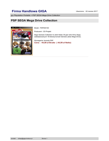 Firma Handlowa GIGA Utworzono : 02 marzec 2017 gry Playstation Portable > PSP SEGA Mega Drive Collection PSP SEGA Mega Drive Collection Model : PSP000100 Producent : CD Projekt Sega Genesis Collection to zbiór blisko 30 gier retro firmy Sega, zadedykowanych 16-bitowej konsoli Genesis (alias Mega Drive). Wymagania: konsola PSP Cena : 44,99 zł Brutto ( 44,99 zł Netto) kontakt : - [email protected] Strona 1