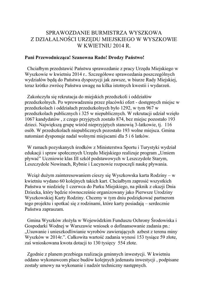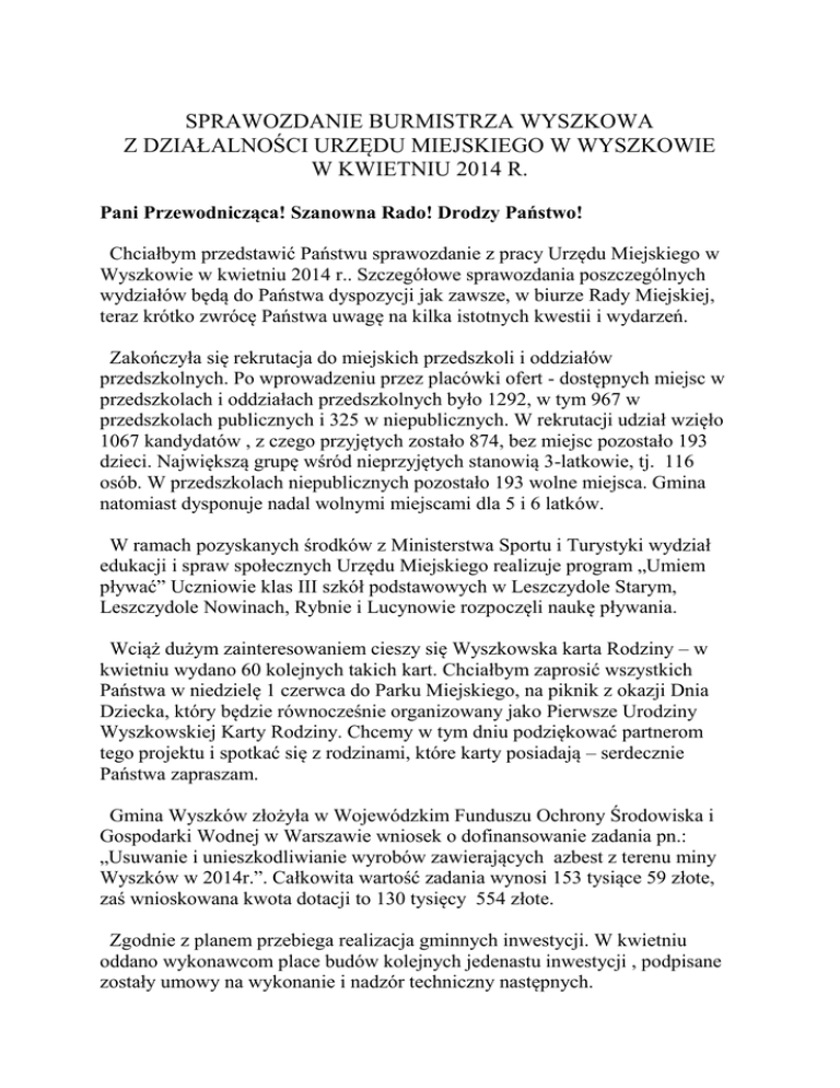 SPRAWOZDANIE BURMISTRZA WYSZKOWA Z DZIAŁALNOŚCI URZĘDU MIEJSKIEGO W WYSZKOWIE W KWIETNIU 2014 R. Pani Przewodnicząca! Szanowna Rado! Drodzy Państwo! Chciałbym przedstawić Państwu sprawozdanie z pracy Urzędu Miejskiego w Wyszkowie w kwietniu 2014 r.. Szczegółowe sprawozdania poszczególnych wydziałów będą do Państwa dyspozycji jak zawsze, w biurze Rady Miejskiej, teraz krótko zwrócę Państwa uwagę na kilka istotnych kwestii i wydarzeń. Zakończyła się rekrutacja do miejskich przedszkoli i oddziałów przedszkolnych. Po wprowadzeniu przez placówki ofert - dostępnych miejsc w przedszkolach i oddziałach przedszkolnych było 1292, w tym 967 w przedszkolach publicznych i 325 w niepublicznych. W rekrutacji udział wzięło 1067 kandydatów , z czego przyjętych zostało 874, bez miejsc pozostało 193 dzieci. Największą grupę wśród nieprzyjętych stanowią 3-latkowie, tj. 116 osób. W przedszkolach niepublicznych pozostało 193 wolne miejsca. Gmina natomiast dysponuje nadal wolnymi miejscami dla 5 i 6 latków. W ramach pozyskanych środków z Ministerstwa Sportu i Turystyki wydział edukacji i spraw społecznych Urzędu Miejskiego realizuje program „Umiem pływać” Uczniowie klas III szkół podstawowych w Leszczydole Starym, Leszczydole Nowinach, Rybnie i Lucynowie rozpoczęli naukę pływania. Wciąż dużym zainteresowaniem cieszy się Wyszkowska karta Rodziny – w kwietniu wydano 60 kolejnych takich kart. Chciałbym zaprosić wszystkich Państwa w niedzielę 1 czerwca do Parku Miejskiego, na piknik z okazji Dnia Dziecka, który będzie równocześnie organizowany jako Pierwsze Urodziny Wyszkowskiej Karty Rodziny. Chcemy w tym dniu podziękować partnerom tego projektu i spotkać się z rodzinami, które karty posiadają – serdecznie Państwa zapraszam. Gmina Wyszków złożyła w Wojewódzkim Funduszu Ochrony Środowiska i Gospodarki Wodnej w Warszawie wniosek o dofinansowanie zadania pn.: „Usuwanie i unieszkodliwianie wyrobów zawierających azbest z terenu miny Wyszków w 2014r.”. Całkowita wartość zadania wynosi 153 tysiące 59 złote, zaś wnioskowana kwota dotacji to 130 tysięcy 554 złote. Zgodnie z planem przebiega realizacja gminnych inwestycji. W kwietniu oddano wykonawcom place budów kolejnych jedenastu inwestycji , podpisane zostały umowy na wykonanie i nadzór techniczny następnych. W środę, 4 czerwca o godzinie 12.00 w Wyszkowskim Ośrodku Kultury „Hutnik” odbędą się uroczystości związane ze Świętem Wolności w Wyszkowie – czyli rocznicą pierwszych wolnych wyborów w demokratycznej Polsce. Będzie to miedzy innymi okazja do spotkania z byłym senatorem I i II kadencji senatu, Panem Janem Chodkowskim. Do udziału w święcie serdecznie wszystkich Państwa Radnych zapraszam i zachęcam. Dziękuję za uwagę!