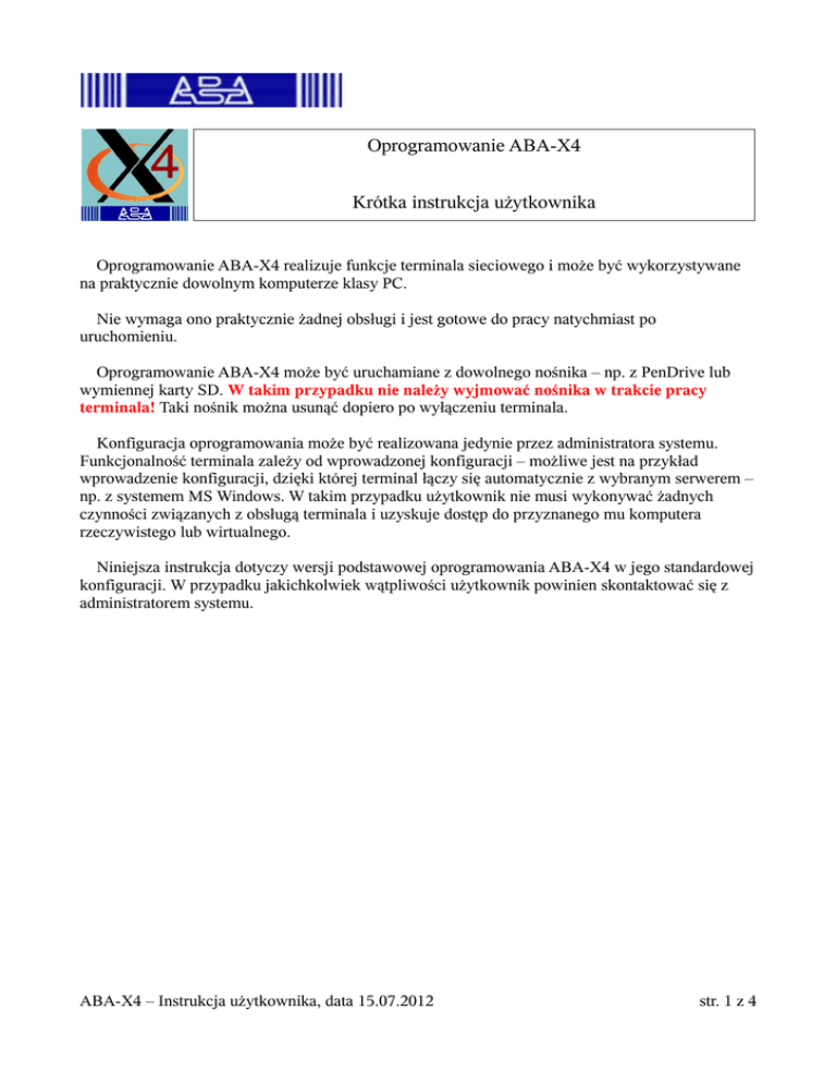 Oprogramowanie ABA-X4 Krótka instrukcja użytkownika Oprogramowanie ABA-X4 realizuje funkcje terminala sieciowego i może być wykorzystywane na praktycznie dowolnym komputerze klasy PC. Nie wymaga ono praktycznie żadnej obsługi i jest gotowe do pracy natychmiast po uruchomieniu. Oprogramowanie ABA-X4 może być uruchamiane z dowolnego nośnika – np. z PenDrive lub wymiennej karty SD. W takim przypadku nie należy wyjmować nośnika w trakcie pracy terminala! Taki nośnik można usunąć dopiero po wyłączeniu terminala. Konfiguracja oprogramowania może być realizowana jedynie przez administratora systemu. Funkcjonalność terminala zależy od wprowadzonej konfiguracji – możliwe jest na przykład wprowadzenie konfiguracji, dzięki której terminal łączy się automatycznie z wybranym serwerem – np. z systemem MS Windows. W takim przypadku użytkownik nie musi wykonywać żadnych czynności związanych z obsługą terminala i uzyskuje dostęp do przyznanego mu komputera rzeczywistego lub wirtualnego. Niniejsza instrukcja dotyczy wersji podstawowej oprogramowania ABA-X4 w jego standardowej konfiguracji. W przypadku jakichkolwiek wątpliwości użytkownik powinien skontaktować się z administratorem systemu. ABA-X4 – Instrukcja użytkownika, data 15.07.2012 str. 1 z 4 Uruchamianie terminala: Terminal uruchamia się automatycznie po włączeniu zasilania. Po załadowaniu oprogramowania jest gotowy do pracy. Czas ładowania oprogramowania zależy wyłącznie od wydajności sprzętu i może wynieść od 10 do kilkudziesięciu sekund. Wyłączanie terminala: Terminal wyłącza się po wybraniu ikonki wyłącznika. Jeśli terminal nie zareaguje (starszy sprzęt) należy użyć wyłącznika sieciowego. Uruchamianie połączenia RDP z serwerem MS Windows lub LINUX: Należy wybrać ikonkę z symbolem zdalnego połączenia z systemem MS Windows. Na ekranie ukaże się okno z wyborem sesji. Należy wybrać właściwą sesję i potwierdzić „przyciskiem” OK. Połączenie z wybranym serwerem zostanie zrealizowane automatycznie. Jeśli wybrany serwer jest niedostępny na ekranie terminala pojawi się okienko informacyjne: Okienko restartu sesji pojawi się także, jeśli połączenie zostanie zakończone przez serwer. Dzieje się tak na przykład, jeśli użytkownik przekroczy dopuszczalny czas zalogowania się do serwera. Naciśnięcie przycisku „OK” spowoduje ponowne nawiązanie połączenia z serwerem. ABA-X4 – Instrukcja użytkownika, data 15.07.2012 str. 2 z 4 Jeśli sesja nie została skonfigurowana przez administratora pojawi się okienko błędu, np.: Należy wówczas skontaktować się z administratorem systemu. Uruchamianie połączenia z serwerami LINUX lub SOLARIS – NoMachine NX: Należy wybrać ikonkę systemu protokołu NoMachine NX. Na ekranie pojawi się okienko wyboru sesji. Należy wybrać odpowiednią sesję. Użytkownik może wybrać sesję rozwijając listę skonfigurowanych sesji (pole Session). Połączenie zostanie nawiązane automatycznie. Jeśli administrator systemu zezwolił na konfigurowanie sesji przez użytkowników możliwe jest skonfigurowanie oraz zapisanie nowej sesji po wybraniu przycisku „Configure”. Jeśli wybrany serwer okaże się niedostępny na ekranie pojawi się okienko błędu: ABA-X4 – Instrukcja użytkownika, data 15.07.2012 str. 3 z 4 Uruchamianie innych połączeń (np. lokalnej przeglądarki WWW Firefox): Terminal ABA-X4 może być wyposażony w dodatkowe programy – na przykład w przeglądarkę internetową. Wówczas na pasku u dołu ekranu pojawi się dodatkowe ikona – w tym przypadku Firefox. Uruchamianie dodatkowych połączeń i programów następuje z taki sam sposób, jak połączeń standardowych. O dostępności oraz funkcjonalności dodatkowego oprogramowania decyduje administrator systemu. Konfigurowanie oprogramowania ABA-X4 W wersji standardowej nie przewiduje się możliwości konfigurowania terminala ABA-X4 przez użytkownika. Dostęp do programu konfiguracyjnego jest zabezpieczony hasłem administracyjnym. ABA-X4 – Instrukcja użytkownika, data 15.07.2012 str. 4 z 4