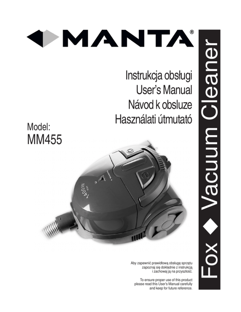 MM455 Aby zapewnić prawidłową obsługę sprzętu zapoznaj się dokładnie z instrukcją i zachowaj ją na przyszłość. To ensure proper use of this product please read this User’s Manual carefully and keep for future reference. Fox u Vacuum Cleaner Model: Instrukcja obsługi User’s Manual Návod k obsluze Használati útmutató MM455 FOX ® VACUUM CLEANER Instrukcja obsługi Nigdy nie używaj urządzenia jeśli pojemnik (torba) na kurz i filtry nie są na swoich miejscach. Nie używaj do sprzątania podłóg cementowych i innych pokrytych grubą warstwą pyłu lub miału. Uwaga! Konstrukcja produktu i parametry techniczne mogą ulec zmianie bez wcześniejszego powiadomienia. Dotyczy to przede wszystkim parametrów technicznych, oprogramowania oraz podręcznika użytkownika. Niniejszy podręcznik użytkownika służy ogólnej orientacji dotyczącej obsługi produktu. Produkt oraz akcesoria do odkurzacza mogą się różnić od tych opisanych w instrukcji. Producent i dystrybutor nie ponoszą żadnej odpowiedzialności tytułem odszkodowania za jakiekolwiek nieścisłości wynikające z błędów w opisach występujących w niniejszej instrukcji użytkownika. Ważne zasady bezpieczeństwa Upewnij się że woltaż w Twoim gniazdku elektrycznym, jest taki sam, jak ten na nalepce urządzenia 230V/50Hz. W wypadku, gdy z odkurzacza zacznie wydobywać się dym, nienaturalne dźwięki lub zapach należy natychmiast wyłączyć go i wyjąć wtyczkę z gniazda zasilania, po czym skontaktować się z wyspecjalizowanym serwisem. Uwaga! Upewnij się, że masz stały dostęp do wtyczki sieciowej i zasilacza tak, by w każdej chwili można było odłączyć urządzenie od prądu. Szczególną uwagę zwracaj na stan kabla i wtyczki sieciowej, sprawdzaj, czy nie jest uszkodzona, co grozi pożarem, porażeniem prądem lub uszkodzeniem urządzenia. Po skończonym odkurzaniu zawsze wyłączaj urządzenie i wyjmuj wtyczkę z gniazda sieciowego. Nie używaj do sprzątania detergentów, szkła, szpilek, popiołu z papierosów i kominka, wody, zapałek itp. Nie wystawiaj na działanie źródeł ciepła w rodzaju piecyków, kuchenek, pieka rników, oraz otwartego ognie np. kominka). Nigdy nie należy wciągać do odkurzacza przedmiotów mokrych, wilgotnych oraz wszelkich płynów. Nie wolno zanurzać urządzenia w wodzie. Nie pozwalaj, by woda lub inne płyny przeciekały do wnętrza urządzenia (pod obudowę) penetrując elektryczne i elektroniczne elementy urządzenia. W wypadku gdy to nastąpi, najpierw wysusz zamoczone elementy Nigdy nie czyść odkurzacza podłączonego do prądu. Zawsze najpierw wyjmij wtyczkę z gniazda sieciowego. Do czyszczenia używaj tylko miękkiej ściereczki suchej lub lekko wilgotnej. Do czyszczenie odkurzacza nie należy używać ostrych i szorstkich przedmiotów i materiałów. Nie ciągnij za przewód zasilający, ponieważ możesz w ten sposób go uszkodzić. Często sprawdzaj stan przewodu zasilającego. W wypadku jego uszkodzenia bez zwłoki udaj się do specjalistycznego punktu naprawy. Nie wkładaj żadnych przedmiotów do od otworu ssącego. Pilnuj by się nie zablokował. Utrzymuj urządzenie w czystości, wolne od kurzu, pyłu, włosów itp. Opis odkurzacza W zestawie Odkurzacz Rura giętka Rury sztywne x 2 Ssawka wąska ze szczoteczką Worek z materiału Instrukcja obsługi i karta gwarancyjna 5 MM455 FOX ® VACUUM CLEANER Montaż odkurzacza Użytkowanie Nie naciskaj przycisku zwijarki w czasie wyciągania przewodu z odkurzacza. Żółty znaczek na przewodzie oznacza długość kabla idealną do użytku. Koniec bezpiecznej długości kabla pokazuje znaczek czerwony. Nie należy wyciągać kabla poza ten znaczek. 1. Włóż zaopatrzony w zaczep mocujący koniec giętkiej rury do otworu z przodu odkurzacza aż usłyszysz wyraźne kliknięcie zaczepu. Aby zwinąć kabel wystarczy wcisnąć przycisk zwijarki drugą ręką podając jednocześnie prosty (nie splątany) kabel do zwinięcia. Rozmontowanie tego połączenia polega na wciśnięciu przycisku na rurze i wyjęciu jej z otworu odkurzacza. 2. Do drugiego końca giętkiej rury (ustawionego w dół łukowego uchwytu) Aby włączyć urządzenie należy wcisnąć przycisk włącznika. Użyj pokrętła potencjometru prędkości dostosowując siłę ciągu do potrzeb. połącz dwie sztywne rury przedłużające. Na koniec dolnej rury przedłużającej załóż odpowiednią ssawkę. Siłę ciągu można również kontrolować korzystając z rewizji siły ciągu na łukowatym uchwycie miękkiej rury odkurzacza. Wystarczy uchylić nieco rewizję, by siła ciągu zmniejszyła się. 6 MM455 FOX ® VACUUM CLEANER odkurzania niewielkich miękkich powierzchni jak tapicerka siedzeń i obić krzeseł, zagięcia w sofach i wersalkach czy pufach. Aby łatwiej ustawić urządzenie w czasie spoczynku, skorzystaj z haka po drugiej stronie uchwytu na szczotki (na sztywnej rurze przedłużającej) i włóż go w pasujący otwór w stojącym urządzeniu. Po drugiej stronie elementu haka dołącz drugą rurę i ssawki. Nie włączaj odkurzacza jeśli korzystasz z haka. SSAWKA SZEROKA Przeznaczona jest do sprzątania dużych płaskich powierzchni. Dla ułatwienia wyposażona została w kółka, na których się porusza oraz w elastyczny przegub łączący ją z miękką rurą ssącą, co umożliwia prowadzenie jej pod różnymi kątami wygodnymi dla obsługującego. Po wciśnięciu przycisku na górnej powierzchni ssawki (przełączeniu jej w tryb szczotki), na jej spodzie pojawi się rząd sztywnych włosków i gumowy pasek umożliwiające sprzątanie dywanów. Jeśli nie jest używana, można odwiesić ją wygodnie korzystając z szyny na ssawce i prowadnicy na tyle odkurzacza. Narzędzia sprzątające SSAWKA WĄSKA Służy do sprzątania w rogach pomieszczeń, przy i pod meblami oraz w zagięciach i szczelinach. Doskonale sprawdza się również podczas czyszczenia klawiatur, bibliotek czy ram okiennych. Uwaga! Jeśli jakiś przedm