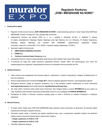 Regulamin Konkursu „DOM i MIESZKANIE NA NOWO” I. Postanowienia ogólne 1. Regulamin określa warunki konkursu „DOM i MIESZKANIE NA NOWO” przeprowadzanego podczas 5. edycji Targów Nowy DOM Nowe MIESZKANIE w dniach 4-5 lutego 2017 roku, zwanego dalej „Konkursem”. 2. Organizatorem Konkursu jest Murator EXPO sp. z o.o. z siedzibą w Warszawie (04-187), ul. Dęblińska 6, wpisana do rejestru przedsiębiorców Krajowego Rejestru Sądowego przez Sąd Rejonowy dla m.st. Warszawy, XII Wydział Gospodarczy Krajowego Rejestru Sądowego pod numerem KRS 0000090687, zarejestrowanym podatnikiem podatku od towarów i usług VAT o numerze NIP 113-21–59-933, o wysokości kapitału zakładowego: 770 000 zł. 3. Sponsorem nagród w Konkursie jest: - AMPM DESIGN AGNIESZKA KOŁACKA - FERRO S.A. - Techtronic Industries Eastern Europe sp. z o.o. 4. Uczestnikiem Konkursu może być każda pełnoletnia osoba fizyczna, która odwiedzi Targi i zakupi biletu wstępu. 5. W Konkursie nie mogą brać udziału pracownicy organizatora Konkursu: Murator EXPO, firm sponsorujących oraz innych firm współpracujących przy organizacji i przeprowadzeniu Konkursu ani członkowie rodzin pracowników tych firm. II. Założenia Konkursu 1. Celem Konkursu jest propagowanie idei tworzenia pięknych, estetycznych a zarazem funkcjonalnych rozwiązań architektonicznych w domu lub mieszkaniu. 2. Konkurs przeprowadzany jest w terminie 4-5 lutego 2017r. Okres ten obejmuje ogłoszenie Konkursu i czas przyjmowania zgłoszeń. 3. Rozwiązanie Konkursu nastąpi po uprzednim posiedzeniu Jury, a lista laureatów zostanie opublikowana na stronie internetowej www.targimieszkaniowe.pl oraz na profilu facebook Targi Mieszkaniowe Murator Expo 4. Aby wziąć udział w konkursie należy pobrać kupon konkursowy, który dostępny będzie w punkcie INFORMACJA tuż przy wejściu na Targi. Wypełniony kupon (pismem drukowanym) trzeba będzie wrzucić do urny znajdującej się PUNKCIE INFORMACJA. 5. Przystępując do udziału w Konkursie, uczestnicy wyrażają zgodę na udział w Konkursie na zasadach określonych w niniejszym regulaminie. III. Warunki Konkursu 1. W czasie trwania Targów Nowy DOM Nowe MIESZKANIE będą wydawane kupony konkursowe do głosowania. Na kuponach będzie zamieszczona informacja o zasadach Konkursu. 2. Warunkiem wzięcia udziału w Konkursie jest czytelne wypełnienie kupnu wraz z zaznaczeniem wszystkich punktów oraz złożeniem podpisu. Kupony konkursowe zbierane będą w czasie trwania Targów tj.: - 4 lutego w godzinach od 10:00 do 17:00 - 5 lutego w godzinach od 10:00 do 17:00 3. Prawidłowe zgłoszenie obejmuje: a. Odpowiedź na zadanie konkursowe które brzmi: „Jak powinna wyglądać kuchnia lub łazienka w Twoim domu lub mieszkaniu? Oceniana będzie najciekawsza odpowiedź. b. Wypełnienie obowiązkowych rubryk w tym danych osobowych i zgody na ich przetwarzanie dla celów przeprowadzenia konkursu oraz podpisu. 4. Zgłoszenia nie zawierające któregokolwiek z wyżej wymienionych elementów, będą traktowane jako nieważne i nie będą uwzględniane przez Jury. 5. Kupony konkursowe nie podlegają zwrotowi. 6. Jury oceni prace pod kątem oryginalności i koncepcji odpowiedzi na pytanie konkursowe, uwzględniając ciekawość i formę spośród oddanych prac wyłoni zwycięzcę. 7. Zasady wyboru laureatów: spośród prac konkursowych Jury wybierze: 1 laureata nagrody głównej oraz 25 nagród dodatkowych. 8. Laureaci poinformowani zostaną o nagrodzie telefonicznie lub e-mailowo. 9. Lista nagrodzonych opublikowana zostanie najpóźniej w ciągu 21 dni od zakończenia w/w Targów tj. 19 lutego 2017 r. na stronie internetowej www.targimieszkaniowe.pl oraz na profilu facebook Targi Mieszkaniowe Murator Expo i zawierać będzie: imię i nazwisko laureata oraz miejscowość zamieszkania. 10. Jedna osoba może oddać tyle głosów ile wypełni kuponów konkursowych, jednak oddanie większej liczby głosów nie uprawnia, w razie wygranej do otrzymania większej liczby nagród niż jedna. 11. Nagrodzona osoba nie jest uprawniona do żądania ekwiwalentu pieniężnego nagrody lub zmiany na inną nagrodę rzeczową. 12. W przypadku niespełnienia przez laureata wymogów regulaminu lub niemożności realizacji nagrody u laureata w wyznaczonym terminie, nagroda przechodzi na własność Murator EXPO sp. z o.o. lub innego, wybranego przez Jury laureata. 13. Nagrody zostaną przekazane po uprzednim ustaleniu warunków jej odbioru w okresie do 4 maja 2017 roku. 14. Organizator ma prawo nie przyznać poszczególnych nagród z przyczyn obiektywnych lub z powodu niedostatecznego poziomu prac konkursowych. IV. Jury Konkursu W skład Jury Konkursu wchodzą przedstawiciele Organizatora konkursu. V. Nagrody, zasady odbioru 1. W Konkursie przyznanych zostanie 26 nagród: I nagroda - projekt aranżacji kuchni lub łazienki. Szczegóły dotyczące nagrody ZAŁACZNIK 1. Sumaryczna wartość jednej nagrody - cena 2 460,00 złotych brutto (2000,00 zł netto). II nagroda – Bezszczotkowa wiertarko-wkrętarka udarowa 18 V (R18PDBL-LL25S) Sumaryczna wartość jednej nagrody: 991,05 zł netto (1219,00 zł brutto) III-IV nagroda – Akumulatorowa wiertarko-wkrętarka 12 V R12DD-L13S Sumaryczna wartość jednej nagrody: 397,56 zł netto (489,00 zł brutto) V-IX nagroda – Kompaktowa wkrętarka 4 V R4SD-L13C Sumaryczna wartość jednej nagrody: 165,73 zł netto (203,85 zł brutto) X-XI- nagroda – Narzędzie wielofunkcyjne 12 V RMT12011L Sumaryczna wartość jednej nagrody: 380,91 zł netto (468,53 zł brutto) XII-XIV nagroda - Odkurzacz ręczny 18 V CHV182M Sumaryczna wartość jednej nagrody: 113,00 zł netto (139,00 zł brutto) XV-XIX nagroda – Akcesoria łazienkowe Wenge Sumaryczna wartość jednej nagrody: 115,00 zł netto (141,45 zł brutto) XX-XXI nagroda – Akcesoria łazienkowe Bambus Sumaryczna wartość jednej nagrody: 375,00 zł netto (461,25 zł brutto) XXII-XXVI nagroda – Natrysk przesuwny NOVARA Sumaryczna wartoś