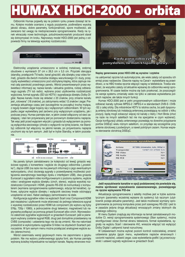 HUMAX HDCI-2000 - orbita Odbiorniki Humax pojawi³y siê na polskim rynku prawie dziesiêæ lat temu. Kolejne modele oceniano z regu³y pozytywnie, podkreœlano wysok¹ jakoœæ obrazu, dobre parametry, funkcjonalnoœæ, spore mo¿liwoœci, ale zwracano te¿ uwagê na niedopracowane oprogramowanie. Kiedy na rynek wkracza³y nowe technologie, po³udniowokoreañski producent stara³ siê dotrzymywaæ im kroku. Najnowszy model HDCI-2000 jest jedn¹ z odpowiedzi firmy na telewizjê wysokiej rozdzielczoœci. Elektronikê urz¹dzenia umieszczono w solidnej metalowej, srebrnej obudowie o wymiarach 37 cm x 26,5 cm x 5,5 cm. Przyciski steruj¹ce (standby, prze³¹cznik TV/radio, kana³ góra/dó³, si³a dŸwiêku oraz video format), gniazdo dla dwóch modu³ów dostêpu warunkowego CI i du¿y, przejrzysty wyœwietlacz umieszczono pod odchylan¹ klapk¹, która zajmuje niemal ca³¹ szerokoœæ przedniego panelu. Wœród prezentowanych przez wyœwietlacz informacji s¹: nazwa kana³u i aktualna godzina, rodzaj odbieranego sygna³u (TV lub radio), wybrana przez u¿ytkownika rozdzielczoœæ wyjœciowa, format sygna³u (SD lub HDTV) i sygnalizacja dŸwiêku Dolby Digital. Nazwa kana³u mo¿e siê sk³adaæ z 23 znaków, przy zmianie kana³u jest „rolowana” (18 znaków), po zatrzymaniu widaæ 12 znaków i zegar. Prezentacja aktualnego czasu jest (szczególnie na pocz¹tku) trochê myl¹ca, z regu³y bowiem zegar kojarzy siê z wy³¹czonym odbiornikiem. W tym wypadku zegar wyœwietlany jest zarówno przy wy³¹czonym urz¹dzeniu, jak i podczas pracy. Humax pamiêta stan, w jakim zosta³ od³¹czony od sieci zasilaj¹cej, i stan ten przywracany jest po ponownym dostarczeniu napiêcia. Tak wiêc jeœli przed wyjêciem wtyczki z gniazda lub wy³¹czeniem za pomoc¹ wy³¹cznika sieciowego (chodzi o wy³¹cznik na tylnej œcianie, nie Standby) odbiornik by³ w³¹czony na jakimœ kanale, po przywróceniu napiêcia uruchomi siê na tym samym. Jeœli by³ w trybie Standby, w takim pozostanie. Na panelu tylnym zainstalowano (w kolejnoœci od lewej) gniazdo wejœciowe sygna³u z konwertera i wyjœcie do drugiego odbiornika („przelotka”), z³¹cze USB (na razie nie ma pewnych informacji o jego ewentualnym wykorzystaniu, choæ docieraj¹ sygna³y o przewidywanej mo¿liwoœci pod³¹czenia zewnêtrznego twardego dysku z interfejsem USB), dwa gniazda Euroscart z sygna³ami video konfigurowanymi z poziomu systemu, wyjœcie video i analogowe wyjœcia dŸwiêku (cinch, stereo), wyjœcia wysokiej rozdzielczoœci Component i HDMI, gniazdo RS-232 do komunikacji z komputerem (wymiana oprogramowania systemowego, edycja list kana³ów), cyfrowe, optyczne wyjœcie dŸwiêku i wy³¹cznik sieciowy trwale odcinaj¹cy urz¹dzenie od sieci. Kabel zasilaj¹cy zamontowano na stale. Konfiguracja sygna³ów video na wyjœciach Scart oraz Component/HDMI jest niezale¿na i u¿ytkownik mo¿e skierowaæ do jednego telewizora sygna³ o wysokiej rozdzielczoœci przez HDMI lub component (do wyboru s¹ tryby 576p, 720p i 1080i), a jednoczeœnie drugi telewizor, magnetowid lub nagrywarkê pod³¹czyæ za pomoc¹ gniazd Euroscart albo cinch. Wprowadzono zale¿noœæ sygna³ów wyjœciowych w gniazdach Euroscart: jeœli w pierwszym wybrany zostanie sygna³ RGB, drugi jest domyœlnie przestawiany na CVBS (composite) i ustawienia tego nie da siê zmieniæ. Nie ma natomiast przeszkód w wykorzystaniu sygna³ów S-Video na obydwóch Scartach jednoczeœnie. W tym samym menu mo¿na prze³¹czaæ analogowe wyjœcie audio (stereo/mono). Wœród osiemnastu wersji jêzykowych menu nie zapomniano o jêzyku polskim. Nie ma wyboru preferowanego jêzyka fonii, ale Humax pamiêta wybran¹ œcie¿kê indywidualnie na ka¿dym kanale. Napisy ekranowe mo¿- Napisy generowane przez HDCI-200 s¹ wyraŸne i czytelne na uaktywniaæ rêcznie lub automatycznie, ale wiele zale¿y od sposobu ich emisji przez nadawców. Obecnie napisy na Canal+ wyœwietlane s¹ prawid³owo, a na HBO trzeba rêcznie w³¹czyæ napisy w teletekœcie. Trzeba wiedzieæ, ¿e wszystko zale¿y od aktualnie wpisanej do odbiornika wersji oprogramowania. W czasie testów mo¿na siê by³o przekonaæ, ¿e poszczególne wersje systemu zmienia³y wiele nie tylko w zakresie wyœwietlania polskich napisów, ale tak¿e innych funkcji. Humax HDCI-2000 jest w pe³ni programowalnym odbiornikiem i mo¿e odbieraæ kana³y cyfrowe MPEG-2 i MPEG-4 w standardach DVB-S i DVB-S2 z ca³ej orbity. Dla mi³oœników HDTV to istotna cecha, bo jeœli dysponuj¹ anten¹ obrotow¹ lub instalacj¹ antenow¹ pozwalaj¹c¹ na odbiór z kilku pozycji, bêd¹ mogli zobaczyæ wiêcej ni¿ kana³y z Astry i Hort Birda (choæ na razie na innych satelitach te¿ nie ma specjalnie w czym wybieraæ). Opcje konfiguracji uk³adu antenowego pozwalaj¹ na dowolne przypisanie portów DiSEqC wielu ró¿nym satelitom, co przydaje siê szczególnie przy antenie obrotowej z podwójnym, a nawet potrójnym zezem. Humax wspiera sterowanie obrotnic¹ DiSEqC. Jeœli wyszukiwanie kana³ów w opcji podstawowej nie powiedzie siê, mo¿na spróbowaæ wyszukiwania zaawansowanego, pozwalaj¹cego na rêczne wpisywanie PID-ów Aktualizacja oprogramowania z satelity mo¿liwa jest w trybie automatycznym (parametry wczeœniej wpisane do systemu) lub rêcznym (u¿ytkownik podaje aktualne parametry). Jest tak¿e mo¿liwoœæ wymiany oprogramowania za pomoc¹ komputera przez port szeregowy RS-232 i jest to w zasadzie jedyna droga aktualizacji wnosz¹cych zmiany istotnych dla polskiego odbiorcy. W menu System znajduj¹ siê informacje na temat zainstalowanych modu³ów CI, wersji oprogramowania systemowego (Stan systemu), mo¿na skonfigurowaæ obraz (format ekranu telewizora, format wyœwietlania, sygna³y na wyjœciu Scart i sterowanie AV), wreszcie w³¹czyæ lub wy³¹czyæ Dolby Digital i uaktywniæ kana³ rozruchowy. W Ustawieniach mo¿na wybraæ poziom kontroli rodzicielskiej, zmieniæ ustawienia jêzyka (jêzyk menu, wyœwietlanie napisów ek