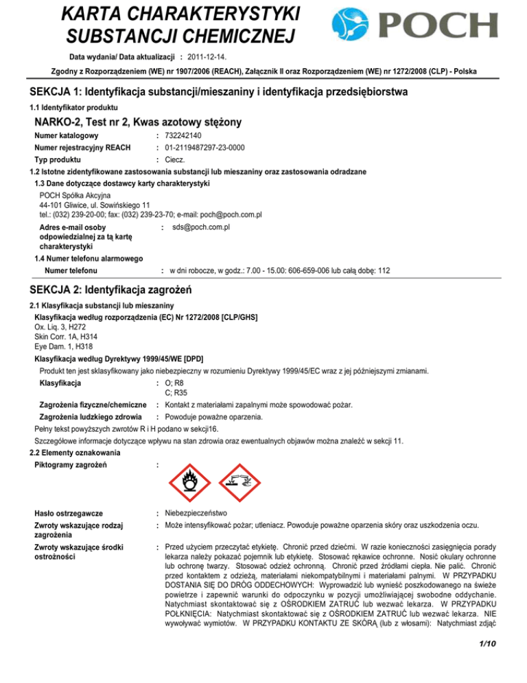 KARTA CHARAKTERYSTYKI SUBSTANCJI CHEMICZNEJ Data wydania/ Data aktualizacji : 2011-12-14. Zgodny z Rozporządzeniem (WE) nr 1907/2006 (REACH), Załącznik II oraz Rozporządzeniem (WE) nr 1272/2008 (CLP) - Polska SEKCJA 1: Identyfikacja substancji/mieszaniny i identyfikacja przedsiębiorstwa 1.1 Identyfikator produktu NARKO-2, Test nr 2, Kwas azotowy stężony Numer katalogowy : 732242140 Numer rejestracyjny REACH : 01-2119487297-23-0000 Typ produktu : Ciecz. 1.2 Istotne zidentyfikowane zastosowania substancji lub mieszaniny oraz zastosowania odradzane 1.3 Dane dotyczące dostawcy karty charakterystyki POCH Spółka Akcyjna 44-101 Gliwice, ul. Sowińskiego 11 tel.: (032) 239-20-00; fax: (032) 239-23-70; e-mail: [email protected] Adres e-mail osoby odpowiedzialnej za tą kartę charakterystyki : [email protected] 1.4 Numer telefonu alarmowego Numer telefonu : w dni robocze, w godz.: 7.00 - 15.00: 606-659-006 lub całą dobę: 112 SEKCJA 2: Identyfikacja zagrożeń 2.1 Klasyfikacja substancji lub mieszaniny Klasyfikacja według rozporządzenia (EC) Nr 1272/2008 [CLP/GHS] Ox. Liq. 3, H272 Skin Corr. 1A, H314 Eye Dam. 1, H318 Klasyfikacja według Dyrektywy 1999/45/WE [DPD] Produkt ten jest sklasyfikowany jako niebezpieczny w rozumieniu Dyrektywy 1999/45/EC wraz z jej późniejszymi zmianami. Klasyfikacja : O; R8 C; R35 Zagrożenia fizyczne/chemiczne : Kontakt z materiałami zapalnymi może spowodować pożar. Zagrożenia ludzkiego zdrowia : Powoduje poważne oparzenia. Pełny tekst powyższych zwrotów R i H podano w sekcji16. Szczegółowe informacje dotyczące wpływu na stan zdrowia oraz ewentualnych objawów można znaleźć w sekcji 11. 2.2 Elementy oznakowania Piktogramy zagrożeń : Hasło ostrzegawcze : Niebezpieczeństwo Zwroty wskazujące rodzaj zagrożenia : Może intensyfikować pożar; utleniacz. Powoduje poważne oparzenia skóry oraz uszkodzenia oczu. Zwroty wskazujące środki ostrożności : Przed użyciem przeczytać etykietę. Chronić przed dziećmi. W razie konieczności zasięgnięcia porady lekarza należy pokazać pojemnik lub etykietę. Stosować rękawice ochronne. Nosić okulary ochronne lub ochronę twarzy. Stosować odzież ochronną. Chronić przed źródłami ciepła. Nie palić. Chronić przed kontaktem z odzieżą, materiałami niekompatybilnymi i materiałami palnymi. W PRZYPADKU DOSTANIA SIĘ DO DRÓG ODDECHOWYCH: Wyprowadzić lub wynieść poszkodowanego na świeże powietrze i zapewnić warunki do odpoczynku w pozycji umożliwiającej swobodne oddychanie. Natychmiast skontaktować się z OŚRODKIEM ZATRUĆ lub wezwać lekarza. W PRZYPADKU POŁKNIĘCIA: Natychmiast skontaktować się z OŚRODKIEM ZATRUĆ lub wezwać lekarza. NIE wywoływać wymiotów. W PRZYPADKU KONTAKTU ZE SKÓRĄ (lub z włosami): Natychmiast zdjąć 1/10 NARKO-2, Test nr 2, Kwas azotowy stężony całą zanieczyszczoną odzież. Spłukać skórę wodą albo pod prysznicem. Natychmiast skontaktować się z OŚRODKIEM ZATRUĆ lub wezwać lekarza. W PRZYPADKU DOSTANIA SIĘ DO OCZU: Natychmiast skontaktować się z OŚRODKIEM ZATRUĆ lub wezwać lekarza. Przechowywać pod zamknięciem. Zawartość pojemnika jak i pojemnik utylizować zgodnie z lokalnymi, regionalnymi, narodowymi oraz międzynarodowymi przepisami. Niebezpieczne składniki 2.3 Inne zagrożenia Inne zagrożenia nie odzwierciedlone w klasyfikacji : kwas azotowy(V) ...% : Niedostępne. SEKCJA 3: Skład/informacja o składnikach Klasyfikacja Nazwa produktu/składnika kwas azotowy(V) ...% Identyfikatory REACH #: 012119487297-23 WE: 231-714-2 CAS: 7697-37-2 Indeks: 007-004-00-1 % 65 - 70 67/548/EWG Rozporządzenie (WE) Nr 1272/2008 [CLP] O; R8 Ox. Liq. 3, H272 C; R35 Skin Corr. 1A, H314 Eye Dam. 1, H318 Patrz Sekcja 16 - pełny tekst zadeklarowanych wyżej Fraz-R. Pełny tekst powyższych uwag H podano w punkcie 16. Typ [1] [2] Nie zawiera składników, które w świetle obecnej wiedzy dostawcy oraz w danym stężeniu są klasyfikowane jako niebezpieczne dla zdrowia lub otoczenia, klasyfikowane są jako PBT lub vPvB, lub którym przypisano ograniczenia co do występowania w środowisku pracy, nie ma więc wymogu wymieniania ich w niniejszym ustępie. Typ [1] Substancja sklasyfikowana jako szkodliwa dla zdrowia lub środowiska [2] Substancja, dla której wyznaczono dopuszczalne stężenie w środowisku pracy [3] Substancja spełnia kryteria dla jej zaklasyfikowania jako PBT zgodnie z Rozporządzeniem (WE) Nr 1907/2006, Aneks XIII [4] Substancja spełnia kryteria dla jej zaklasyfikowania jako vPvB zgodnie z Rozporządzeniem (WE) Nr 1907/2006, Aneks XIII Najwyższe dopuszczalne stężenia, jeśli są dostępne, wymienione są wymienione w sekcji 8. SEKCJA 4: Środki pierwszej pomocy 4.1 Opis środków pierwszej pomocy Kontakt z okiem : Natychmiast przepłukać oczy dużą ilością wody, od czasu do czasu podnosząc górna i dolna powiekę. Usunąć szkła kontaktowe jeżeli są. Zasięgnąć porady medycznej. Oparzenia chemikaliami powinny być niezwłocznie opatrzone przez lekarza. Należy kontynuować płukanie przez co najmniej 10 minut. Wdychanie : Bezzwłocznie zasięgnąć porady medycznej. Wynieść narażoną osobę na świeże powietrze. Jeśli podejrzewa się, że opary wciąż są obecne ratownik powinien założyć właściwą maskę lub oddechowy aparat izolacyjny. Zapewnić osobie ciepło i spokój. Jeżeli osoba nie oddycha, oddycha nieregularnie lub gdy oddychanie ustało, wykwalifikowany personel powinien wykonać sztuczne oddychanie lub podać tlen. Może być niebezpiecznym dla osoby udzielającej sztucznego oddychania usta usta. W przypadku utraty przytomności, należy ułożyć w pozycji bocznej ustalonej i natychmiast wezwać pomoc medyczną. Zapewnić otwartą wentylację. Rozluźnić ciasną odzież, na przykład kołnierz, krawat lub pasek. W razie wdychania produktów rozkładu powstających podczas pożaru, wystąpienie objawów może być opóźnione. Narażona osoba może wymagać nadzoru lekarskiego pr