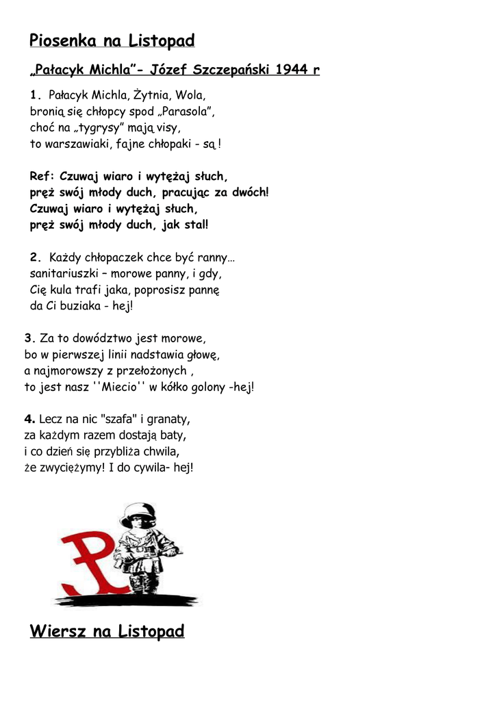Piosenka na Listopad „Pałacyk Michla”- Józef Szczepański 1944 r 1. Pałacyk Michla, Żytnia, Wola, bronią się chłopcy spod „Parasola”, choć na „tygrysy” mają visy, to warszawiaki, fajne chłopaki - są ! Ref: Czuwaj wiaro i wytężaj słuch, pręż swój młody duch, pracując za dwóch! Czuwaj wiaro i wytężaj słuch, pręż swój młody duch, jak stal! 2. Każdy chłopaczek chce być ranny… sanitariuszki – morowe panny, i gdy, Cię kula trafi jaka, poprosisz pannę da Ci buziaka - hej! 3. Za to dowództwo jest morowe, bo w pierwszej linii nadstawia głowę, a najmorowszy z przełożonych , to jest nasz ''Miecio'' w kółko golony -hej! 4. Lecz na nic "szafa" i granaty, za każdym razem dostają baty, i co dzień się przybliża chwila, że zwyciężymy! I do cywila- hej! Wiersz na Listopad „Twój dom”- Wanda Chotomska Jest w każdym naszym słowie, a słowa są najprostsze chleb, mama, dom gościnny, i Wisła, i Mazowsze. I jest w czerwieni maków, i w białych kwiatach wiśni, w piosenkach wszystkich ptaków i w każdej naszej myśli. W mazurku chopinowskim, i w czarnym węglu Śląska, i tu, gdzie serce mówi, że to jest właśnie Polska.