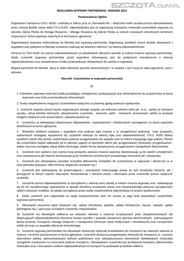 REGULAMIN WYPRAWY PARTNERSKIEJ MAROKO 2013 Postanowienie Ogólne Organizator transportu F.H.U. ALDO z siedzibą w Zabrzu przy ul. Szenwalda 9G – właściciel marki szczota.com.pl reprezentowany przez Justynę Budzik zwany dalej F.H.U.ALDO odpowiedzialny jest za organizację transportu motocykli uczestników wyprawy na odcinku Zabrze Polska do Malaga Hiszpania – Malaga Hiszpania do Zabrze Polska w ramach czasowych określonych terminem rozpoczęcia i końca wyprawy zawartych w formularzu zgłoszenia. Organizowana wyprawa motocyklowa do Maroko jest wyprawą partnerską. Organizację wszelkich innych działań związanych z wyjazdem oraz pobytem w Maroko uczestnicy realizują we własnym zakresie i na własną odpowiedzialność. Oznacza to, FHU ALDO nie ponosi odpowiedzialności za jakiekolwiek zdarzenia wynikłe w trakcie trwania wyprawy partnerskiej. Każdy uczestnik wyprawy partnerskiej przed wyjazdem zobowiązany jest do podpisania oświadczenia o własnej odpowiedzialności oraz oświadczenia o braku przeciwskazań zdrowotnych do udziału w wyprawie. Wyjazd partnerski do Maroko łączy w sobie elementy sportów ekstremalnych i w związku z tym niosą ze sobą zagrożenie, życia i zdrowia. Warunki Uczestnictwa w wyprawie partnerskiej §1 1. Członkiem wyprawy może być każdy posiadający umiejętności, predyspozycje oraz doświadczenie do uczestnictwa w danej wyprawie oraz brak przeciwwskazań zdrowotnych. 2. Osoby niepełnoletnie mogą być Uczestnikami wyłącznie za pisemną zgodą prawnych opiekunów. 3. Uczestnik wyjazdu ponosi koszty organizacyjne danego wyjazdu we własnym zakresie takie jak m.in. opłata za transport sprzętu, zakup biletów lotniczych, ubezpieczenia uczestnika , żywności, opłat wizowych, promowych, opłaty za przejazd drogami lokalnymi oraz autostradami, zakwaterowania itp. 4. Uczestnicy są zobowiązani dysponować odpowiednim wyposażeniem i ekwipunkiem wymaganym na danej wyprawie określonymi w karcie zgłoszenia 5. Wszystkie działania związane z wyjazdem oraz podczas jego trwania a w szczególności wybranej trasy przejazdu, wybieranych noclegów, wyżywienia itp. uczestnik realizuje na własną rękę oraz odpowiedzialność. F.H.U. ALDO dołoży wszelkich starań aby pomóc uczestnikowi podczas przygotowania do wyjazdu oraz w trakcie trwającego jego pobytu. Pomoc dla uczestników będzie odbywała się w zakresie sugestii w kwestiach takich jak: przygotowanie motocykla, przygotowanie i wybór tras oraz noclegów, zakup biletu lotniczego, wybór formy ubezpieczenia, przygotowanie niezbędnych dokumentów. 6. Uczestnik sam wybiera oraz ocenia trasę przejazdu podczas trwania wyprawy dostosowując ją do swoich umiejętności oraz samopoczucia jak również dostosowuje ją do możliwości technicznych posiadanego motocykla jak i ekwipunku. 5. Uczestnik jest zobowiązany posiadać wszystkie dokumenty niezbędne do uczestnictwa w wyprawie i dostarczyć je w razie potrzeby (paszport, bilet lotniczy, książeczka szczepień itp.) 6. Uczestnik jest zobowiązany do przestrzegania i szanowania miejscowego prawa (w tym przepisów celnych), jak i panujących w danym rejonie obyczajów. Konsekwencje z łamania prawa i obyczajów przez uczestnika ponosi wyłącznie uczestnik. 7. Uczestnik ponosi odpowiedzialność za wyrządzone z własnej winy szkody w trakcie trwania wyprawy oraz zobowiązuje się do ich niezwłocznego naprawienia w sposób określony przepisami prawa oraz bezpośredniego pokrycia wyrządzonych szkód z własnych środków. Za szkody wyrządzone przez osoby niepełnoletnie odpowiadają ich prawni opiekunowie. 8. Każdy uczestnik sam odpowiada za swoje bezpieczeństwo oraz nie naraża na jego brak pozostałych uczestników wyprawy partnerskiej. 9. Obowiązek uiszczenia opłat lokalnych (np. opłaty lotniskowe, podatki, opłaty klimatyczne, kaucje, napiwki, opłaty parkingowe itp.), spoczywa na każdym uczestniku indywidualnie. 10. Uczestnik ma obowiązek zadbania we własnym zakresie o zawarcie turystycznych polis ubezpieczeniowych lub obejmujących odpowiedzialnością zdarzenia losowe wynikłe z powodu uprawiania sportów ekstremalnych, pokrywających koszty leczenia, transportu chorego (włącznie z transportem lotniczym służb medycznych i ratunkowych) oraz transportem zwłok do kraju na wypadek zdarzenia śmiertelnego. 11. Uczestnik wyprawy partnerskiej ma obowiązek dostarczyć motocykl przewidziany do transportu we własnym zakresie w miejsce i terminie wyznaczonym w karcie zgłoszenia. Uczestnik dostarcza przygotowany motocykl do transportu tj. z pustym zbiornikiem paliwa, zdemontowanymi kuframi podróżnymi oraz zabezpieczonymi elementami dodatkowymi motocykla szczególnie narażonymi na zniszczenie podczas transportu. Obowiązkiem uczestnika jest przekazanie kompletu dokumentów motocykla wraz z kluczykami osobom odpowiedzialnym za transport na podstawie protokołu odbioru. Zawarcie Umowy §2 1. Zawarcie Umowy o wyprawę partnerską polega na: a) podpisaniu karty zgłoszenia i dostarczeniu jej przez Uczestnika , potwierdzeniu pisemnym o zapoznaniu się z regulaminem wyprawy partnerskiej. b) wniesieniu opłaty wstępnej Warunki Płatności §3 1. Z chwilą zawarcia Umowy Uczestnik zobowiązany jest wpłacić część kosztów na poczet organizacji transportu w wysokości 1000 zł w terminie określonym w karcie zgłoszenia. Brak wniesienia wpłaty jest równoznaczny z nie zawarciem Umowy. 2. Pozostała należność winna być dokonana nie później niż 30 dni przed rozpoczęciem wyprawy. 3. Jeżeli umowa zostają zawarta na mniej niż 30 dni przed wyjazdem, Uczestnik zobowiązany jest do zapłaty 100% opłaty w dniu zawarcia Umowy. 4. Za datę dokonania płatności przyjmuje się dzień wpływu należności na konto bankowe lub dzień wpłaty gotówkowej. Wysokość kosztów transportu może ulec podwyższeniu nie później jednak niż na 21 dni przed rozpoczęciem. Na zmianę opłaty wpływać mogą: a) kursy walut b) wzrost