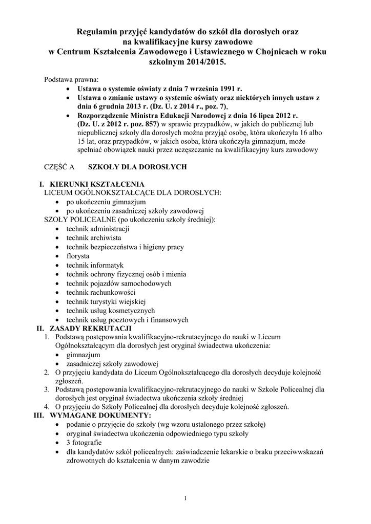 Regulamin przyjęć kandydatów do szkół dla dorosłych oraz na kwalifikacyjne kursy zawodowe w Centrum Kształcenia Zawodowego i Ustawicznego w Chojnicach w roku szkolnym 2014/2015. Podstawa prawna: Ustawa o systemie oświaty z dnia 7 września 1991 r. Ustawa o zmianie ustawy o systemie oświaty oraz niektórych innych ustaw z dnia 6 grudnia 2013 r. (Dz. U. z 2014 r., poz. 7), Rozporządzenie Ministra Edukacji Narodowej z dnia 16 lipca 2012 r. (Dz. U. z 2012 r. poz. 857) w sprawie przypadków, w jakich do publicznej lub niepublicznej szkoły dla dorosłych można przyjąć osobę, która ukończyła 16 albo 15 lat, oraz przypadków, w jakich osoba, która ukończyła gimnazjum, może spełniać obowiązek nauki przez uczęszczanie na kwalifikacyjny kurs zawodowy CZĘŚĆ A SZKOŁY DLA DOROSŁYCH I. KIERUNKI KSZTAŁCENIA LICEUM OGÓLNOKSZTAŁCĄCE DLA DOROSŁYCH: po ukończeniu gimnazjum po ukończeniu zasadniczej szkoły zawodowej SZOŁY POLICEALNE (po ukończeniu szkoły średniej): technik administracji technik archiwista technik bezpieczeństwa i higieny pracy florysta technik informatyk technik ochrony fizycznej osób i mienia technik pojazdów samochodowych technik rachunkowości technik turystyki wiejskiej technik usług kosmetycznych technik usług pocztowych i finansowych II. ZASADY REKRUTACJI 1. Podstawą postępowania kwalifikacyjno-rekrutacyjnego do nauki w Liceum Ogólnokształcącym dla dorosłych jest oryginał świadectwa ukończenia: gimnazjum zasadniczej szkoły zawodowej 2. O przyjęciu kandydata do Liceum Ogólnokształcącego dla dorosłych decyduje kolejność zgłoszeń. 3. Podstawą postępowania kwalifikacyjno-rekrutacyjnego do nauki w Szkole Policealnej dla dorosłych jest oryginał świadectwa ukończenia szkoły średniej 4. O przyjęciu do Szkoły Policealnej dla dorosłych decyduje kolejność zgłoszeń. III. WYMAGANE DOKUMENTY: podanie o przyjęcie do szkoły (wg wzoru ustalonego przez szkołę) oryginał świadectwa ukończenia odpowiedniego typu szkoły 3 fotografie dla kandydatów szkół policealnych: zaświadczenie lekarskie o braku przeciwwskazań zdrowotnych do kształcenia w danym zawodzie 1 IV. OBOWIĄZUJĄCE TERMINY REKRUTACJI I SKŁADANIA DOKUMENTÓW Składanie dokumentów do wybranych szkół do 28 sierpnia 2014 r. Ogłoszenie przez dyrektora listy przyjętych do 29 sierpnia 2014 r. szkoły godz. 12:00 W terminie 3 dni od ogłoszenia listy kandydatów przyjętych do szkoły Dyrektor Szkoły rozpatruje ewentualne odwołania. W przypadku wolnych miejsc istnieje możliwość wydłużenia naboru. CZĘŚĆ B KWALIFIKACYJNE KURSY ZAWODOWE I. WYKAZ PLANOWANYCH KWALIFIKACYJNYCH KURSÓW ZAWODOWYCH OZNACZENIE NAZWA KWALIFIKACJI KWALIFIKACJI A.13. Wytwarzanie wyrobów stolarskich. A.12. Wykonywanie usług krawieckich. A.18. Prowadzenie sprzedaży. A.21. Prowadzenie działalności informacyjno-bibliograficznej. A.22. Prowadzenie działalności handlowej. A.26. Sprzedaż produktów i usług reklamowych A.27. Organizacja i prowadzenie kampanii reklamowej. A.35. Planowanie i prowadzenie działalności w organizacji A.36. Prowadzenie rachunkowości. A.54. Przygotowywanie materiałów graficznych do procesu drukowania A.25. Wykonywanie i realizacja projektów multimedialnych A.55. Drukowanie cyfrowe. A.61. Wykonywanie zabiegów kosmetycznych twarzy A.62. Wykonywanie zabiegów kosmetycznych ciała, dłoni i stóp. A.63. Organizacja i prowadzenie archiwum A.64. Opracowywanie materiałów archiwalnych. A.65. Rozliczanie wynagrodzeń i danin publicznych. A.66. Świadczenie usług pocztowych, finansowych i kurierskich oraz w zakresie obrotu towarowego A.67. Wykonywanie zadań rozdzielczo-ekspedycyjnych w usługach pocztowych i kurierskich. A.68. Obsługa klienta w jednostkach administracji B.16. Wykonywanie robót zbrojarskich i betoniarskich B.18. Wykonywanie robót murarskich i tynkarskich B.20. Montaż konstrukcji budowlanych B.33. Organizacja i kontrolowanie robót budowlanych B.30. Sporządzanie kosztorysów oraz przygotowywanie dokumentacji przetargowej. E.3. Montaż urządzeń i systemów mechatronicznych E.6. Wykonywanie instalacji urządzeń elektronicznych E.7. Montaż i konserwacja maszyn i urządzeń elektrycznych E.8. Montaż i konserwacja instalacji elektrycznych E.12. Montaż i eksploatacja komputerów osobistych oraz urządzeń peryferyjnych E.13. Projektowanie lokalnych sieci komputerowych i administrowanie 2 E.14. E.18. E.19. E.20. E.24. M.12. M.17. M.18. M.19. M.20. M.42. M.44. T.2. T.3. T.4. T.5. T.6. T.7. T.8. T.9. T.10. T.11. T.12. T.13. T.14. T.15. T.16. R.26. Z.3. Z.13 sieciami Tworzenie aplikacji internetowych i baz danych oraz administrowanie bazami Eksploatacja urządzeń i systemów mechatronicznych Projektowanie i programowanie urządzeń i systemów mechatronicznych. Eksploatacja urządzeń elektronicznych. Eksploatacja maszyn, urządzeń i instalacji elektrycznych. Diagnozowanie oraz naprawa elektrycznych i elektronicznych układów pojazdów samochodowych Montaż i obsługa maszyn i urządzeń Diagnozowanie i naprawa podzespołów i zespołów pojazdów samochodowych. Użytkowanie obrabiarek skrawających Wykonywanie i naprawa elementów maszyn, urządzeń i narzędzi Organizacja i prowadzenie procesu obsługi pojazdów samochodowych. Organizacja i nadzorowanie procesów produkcji maszyn i urządzeń. Produkcja wyrobów spożywczych z wykorzystaniem maszyn i urządzeń albo Produkcja wyrobów piekarskich, Produkcja wyrobów cukierniczych Produkcja przetworów mięsnych i tłuszczowych Sporządzanie potraw i napojów Prowadzenie działalności turystycznej na obszarach wiejskich Prowadzenie gospodarstwa agroturystycznego Wykonywanie usług kelnerskich Organizacja usług gastronomicznych. Planowanie i realizacja usług w recepcji Obsługa gości w obiekcie świadczącym usługi hotelarskie. Planowanie i realizacja imprez i usług turystycznych Prowadzenie informacji turystycznej oraz sprzedaż usług turystycznych. Organizacja żywien
