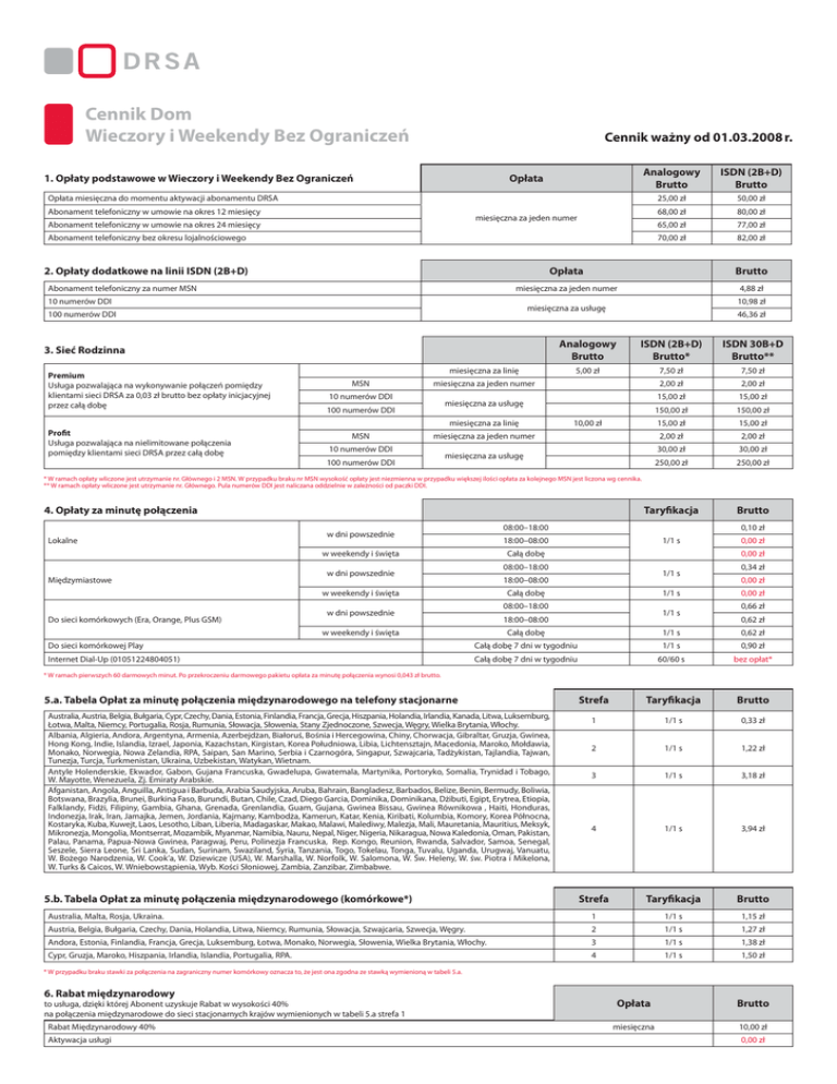 Cennik Dom Wieczory i Weekendy Bez Ograniczeń Cennik ważny od 01.03.2008 r. 1. Opłaty podstawowe w Wieczory i Weekendy Bez Ograniczeń Opłata Analogowy Brutto ISDN (2B+D) Brutto 25,00 zł 50,00 zł 68,00 zł 80,00 zł 65,00 zł 77,00 zł 70,00 zł 82,00 zł Opłata miesięczna do momentu aktywacji abonamentu DRSA Abonament telefoniczny w umowie na okres 12 miesięcy miesięczna za jeden numer Abonament telefoniczny w umowie na okres 24 miesięcy Abonament telefoniczny bez okresu lojalnościowego 2. Opłaty dodatkowe na linii ISDN (2B+D) Opłata Abonament telefoniczny za numer MSN 10 numerów DDI 3. Sieć Rodzinna miesięczna za linię MSN 10 numerów DDI Analogowy Brutto ISDN (2B+D) Brutto* ISDN 30B+D Brutto** 5,00 zł 7,50 zł 7,50 zł miesięczna za usługę 100 numerów DDI MSN 46,36 zł miesięczna za jeden numer miesięczna za linię Profit Usługa pozwalająca na nielimitowane połączenia pomiędzy klientami sieci DRSA przez całą dobę 4,88 zł 10,98 zł miesięczna za usługę 100 numerów DDI Premium Usługa pozwalająca na wykonywanie połączeń pomiędzy klientami sieci DRSA za 0,03 zł brutto bez opłaty inicjacyjnej przez całą dobę Brutto miesięczna za jeden numer 10,00 zł miesięczna za jeden numer 10 numerów DDI 100 numerów DDI 2,00 zł 2,00 zł 15,00 zł 15,00 zł 150,00 zł 150,00 zł 15,00 zł 15,00 zł 2,00 zł 2,00 zł 30,00 zł 30,00 zł 250,00 zł 250,00 zł Taryfikacja Brutto 1/1 s 0,00 zł miesięczna za usługę * W ramach opłaty wliczone jest utrzymanie nr. Głównego i 2 MSN. W przypadku braku nr MSN wysokość opłaty jest niezmienna w przypadku większej ilości opłata za kolejnego MSN jest liczona wg cennika. ** W ramach opłaty wliczone jest utrzymanie nr. Głównego. Pula numerów DDI jest naliczana oddzielnie w zależności od paczki DDI. 4. Opłaty za minutę połączenia Lokalne 08:00–18:00 w dni powszednie w weekendy i święta Międzymiastowe Całą dobę 0,00 zł 08:00–18:00 w dni powszednie 1/1 s 18:00–08:00 w weekendy i święta Do sieci komórkowych (Era, Orange, Plus GSM) 0,10 zł 18:00–08:00 Całą dobę 1/1 s 08:00–18:00 w dni powszednie 1/1 s 18:00–08:00 w weekendy i święta 0,34 zł 0,00 zł 0,00 zł 0,66 zł 0,62 zł Całą dobę 1/1 s 0,62 zł Do sieci komórkowej Play Całą dobę 7 dni w tygodniu 1/1 s 0,90 zł Internet Dial-Up (01051224804051) Całą dobę 7 dni w tygodniu 60/60 s bez opłat* Strefa Taryfikacja Brutto 1 1/1 s 0,33 zł 2 1/1 s 1,22 zł 3 1/1 s 3,18 zł 4 1/1 s 3,94 zł * W ramach pierwszych 60 darmowych minut. Po przekroczeniu darmowego pakietu opłata za minutę połączenia wynosi 0,043 zł brutto. 5.a. Tabela Opłat za minutę połączenia międzynarodowego na telefony stacjonarne Australia, Austria, Belgia, Bułgaria, Cypr, Czechy, Dania, Estonia, Finlandia, Francja, Grecja, Hiszpania, Holandia, Irlandia, Kanada, Litwa, Luksemburg, Łotwa, Malta, Niemcy, Portugalia, Rosja, Rumunia, Słowacja, Słowenia, Stany Zjednoczone, Szwecja, Węgry, Wielka Brytania, Włochy. Albania, Algieria, Andora, Argentyna, Armenia, Azerbejdżan, Białoruś, Bośnia i Hercegowina, Chiny, Chorwacja, Gibraltar, Gruzja, Gwinea, Hong Kong, Indie, Islandia, Izrael, Japonia, Kazachstan, Kirgistan, Korea Południowa, Libia, Lichtensztajn, Macedonia, Maroko, Mołdawia, Monako, Norwegia, Nowa Zelandia, RPA, Saipan, San Marino, Serbia i Czarnogóra, Singapur, Szwajcaria, Tadżykistan, Tajlandia, Tajwan, Tunezja, Turcja, Turkmenistan, Ukraina, Uzbekistan, Watykan, Wietnam. Antyle Holenderskie, Ekwador, Gabon, Gujana Francuska, Gwadelupa, Gwatemala, Martynika, Portoryko, Somalia, Trynidad i Tobago, W. Mayotte, Wenezuela, Zj. Emiraty Arabskie. Afganistan, Angola, Anguilla, Antigua i Barbuda, Arabia Saudyjska, Aruba, Bahrain, Bangladesz, Barbados, Belize, Benin, Bermudy, Boliwia, Botswana, Brazylia, Brunei, Burkina Faso, Burundi, Butan, Chile, Czad, Diego Garcia, Dominika, Dominikana, Dżibuti, Egipt, Erytrea, Etiopia, Falklandy, Fidżi, Filipiny, Gambia, Ghana, Grenada, Grenlandia, Guam, Gujana, Gwinea Bissau, Gwinea Równikowa , Haiti, Honduras, Indonezja, Irak, Iran, Jamajka, Jemen, Jordania, Kajmany, Kambodża, Kamerun, Katar, Kenia, Kiribati, Kolumbia, Komory, Korea Północna, Kostaryka, Kuba, Kuwejt, Laos, Lesotho, Liban, Liberia, Madagaskar, Makao, Malawi, Malediwy, Malezja, Mali, Mauretania, Mauritius, Meksyk, Mikronezja, Mongolia, Montserrat, Mozambik, Myanmar, Namibia, Nauru, Nepal, Niger, Nigeria, Nikaragua, Nowa Kaledonia, Oman, Pakistan, Palau, Panama, Papua-Nowa Gwinea, Paragwaj, Peru, Polinezja Francuska, Rep. Kongo, Reunion, Rwanda, Salvador, Samoa, Senegal, Seszele, Sierra Leone, Sri Lanka, Sudan, Surinam, Swaziland, Syria, Tanzania, Togo, Tokelau, Tonga, Tuvalu, Uganda, Urugwaj, Vanuatu, W. Bożego Narodzenia, W. Cook’a, W. Dziewicze (USA), W. Marshalla, W. Norfolk, W. Salomona, W. Św. Heleny, W. św. Piotra i Mikelona, W. Turks & Caicos, W. Wniebowstąpienia, Wyb. Kości Słoniowej, Zambia, Zanzibar, Zimbabwe. 5.b. Tabela Opłat za minutę połączenia międzynarodowego (komórkowe*) Strefa Taryfikacja Brutto Australia, Malta, Rosja, Ukraina. 1 1/1 s 1,15 zł Austria, Belgia, Bułgaria, Czechy, Dania, Holandia, Litwa, Niemcy, Rumunia, Słowacja, Szwajcaria, Szwecja, Węgry. 2 1/1 s 1,27 zł Andora, Estonia, Finlandia, Francja, Grecja, Luksemburg, Łotwa, Monako, Norwegia, Słowenia, Wielka Brytania, Włochy. 3 1/1 s 1,38 zł Cypr, Gruzja, Maroko, Hiszpania, Irlandia, Islandia, Portugalia, RPA. 4 1/1 s 1,50 zł * W przypadku braku stawki za połączenia na zagraniczny numer komórkowy oznacza to, że jest ona zgodna ze stawką wymienioną w tabeli 5.a. 6. Rabat międzynarodowy to usługa, dzięki której Abonent uzyskuje Rabat w wysokości 40% na połączenia międzynarodowe do sieci stacjonarnych krajów wymienionych w tabeli 5.a strefa 1 Rabat Międzynarodowy 40% Aktywacja usługi Opłata Brutto miesięczna 10,00 zł 0,00 zł 7. Pozostałe typy połączeń Numer Taryfikacja Numery alarmowe Połączenia