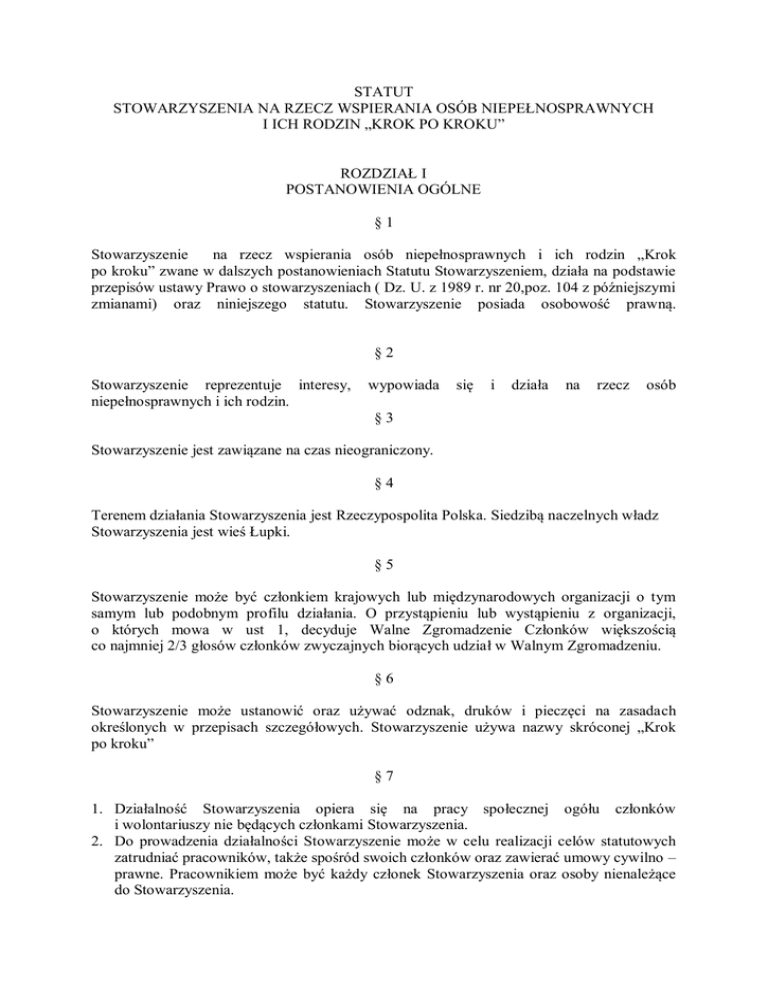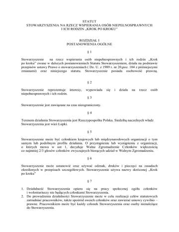 STATUT STOWARZYSZENIA NA RZECZ WSPIERANIA OSÓB NIEPEŁNOSPRAWNYCH I ICH RODZIN „KROK PO KROKU” ROZDZIAŁ I POSTANOWIENIA OGÓLNE §1 Stowarzyszenie na rzecz wspierania osób niepełnosprawnych i ich rodzin „Krok po kroku” zwane w dalszych postanowieniach Statutu Stowarzyszeniem, działa na podstawie przepisów ustawy Prawo o stowarzyszeniach ( Dz. U. z 1989 r. nr 20,poz. 104 z późniejszymi zmianami) oraz niniejszego statutu. Stowarzyszenie posiada osobowość prawną. §2 Stowarzyszenie reprezentuje interesy, niepełnosprawnych i ich rodzin. wypowiada się i działa na rzecz osób §3 Stowarzyszenie jest zawiązane na czas nieograniczony. §4 Terenem działania Stowarzyszenia jest Rzeczypospolita Polska. Siedzibą naczelnych władz Stowarzyszenia jest wieś Łupki. §5 Stowarzyszenie może być członkiem krajowych lub międzynarodowych organizacji o tym samym lub podobnym profilu działania. O przystąpieniu lub wystąpieniu z organizacji, o których mowa w ust 1, decyduje Walne Zgromadzenie Członków większością co najmniej 2/3 głosów członków zwyczajnych biorących udział w Walnym Zgromadzeniu. §6 Stowarzyszenie może ustanowić oraz używać odznak, druków i pieczęci na zasadach określonych w przepisach szczegółowych. Stowarzyszenie używa nazwy skróconej „Krok po kroku” §7 1. Działalność Stowarzyszenia opiera się na pracy społecznej ogółu członków i wolontariuszy nie będących członkami Stowarzyszenia. 2. Do prowadzenia działalności Stowarzyszenie może w celu realizacji celów statutowych zatrudniać pracowników, także spośród swoich członków oraz zawierać umowy cywilno – prawne. Pracownikiem może być każdy członek Stowarzyszenia oraz osoby nienależące do Stowarzyszenia. 3. Stowarzyszenie może prowadzić działalność gospodarczą, z której dochód będzie służyć wyłącznie realizacji celów statutowych. ROZDZIAŁ II CELE I ŚRODKI DZIAŁANIA §8 Celem Stowarzyszenia jest podejmowanie wszelkich inicjatyw mających na celu pomoc oraz tworzenie optymalnych warunków rozwoju osób niepełnosprawnych i ich rodzin, a w szczególności: 1. Wspieranie działalności edukacyjno-wychowawczej Specjalnego Ośrodka Szkolno Wychowawczego w Łupkach. 2. Pozyskiwanie partnerów do tworzenia miejsc pracy dla absolwentów Ośrodka. 3. Podejmowanie działań (tworzenie warunków) w celu pomocy absolwentom Ośrodka w wyborze kariery zawodowej. 4. Wyrównywanie szans dzieci niepełnosprawnych. 5. Działanie na rzecz dzieci ze środowisk zagrożonych patologią społeczną. 6. Organizowanie letniego i zimowego wypoczynku. 7. Włączanie osób niepełnosprawnych w życie środowiska lokalnego. 8. Wspieranie rodziców i opiekunów w terapii dzieci. 9. Pozyskiwanie i organizacja wolontariatu na rzecz wspierania i rozwijania działań statutowych. 10. Obejmowanie swoją działalnością również osób niepełnosprawnych poszkodowanych w wypadkach komunikacyjnych. 11. Prowadzenie placówek oświatowych i innych działających na rzecz osób niepełnosprawnych. §9 Stowarzyszenie realizuje swoje cele poprzez: 1. Wspieranie osób niepełnosprawnych - organizacja terapii i wczesnej interwencji. 2. Włączanie w życie środowiska lokalnego osób niepełnosprawnych. 3. Współdziałanie z władzami samorządowymi i pozarządowymi w celu tworzenia warunków wszechstronnego rozwoju osób niepełnosprawnych. 4. Organizowanie imprez kulturalnych, sportowych i rekreacyjnych o charakterze integracyjnym dla dzieci i młodzieży niepełnosprawnej i ich rodzin przy pełnym włączeniu w życie grup rówieśniczych i społeczności lokalnej. 5. Promowanie wytworów twórczości osób niepełnosprawnych, powstałej w procesie ich rewalidacji (występy artystyczne, kiermasze, wystawy, gazetka). 6. Organizowanie różnych form aktywności fizycznej i wypoczynku dla osób niepełnosprawnych i ich opiekunów. 7. Prowadzenie wielospecjalistycznej pomocy w zakresie wspomagania rozwoju osób niepełnosprawnych, rehabilitacji i terapii w formie edukacji, rewalidacji i wychowania. 8. Organizowanie szkoleń i warsztatów dla członków rodzin osób niepełnosprawnych, opiekunów i wolontariuszy bezpośrednio zaangażowanych w proces rewalidacji osób niepełnosprawnych. 9. Inicjowanie i prowadzenie różnorodnych form pomocy rodzinom osób niepełnosprawnych: grup wsparcia, doradztwa, informacji, poradnictwa. 10. Prowadzenie nowatorskich i eksperymentalnych form działalności służących realizacji celów stowarzyszenia. 11. Zachęcanie różnych osób do podejmowania zadań w charakterze wolontariuszy oraz tworzenie warunków dla ich działalności. 12. Prowadzenie działalności informacyjnej i popularyzatorskiej mogącej wpływać na wzrost akceptacji i zrozumienia dzieci i młodzieży niepełnosprawnej. ROZDZIAŁ III CZŁONKOWIE, ICH PRAWA I OBOWIĄZKI § 10 Członkowie Stowarzyszenia dzielą się na : 1. zwyczajnych, 2. wspierających, 3. honorowych. § 11 Członkiem zwyczajnym Stowarzyszenia może być: 1. każda pełnoletnia osoba fizyczna, zdolna do czynności prawnych, która złoży wypełnioną deklarację członkowską i zostanie przyjęta przez Zarząd Stowarzyszenia, 2. członkowie rodzin, opiekunowie prawni oraz przyjaciele osób niepełnosprawnych, a w tym profesjonaliści zaangażowani w pracę dla ich dobra. § 12 Członkiem wspierającym Stowarzyszenia może zostać osoba fizyczna lub prawna zainteresowana działalnością Stowarzyszenia, która zadeklaruje pomoc finansową, rzeczową lub merytoryczną i zostanie przyjęta przez zarząd na podstawie pisemnej deklaracji. § 13 Członkiem honorowym Stowarzyszenia może zostać osoba fizyczna, która wniosła wybitny wkład w działalność i rozwój Stowarzyszenia. Członkostwo honorowe nadaje Walne Zgromadzenie na wniosek Zarządu. § 14 Członek zwyczajny ma prawo : 1. Wybierać i być wybranym do władz Stowarzyszenia. 2. Uczestniczyć z głosem stanowiącym w Walnym Zgromadzeniu. 3. Zgłasza