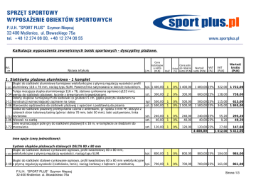 Kalkulacja wyposażenia zewnętrznych boisk sportowych - dyscypliny plażowe. Cena katalogow a netto J.m. [PLN] Ilość Wartość Rabat po rabacie [%] netto [PLN] netto [PLN] kpl. 1 400,00 1 0% 1 400,00 szt. 300,00 2 0% 300,00 600,00 23% kpl 500,00 szt. 1 500,00 1 1 0% 500,00 0% 1 500,00 500,00 23% 1 500,00 23% szt. szt. 240,00 40,00 1 1 0% 0% 240,00 40,00 szt. 120,00 1 0% 120,00 kpl. 800,00 1 0% 800,00 800,00 23% 184,00 984,00 Słupki do siatkówki stalowe cynkowane ogniowo, profil kwadratowy 80 x 80 mm wielofunkcyjne 2-40 z płynną regulacją wysokości (siatkówka, tenis), naciąg korbowy z bębnem i przekładnią. kpl. 700,00 1 0% 700,00 700,00 23% 161,00 861,00 Art. nr Nazwa artykułu Cena jedn. VAT [%] Wartość brutto [PLN] VAT [PLN] 1. Siatkówka plażowa aluminiowa - 1 komplet Słupki do siatkówki aluminiowe turniejowe wielofunkcyjne z płynną regulacją wysokości profil aluminiowy 116 x 76 mm, naciąg typu SLIM. Powierzchnia satynowana w kolorze naturalnym. Tuleja mocująca słupka aluminiowego 116 x 76, stalowa cynkowana ogniowo (f133 mm), 2-54 wersja do siatkówki plażowej, łącznie z drewnianymi krawędziakami. Osłony słupków turniejowych do siatkówki (o grubości 5 cm, gąbka pokryta skadenem na 2-11 konstrukcji wzmacniającej) zapinane na rzepy 2-46 Stanowisko sędziowskie do siatkówki plażowej z oparciem i podstawką do pisania Siatka do siatkówki plażowej profesjonalna czarna z antenkami, gr. splotu 3 mm PP, obszyta z czterech stron kolorową taśmą (górna i dolna 70 mm, boki 50 mm), boki usztywnione, linka 2-73-2 kevlarowa 2-06 Wieszak na siatkę Linie wyznaczające pole gry do siatkówki plażowej 8 x 16 m, w komplecie ze śledziami do 2-72 mocowania 2-101 1 400,00 23% 240,00 23% 40,00 23% 322,00 1 722,00 138,00 738,00 115,00 615,00 345,00 1 845,00 55,20 9,20 295,20 49,20 120,00 23% 27,60 147,60 4 400,00 1 012,00 5 412,00 Inne opcje (ceny jednostkowe): 2-104 System słupków plażowych stalowych DELTA 80 x 80 mm Słupki do siatkówki stalowe cynkowane ogniowo, profil kwadratowy 80 x 80 mm, wielofunkcyjne z płynną regulacją wysokości, naciąg typu SLIM. P.U.H. “SPORT PLUS” Szymon Niepsuj 32-400 Myślenice, ul. Słowackiego 75a tel. +48 12 274 06 55, www.sportplus.pl Strona 1/3 Tuleja mocująca słupka stalowego 80 x 80 mm, stalowa cynkowana ogniowo, wersja do 2-55 siatkówki plażowej, łącznie z drewnianymi krawędziakami. Na specjalne zamówienie wykonujemy słupki w kolorze żółtym szt. 300,00 1 0% 300,00 300,00 23% 69,00 369,00 Tuleje montowane na stałe (betonowane) Tuleja mocująca słupka aluminiowego 116 x 76 mm (f133 mm), stalowa, wersja do siatkówki 2-01-11 plażowej, przedłużona L=100 cm (do zabetonowania) Tuleja mocująca słupka stalowego 80 x 80 mm, stalowa, wersja do siatkówki plażowej, 2-04-11 przedłużona L=100 cm (do zabetonowania) szt. 120,00 1 0% 120,00 120,00 23% 27,60 147,60 szt. 120,00 1 0% 120,00 120,00 23% 27,60 147,60 szt. szt. 300,00 160,00 1 1 0% 0% 300,00 160,00 300,00 23% 160,00 23% 69,00 36,80 369,00 196,80 szt. 180,00 1 0% 180,00 180,00 23% 41,40 221,40 szt. 540,00 110,00 1 1 0% 0% 540,00 110,00 540,00 23% 110,00 23% 124,20 25,30 664,20 135,30 para 4 500,00 para 170,00 0% 4 500,00 0% 170,00 0% 240,00 Akcesoria do siatkówki plażowej Linie wyznaczające pole gry Pesm-H, uniwersalne, wymiar pola: 9x18m, 8x16m, kotwy 2-59-3 mocujące narożniki 2-70 Przyrząd do mierzenia wysokości siatki Siatki do siatkówki plażowej 2-75 Siatka do siatkówki plażowej treningowa, gr. splotu 3 mm PP Siatka turniejowa plażowa Pesm-H, czarna z żółtą taśmą obszytą z czterech stron, gr. splotu 3 2-74 mm PP, boki usztywnione, linka kevlarowa 2-47 Antenki jednoczęściowe Pesm-H, plażowe - żółte para 2. Piłka ręczna plażowa - 1 komplet Bramki do piłki ręcznej plażowej 3 x 2 m, profil aluminiowy 80/80 mm, kolor bramek żółty, z składanymi łukami pałąkowymi, mocowane w tulejach osadzanych w piasku. W komplecie tuleje z krzyżakiem. Siatka do bramki do piłki ręcznej plażowej 3 x 2 m, gr. splotu 3 mm PP, głębokość 80/100 cm Linie wyznaczające pole gry do piłki ręcznej plażowej, wymiar: 27x12m, kolor niebieski kpl 240,00 1 1 1 3-202 Siatki do piłki ręcznej plażowej Siatka do bramki do piłki ręcznej plażowej Pesm-H, 3 x 2 m, gr. splotu 4 mm PP, głębokość 100 cm, kolor żółty para 300,00 1 0% 300,00 300,00 23% 69,00 369,00 3-304 Linie do piłki ręcznej plażowej Linie wyznaczające pole gry do piłki ręcznej plażowej Pesm-H, wymiar: 27x12m, kolor ciemnoniebieski 590,00 1 0% 590,00 590,00 23% 135,70 725,70 3-201 3-303 3-305 4 500,00 23% 1 035,00 5 535,00 170,00 23% 39,10 209,10 240,00 23% 55,20 295,20 4 910,00 1 129,30 6 039,30 Inne opcje (ceny jednostkowe): kpl 3. Piłka nożna plażowa - 1 komplet P.U.H. “SPORT PLUS” Szymon Niepsuj 32-400 Myślenice, ul. Słowackiego 75a tel. +48 12 274 06 55, www.sportplus.pl Strona 2/3 Bramki do piłki nożnej plażowej 5,50 x 2,20 m, profil aluminiowy 120/100 mm, kolor bramek żółty, z składanymi łukami pałąkowymi, mocowane w tulejach osadzanych w piasku. W 9-33 komplecie tuleje z krzyżakiem. 9-14 Siatka do bramki do piłki nożnej plażowej 5,50 x 2,20 m treningowa, gr. splotu 3 mm PP 9-20-3 Linie wyznaczające pole gry do piłki nożnej plażowej, wymiar 27,5 x 36,5 m, kolor niebieski para 5 500,00 para 300,00 kpl 300,00 1 1 1 0% 5 500,00 0% 300,00 0% 300,00 5 500,00 23% 1 265,00 6 765,00 300,00 23% 69,00 369,00 300,00 23% 69,00 369,00 6 100,00 1 403,00 7 503,00 Siatki do piłki nożnej plażowej Siatka do bramki do piłki nożnej plażowej Pesm-H, 5,70 x 2,25 m, gr. splotu 4 mm PP, para 9-33-14 głębokość 80 cm, kolor czarny Siatka do bramki do piłki nożnej plażowej 5,50 x 2,20 m z obciążeniem 400 g, gr. splotu 3 mm para 9-14-4 PP 720,00 1 0% 720,00 720,00 23% 165,60 885,60 410,00 1 0% 410,00 410,00 23% 94,30 504,30 kpl 1 610,00 1 0% 1 610,00 1 610,00 23% 370,30 1 980,30 netto VAT Inne opcje (ceny jednostkowe): 9-33-15 Linie d