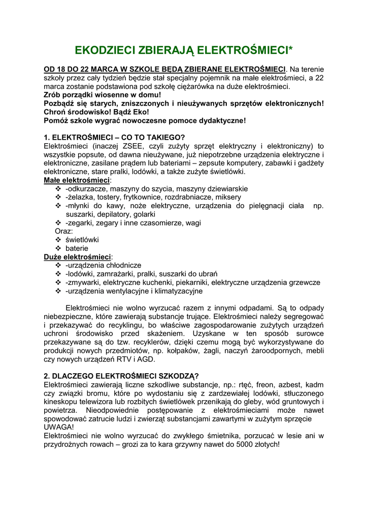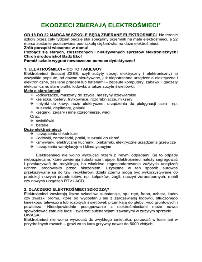 EKODZIECI ZBIERAJĄ ELEKTROŚMIECI* OD 18 DO 22 MARCA W SZKOLE BĘDĄ ZBIERANE ELEKTROŚMIECI. Na terenie szkoły przez cały tydzień będzie stał specjalny pojemnik na małe elektrośmieci, a 22 marca zostanie podstawiona pod szkołę ciężarówka na duże elektrośmieci. Zrób porządki wiosenne w domu! Pozbądź się starych, zniszczonych i nieużywanych sprzętów elektronicznych! Chroń środowisko! Bądź Eko! Pomóż szkole wygrać nowoczesne pomoce dydaktyczne! 1. ELEKTROŚMIECI – CO TO TAKIEGO? Elektrośmieci (inaczej ZSEE, czyli zużyty sprzęt elektryczny i elektroniczny) to wszystkie popsute, od dawna nieużywane, już niepotrzebne urządzenia elektryczne i elektroniczne, zasilane prądem lub bateriami – zepsute komputery, zabawki i gadżety elektroniczne, stare pralki, lodówki, a także zużyte świetlówki. Małe elektrośmieci: -odkurzacze, maszyny do szycia, maszyny dziewiarskie -żelazka, tostery, frytkownice, rozdrabniacze, miksery -młynki do kawy, noże elektryczne, urządzenia do pielęgnacji ciała np. suszarki, depilatory, golarki -zegarki, zegary i inne czasomierze, wagi Oraz: świetlówki baterie Duże elektrośmieci: -urządzenia chłodnicze -lodówki, zamrażarki, pralki, suszarki do ubrań -zmywarki, elektryczne kuchenki, piekarniki, elektryczne urządzenia grzewcze -urządzenia wentylacyjne i klimatyzacyjne Elektrośmieci nie wolno wyrzucać razem z innymi odpadami. Są to odpady niebezpieczne, które zawierają substancje trujące. Elektrośmieci należy segregować i przekazywać do recyklingu, bo właściwe zagospodarowanie zużytych urządzeń uchroni środowisko przed skażeniem. Uzyskane w ten sposób surowce przekazywane są do tzw. recyklerów, dzięki czemu mogą być wykorzystywane do produkcji nowych przedmiotów, np. kołpaków, żagli, naczyń żaroodpornych, mebli czy nowych urządzeń RTV i AGD. 2. DLACZEGO ELEKTROŚMIECI SZKODZĄ? Elektrośmieci zawierają liczne szkodliwe substancje, np.: rtęć, freon, azbest, kadm czy związki bromu, które po wydostaniu się z zardzewiałej lodówki, stłuczonego kineskopu telewizora lub rozbitych świetlówek przenikają do gleby, wód gruntowych i powietrza. Nieodpowiednie postępowanie z elektrośmieciami może nawet spowodować zatrucie ludzi i zwierząt substancjami zawartymi w zużytym sprzęcie UWAGA! Elektrośmieci nie wolno wyrzucać do zwykłego śmietnika, porzucać w lesie ani w przydrożnych rowach – grozi za to kara grzywny nawet do 5000 złotych! 3. RECYKLING ELEKTROŚMIECI! Recykling to proces odzyskiwania i przetwarzania surowców oraz wykorzystywanie ich do produkcji nowych urządzeń. Ze zużytego komputera i monitora możemy odzyskać cenne surowce: szkło i tworzywo sztuczne oraz metale szlachetne: aluminium, stal, ołów i miedź. Z tych surowców może być wyprodukowany nowy komputer. Ponowne użycie odzyskanych surowców zdecydowanie zmniejsza stopień wykorzystania zasobów naturalnych, ogranicza zanieczyszczenie środowiska i przyczynia się do obniżenia kosztów technologicznych, dzięki czemu nowe sprzęty są tańsze. Recykling elektrośmieci jest pożyteczny. Materiały ze zużytych telefonów komórkowych: złoto, platynę, srebro, miedź, można wykorzystać do produkcji czajników, plomb dentystycznych oraz instrumentów muzycznych. CIEKAWOSTKI Jeden mały telefon komórkowy zawiera całą tablicę Mendelejewa, m.in.: kadm, ołów, rtęć, polichlorek winylu, złoto, tantal i chrom. Jedna bateria srebrowa jest w stanie zanieczyścić około 1 m3 gleby oraz 400 litrów wody. Gdyby wszyscy Europejczycy wymienili tradycyjne żarówki na świetlówki energooszczędne, zmniejszyliby roczną emisję dwutlenku węgla o 57 milionów ton. Jest to ilość pochłaniana w ciągu roku przez niemal 3 miliardy dorodnych drzew rosnących na obszarze 9 milionów hektarów lasu – tyle, ile wynosi powierzchnia wszystkich lasów w Polsce. Gdyby wymieniane rocznie telefony komórkowe ustawić jeden na drugim, utworzyłyby kolumnę 1000 razy wyższą niż Pałac Kultury i Nauki w Warszawie! Jeśli podobnie postąpilibyśmy z wymienianymi każdego roku telewizorami, utworzyłyby one kolumnę 50 razy wyższą niż Mount Everest. Zużytą świetlówkę możemy aż w 90 procentach wykorzystać do produkcji nowej lampy. W procesach odzysku otrzymuje się wiele cennych surowców: szkło, aluminiowe końcówki, luminofor i metaliczną rtęć – nic się nie marnuje. Więcej informacji na stronie: http://elektrosmieci.pl/ http://www.moje-miasto-bez-elektrosmieci.pl/ *Tekst z poradnika rodzinnego o elektrośmieciach ze strony http://www.moje-miastobez-elektrosmieci.pl/wp-content/uploads/2012/01/MMBE_poradnik_rodzice.pdf