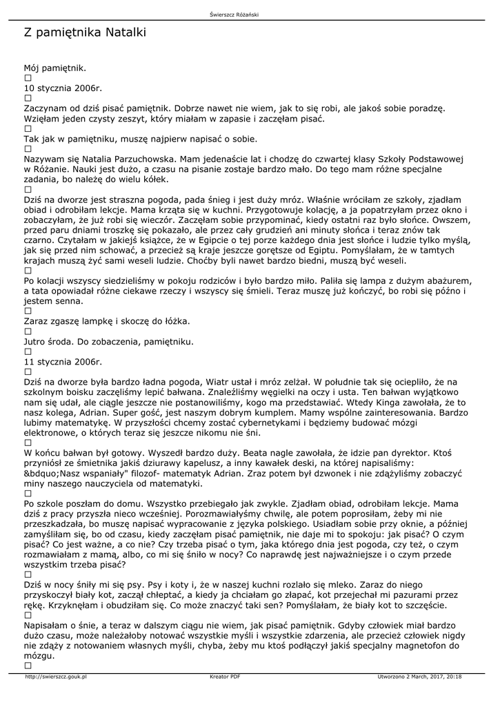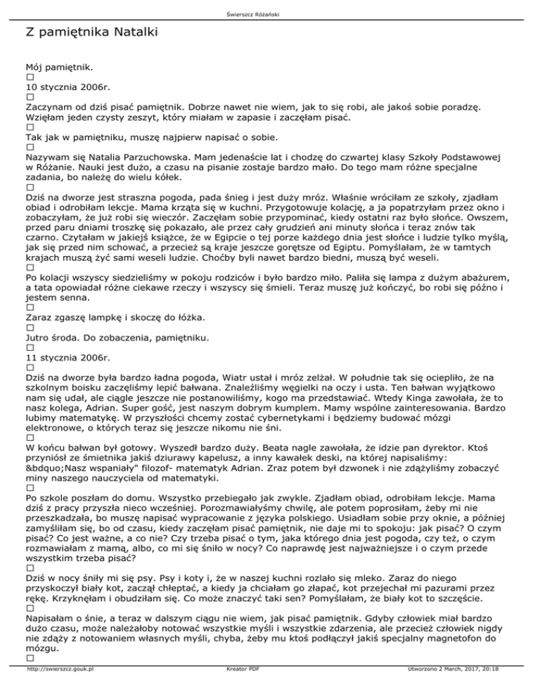 Świerszcz Różański Z pamiętnika Natalki Mój pamiętnik. 10 stycznia 2006r. Zaczynam od dziś pisać pamiętnik. Dobrze nawet nie wiem, jak to się robi, ale jakoś sobie poradzę. Wzięłam jeden czysty zeszyt, który miałam w zapasie i zaczęłam pisać. Tak jak w pamiętniku, muszę najpierw napisać o sobie. Nazywam się Natalia Parzuchowska. Mam jedenaście lat i chodzę do czwartej klasy Szkoły Podstawowej w Różanie. Nauki jest dużo, a czasu na pisanie zostaje bardzo mało. Do tego mam różne specjalne zadania, bo należę do wielu kółek. Dziś na dworze jest straszna pogoda, pada śnieg i jest duży mróz. Właśnie wróciłam ze szkoły, zjadłam obiad i odrobiłam lekcje. Mama krząta się w kuchni. Przygotowuje kolację, a ja popatrzyłam przez okno i zobaczyłam, że już robi się wieczór. Zaczęłam sobie przypominać, kiedy ostatni raz było słońce. Owszem, przed paru dniami troszkę się pokazało, ale przez cały grudzień ani minuty słońca i teraz znów tak czarno. Czytałam w jakiejś książce, że w Egipcie o tej porze każdego dnia jest słońce i ludzie tylko myślą, jak się przed nim schować, a przecież są kraje jeszcze gorętsze od Egiptu. Pomyślałam, że w tamtych krajach muszą żyć sami weseli ludzie. Choćby byli nawet bardzo biedni, muszą być weseli. Po kolacji wszyscy siedzieliśmy w pokoju rodziców i było bardzo miło. Paliła się lampa z dużym abażurem, a tata opowiadał różne ciekawe rzeczy i wszyscy się śmieli. Teraz muszę już kończyć, bo robi się późno i jestem senna. Zaraz zgaszę lampkę i skoczę do łóżka. Jutro środa. Do zobaczenia, pamiętniku. 11 stycznia 2006r. Dziś na dworze była bardzo ładna pogoda, Wiatr ustał i mróz zelżał. W południe tak się ociepliło, że na szkolnym boisku zaczęliśmy lepić bałwana. Znaleźliśmy węgielki na oczy i usta. Ten bałwan wyjątkowo nam się udał, ale ciągle jeszcze nie postanowiliśmy, kogo ma przedstawiać. Wtedy Kinga zawołała, że to nasz kolega, Adrian. Super gość, jest naszym dobrym kumplem. Mamy wspólne zainteresowania. Bardzo lubimy matematykę. W przyszłości chcemy zostać cybernetykami i będziemy budować mózgi elektronowe, o których teraz się jeszcze nikomu nie śni. W końcu bałwan był gotowy. Wyszedł bardzo duży. Beata nagle zawołała, że idzie pan dyrektor. Ktoś przyniósł ze śmietnika jakiś dziurawy kapelusz, a inny kawałek deski, na której napisaliśmy: „Nasz wspaniały" filozof- matematyk Adrian. Zraz potem był dzwonek i nie zdążyliśmy zobaczyć miny naszego nauczyciela od matematyki. Po szkole poszłam do domu. Wszystko przebiegało jak zwykle. Zjadłam obiad, odrobiłam lekcje. Mama dziś z pracy przyszła nieco wcześniej. Porozmawiałyśmy chwilę, ale potem poprosiłam, żeby mi nie przeszkadzała, bo muszę napisać wypracowanie z języka polskiego. Usiadłam sobie przy oknie, a później zamyśliłam się, bo od czasu, kiedy zaczęłam pisać pamiętnik, nie daje mi to spokoju: jak pisać? O czym pisać? Co jest ważne, a co nie? Czy trzeba pisać o tym, jaka którego dnia jest pogoda, czy też, o czym rozmawiałam z mamą, albo, co mi się śniło w nocy? Co naprawdę jest najważniejsze i o czym przede wszystkim trzeba pisać? Dziś w nocy śniły mi się psy. Psy i koty i, że w naszej kuchni rozlało się mleko. Zaraz do niego przyskoczył biały kot, zaczął chłeptać, a kiedy ja chciałam go złapać, kot przejechał mi pazurami przez rękę. Krzyknęłam i obudziłam się. Co może znaczyć taki sen? Pomyślałam, że biały kot to szczęście. Napisałam o śnie, a teraz w dalszym ciągu nie wiem, jak pisać pamiętnik. Gdyby człowiek miał bardzo dużo czasu, może należałoby notować wszystkie myśli i wszystkie zdarzenia, ale przecież człowiek nigdy nie zdąży z notowaniem własnych myśli, chyba, żeby mu ktoś podłączył jakiś specjalny magnetofon do mózgu. http://swierszcz.gouk.pl Kreator PDF Utworzono 2 March, 2017, 20:18 Świerszcz Różański Siedzę przed oknem. Od strony lasu lecą kawki. Chciałabym być ptakiem i móc latać. Ale pociągnęło od okna chłodem. Brrr, zimno! Jak zimno musi być takiej kawce na gałęzi w lesie. Już lepiej być człowiekiem i mieć ciepłe mieszkanie. A najlepiej w zimie pod kołderką, tak na chwilę przed zaśnięciem. Choć dużo jest jeszcze różnych, fajnych rzeczy. Lubię biec ulicą tak, żeby się zdawało, że same nogi mnie niosą, jeszcze chwila, a oderwę się i będę leciała nad ziemią. Myślałam jeszcze o tylu rzeczach, o tych różnych sprawach, ale naprawdę nie udało mi się wszystkiego zanotować. Myśli biegną bardzo szybko. Najważniejsze, że nie zdradziłam swojego pamiętnika. 12 stycznia 2006r. No, więc mamy odwilż. Śnieg stał się ciężki i mokry, a tam, gdzie go mniej, zamienił się w błoto. Jak jest odwilż, to zaraz robię się taka ociężała. Do domu nie chce mi się biec, tylko wlokę się, noga za nogą, a książki w teczce ważą dwa razy więcej niż zwykle. Dziś pan od matematyki wyrwał mnie do tablicy. Poszło mi nieźle, dostałam piątkę. Pani od polskiego przyniosła nasze wypracowania i bardzo chwaliła kilka prac, za które postawiła czwórki i piątki. O mojej pracy też wspomniała. Najbardziej podobało się pani wypracowanie Pauliny i czytała je głośno. Paulina pisała o tym, jaka jest szczęśliwa. Chodzi do szkoły i w szkole jest bardzo dobrze. Wszyscy są dla niej mili, a najwięcej to chyba nauczyciele, że takie są piękne pelargonie w oknach i portrety na ścianach i, że bardzo lubi swoje koleżanki i kolegów. Nawet, jeśli któryś łobuzuje, to ona i cała klasa postara się go zawrócić ze złej drogi. Obiad był dziś podły. Mielony kotlet rósł mi w ustach, nie mogłam go przełknąć. Może, to przez odwilż nie mogłam jeść, a może przez moje wypracowanie, z którego nie byłam zadowolona. Wieczorem zrobiło mi się bardzo smutno, sama nie wie