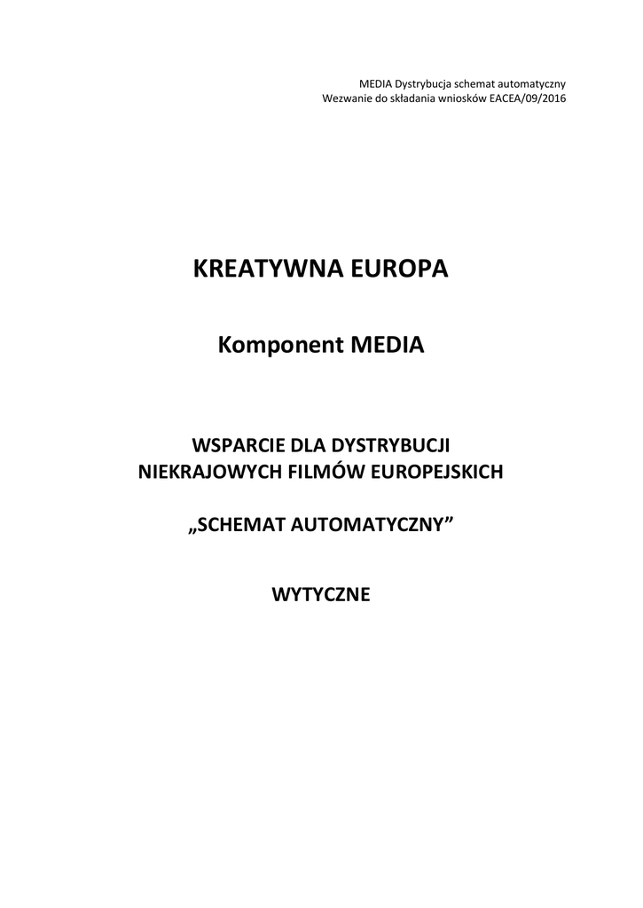 MEDIA Dystrybucja schemat automatyczny Wezwanie do składania wniosków EACEA/09/2016 KREATYWNA EUROPA Komponent MEDIA WSPARCIE DLA DYSTRYBUCJI NIEKRAJOWYCH FILMÓW EUROPEJSKICH „SCHEMAT AUTOMATYCZNY” WYTYCZNE SPIS TREŚCI 1. WPROWADZENIE – ZAŁOŻENIA 2. CELE – TEMATY – PRIORYTETY 2.1 2.2 Cele Projekty, których dotyczy schemat 3. HARMONOGRAM 4. DOSTĘPNY BUDŻET 5. WYMOGI DOPUSZCZALNOŚCI 6. KRYTERIA KWALIFIKUJĄCE 6.1 6.2 7. KRYTERIA WYKLUCZAJĄCE 7.1 7.2 7.3 8. Kwalifikujący się wnioskodawcy Kwalifikujące się działania Wykluczenie z udziału Wykluczenie z przyznania wsparcia Dokumenty uzupełniające KRYTERIA WYBORU 8.1 8.2 Możliwości finansowe Możliwości operacyjne 9. KRYTERIA PRZYZNANIA WSPARCIA 10. ZOBOWIĄZANIA PRAWNE 11. WARUNKI FINANSOWE 11.1 11.2 11.3 11.4 12. Zasady ogólne Formy dofinansowania Harmonogram płatności Gwarancja PROMOCJA 12.1 12.2 12.3 Realizowana przez beneficjentów Realizowana przez Agencję i/lub Komisję Europejską Komunikacja i rozpowszechnianie 13. OCHRONA DANYCH 14. PROCEDURA SKŁADANIA WNIOSKÓW 14.1 14.2 14.3 14.4 14.5 14.6 14.7 Publikacja Rejestracja na portalu dla uczestników Składanie wniosku o dofinansowanie Procedura oceny Decyzja o przyznaniu dofinansowania Obowiązujące regulacje prawne Dane kontaktowe Załączniki: Wszystkie załączniki dostępne są na stronie internetowej EACEA/MEDIA: http://eacea.ec.europa.eu/creative-europe/actions/media_en 2 1. WPROWADZENIE – ZAŁOŻENIA Niniejsze wytyczne oparte są na Rozporządzeniu Nr 1295/2013 Parlamentu Europejskiego i Rady Europejskiej z dnia 11.12.2013 dotyczącym wdrożenia programu wsparcia dla europejskich sektorów kultury i kreatywnych (KREATYWNA EUROPA)1 oraz sprostowaniu z dnia 27.06.20142. Za wdrożenie programu Kreatywna Europa oraz podejmowanie decyzji odnośnie udzielenia wsparcia z funduszy Unii Europejskiej odpowiedzialna jest Komisja Europejska. Agencja Wykonawcza ds. Edukacji, Kultury i Sektora Audiowizualnego, zwana dalej „Agencją”, zarządza podprogramami Kultura i MEDIA w imieniu i pod nadzorem Komisji Europejskiej. Ogólne informacje dotyczące programu Kreatywna Europa dostępne są na stronie internetowej: http://ec.europa.eu/programmes/creative-europe/. 2. CELE – TEMATY- PRIORYTETY 2.1. Cele W ramach określonego celu promowania ponadnarodowego rozpowszechniania filmów, jednym z priorytetów komponentu MEDIA jest: ● wspieranie kinowej dystrybucji poprzez ponadnarodowe działania marketingowe, promocję marek, dystrybucję i prezentację utworów audiowizualnych; Komponent MEDIA zapewnia wsparcie dla: ● ustanowienia systemów wsparcia dystrybucji niekrajowych filmów europejskich poprzez dystrybucję w kinach i na wszelkich innych platformach, a także wsparcia sprzedaży międzynarodowej; w szczególności dotyczy to tworzenia napisów, dubbingu oraz audiodeskrypcji utworów audiowizualnych. 2.2. Projekty, których schemat dotyczy Celem „Schematu automatycznego” jest sprzyjanie i wspieranie szerszej ponadnarodowej dystrybucji niedawno wyprodukowanych filmów europejskich poprzez zapewnienie dofinansowania dystrybutorom, w oparciu o wyniki ich działalności na rynku, dla potrzeb dalszego inwestowania w nowe niekrajowe filmy europejskie. Schemat ma również na celu sprzyjanie nawiązywaniu relacji między sektorem produkcji i dystrybucji i podnoszenie w ten sposób konkurencyjnej pozycji niekrajowych filmów europejskich oraz konkurencyjności firm europejskich. „Schemat automatyczny” realizowany jest w dwóch fazach: 1. Generowanie potencjalnego funduszu w wysokości proporcjonalnej do liczby płatnych biletów wstępu sprzedanych w okresie referencyjnym na niekrajowe filmy europejskie w krajach uczestniczących w komponencie MEDIA, ograniczonego stałym pułapem na film i dostosowanego do każdego kraju. 2. Reinwestycja: potencjalny fundusz stworzony w ten sposób przez każdą firmę musi zostać ponownie zainwestowany w: - koprodukcję niekrajowych filmów europejskich; - nabycie praw do dystrybucji niekrajowych filmów europejskich, np. za pomocą gwarancji minimalnych; i/lub w: 1 2 Opublikowane w Dzienniku Urzędowym Unii Europejskiej w dniu 20.12.2013 (OJ L347/221) Opublikowane w Dzienniku Urzędowym Unii Europejskiej w dniu 27.06.2014 (OJ L189/260) 3 - koszty opracowania (kopie, dubbing i napisy), koszty promocji i reklamy niekrajowych filmów europejskich. 3. HARMONOGRAM 3.1. Harmonogram etapu „generowania”. Etapy a) Publikacja wezwania do składania wniosków Data lub orientacyjny okres Luty 2016 b) Ostateczny termin składania wniosków Piątek 29 kwietnia 2016 - 12:00 (południe, według czasu obowiązującego w Brukseli) Maj – Październik 2016 c) Okres oceny wniosków d) Przekazywanie informacji wnioskodawcom e) f) Podpisanie umowy dofinansowania albo Patrz: etap reinwestycji powiadomienie o decyzji o dofinansowaniu Data rozpoczęcia działania Patrz: etap reinwestycji g) Maksymalny czas trwania działania Listopad 2016 Patrz: etap reinwestycji Ponieważ realizacja tego procesu wymaga wcześniejszej certyfikacji przez krajowe organizacje kontrolujące ilość sprzedanych biletów kinowych, może wystąpić dodatkowe opóźnienie jeśli proces ten zostanie wstrzymany. 3.2. Harmonogram etapu „reinwestycji”. Wnioski dotyczące reinwestycji muszą zostać przesłane do Agencji do 1 sierpnia 2017. Będą one rozpatrywane według kolejności zgłoszeń. Potencjalny fundusz, który nie zostanie dalej zainwestowany przed upływem terminu ostatecznego przepada. Poniższa tabela określa harmonogram w odniesieniu do każdego modułu: Moduł Daty projektu Ostateczny termin prezentacji Okres projektu reinwestycji kwalifikowalności kosztów 1. Koprodukcja Umowa produkcyjna musi W ciągu 3 miesięcy od podpisania Od 1.08.2016 zostać podpisana umowy koprodukcyjnej i nie później do 1.02.2019. najwcześniej 1.08.2016. niż 1.08.2017. 2. Gwarancja minimalna Umowa dystrybucyjna musi W ciągu 3 miesięcy od podpisana Od 1