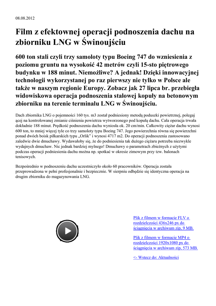 08.08.2012 Film z efektownej operacji podnoszenia dachu na zbiorniku LNG w Świnoujściu 600 ton stali czyli trzy samoloty typu Boeing 747 do wzniesienia z poziomu gruntu na wysokość 42 metrów czyli 15-sto piętrowego budynku w 188 minut. Niemożliwe? A jednak! Dzięki innowacyjnej technologii wykorzystanej po raz pierwszy nie tylko w Polsce ale także w naszym regionie Europy. Zobacz jak 27 lipca br. przebiegła widowiskowa operacja podnoszenia stalowej kopuły na betonowym zbiorniku na terenie terminalu LNG w Świnoujściu. Dach zbiornika LNG o pojemności 160 tys. m3 został podniesiony metodą poduszki powietrznej, polegaj ącej na kontrolowanej zmianie ciśnienia powietrza wytworzonego pod kopułą dachu. Cała operacja trwała dokładnie 188 minut. Prędkość podnoszenia dachu wyniosła ok. 20 cm/min. Całkowity ciężar dachu wynosi 600 ton, to mniej więcej tyle co trzy samoloty typu Boeing 747. Jego powierzchnia równa się powierzchni ponad dwóch boisk piłkarskich typu „Orlik” i wynosi 4717 m2. Do operacji podnoszenia zastosowano zaledwie dwie dmuchawy. Wydawałoby się, że do podniesienia tak dużego ciężaru potrzeba niezwykle wydajnych dmuchaw. Nic jednak bardziej mylnego! Dmuchawy o parametrach zbieżnych z użytymi podczas operacji podniesienia dachu można np. spotkać w okresie zimowym przy tzw. balonach tenisowych. Bezpośrednio w podnoszeniu dachu uczestniczyło około 60 pracowników. Operacja została przeprowadzona w pełni profesjonalnie i bezpiecznie. W sierpniu odbędzie się identyczna operacja na drugim zbiorniku do magazynowania LNG. Plik z filmem w formacie FLV o rozdzielczości 436x246 px do ściągnięcia w archiwum zip, 9 MB. Plik z filmem w formacie MP4 o rozdzielczości 1920x1080 px do ściągnięcia w archiwum zip, 573 MB. <- Wstecz do: Aktualności