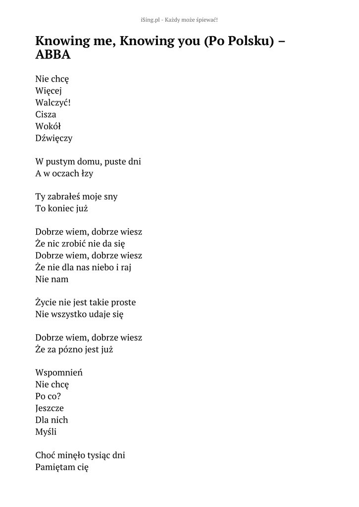 iSing.pl - Każdy może śpiewać! Knowing me, Knowing you (Po Polsku) – ABBA Nie chcę Więcej Walczyć! Cisza Wokół Dźwięczy W pustym domu, puste dni A w oczach łzy Ty zabrałeś moje sny To koniec już Dobrze wiem, dobrze wiesz Że nic zrobić nie da się Dobrze wiem, dobrze wiesz Że nie dla nas niebo i raj Nie nam Życie nie jest takie proste Nie wszystko udaje się Dobrze wiem, dobrze wiesz Że za pózno jest już Wspomnień Nie chcę Po co? Jeszcze Dla nich Myśli Choć minęło tysiąc dni Pamiętam cię W pustym domu, puste dni Wciąż męczą mnie Dobrze wiem, dobrze wiesz Że nic zrobić nie da się Dobrze wiem, dobrze wiesz Że nie dla nas niebo i raj Nie nam Życie nie jest takie proste Nie wszystko udaje się Dobrze wiem, dobrze wiesz Że za późno jest już Dobrze wiem, dobrze wiesz Że nic zrobić nie da się Dobrze wiem, dobrze wiesz Że nie dla nas niebo i raj Nie nam Życie nie jest takie proste Nie wszystko udaje się Dobrze wiem, dobrze wiesz Że za późno jest już Słowa: brak danych Muzyka: brak danych Rok wydania: brak danych Płyta: brak danych