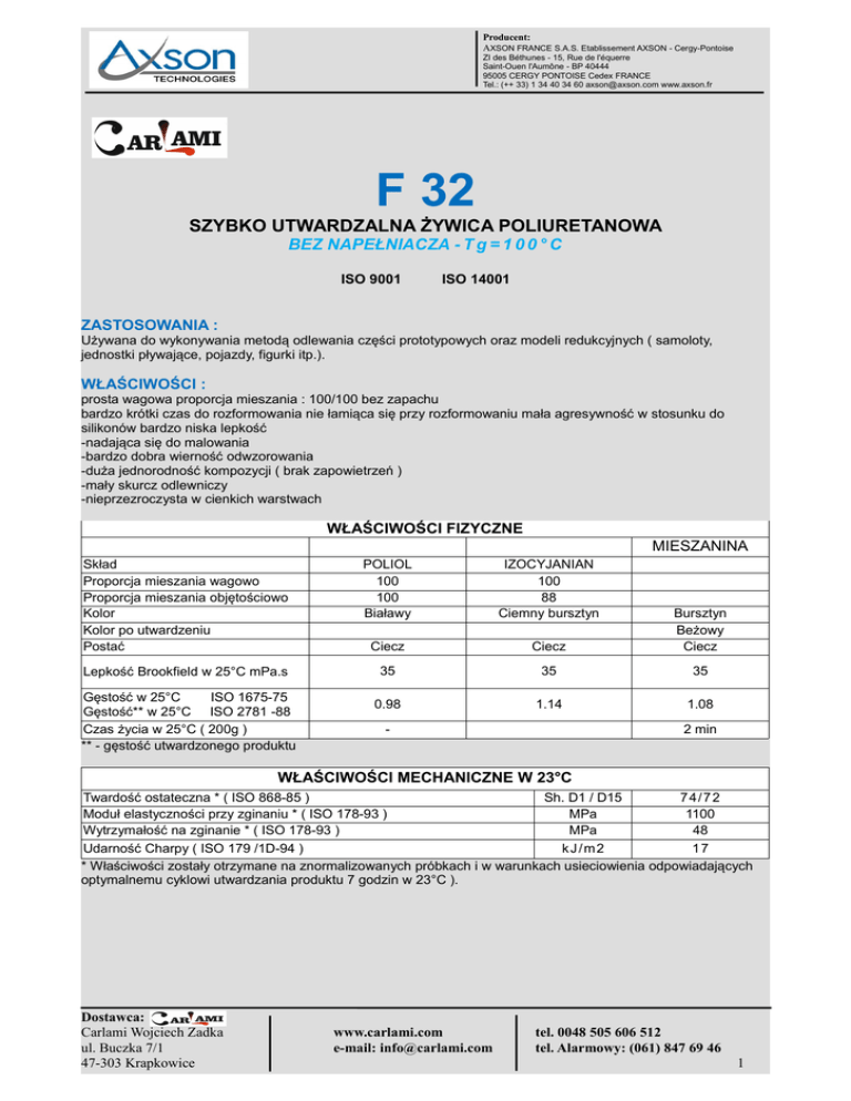 Producent: AXSON FRANCE S.A.S. Etablissement AXSON - Cergy-Pontoise ZI des Béthunes - 15, Rue de l'équerre Saint-Ouen l'Aumône - BP 40444 95005 CERGY PONTOISE Cedex FRANCE Tel.: (++ 33) 1 34 40 34 60 [email protected] www.axson.fr F 32 SZYBKO UTWARDZALNA ŻYWICA POLIURETANOWA BEZ NAPEŁNIACZA - T g = 1 0 0 ° C ISO 9001 ISO 14001 ZASTOSOWANIA : Używana do wykonywania metodą odlewania części prototypowych oraz modeli redukcyjnych ( samoloty, jednostki pływające, pojazdy, figurki itp.). WŁAŚCIWOŚCI : prosta wagowa proporcja mieszania : 100/100 bez zapachu bardzo krótki czas do rozformowania nie łamiąca się przy rozformowaniu mała agresywność w stosunku do silikonów bardzo niska lepkość -nadająca się do malowania -bardzo dobra wierność odwzorowania -duża jednorodność kompozycji ( brak zapowietrzeń ) -mały skurcz odlewniczy -nieprzezroczysta w cienkich warstwach WŁAŚCIWOŚCI FIZYCZNE MIESZANINA Skład Proporcja mieszania wagowo Proporcja mieszania objętościowo Kolor Kolor po utwardzeniu Postać POLIOL 100 100 Białawy IZOCYJANIAN 100 88 Ciemny bursztyn Ciecz Ciecz Bursztyn Beżowy Ciecz Lepkość Brookfield w 25°C mPa.s 35 35 35 0.98 1.14 1.08 Gęstość w 25°C ISO 1675-75 Gęstość** w 25°C ISO 2781 -88 Czas życia w 25°C ( 200g ) ** - gęstość utwardzonego produktu - 2 min WŁAŚCIWOŚCI MECHANICZNE W 23°C Twardość ostateczna * ( ISO 868-85 ) Sh. D1 / D15 74 / 7 2 Moduł elastyczności przy zginaniu * ( ISO 178-93 ) MPa 1100 Wytrzymałość na zginanie * ( ISO 178-93 ) MPa 48 Udarność Charpy ( ISO 179 /1D-94 ) kJ/m2 17 * Właściwości zostały otrzymane na znormalizowanych próbkach i w warunkach usieciowienia odpowiadających optymalnemu cyklowi utwardzania produktu 7 godzin w 23°C ). Dostawca: Carlami Wojciech Zadka ul. Buczka 7/1 47-303 Krapkowice www.carlami.com e-mail: [email protected] tel. 0048 505 606 512 tel. Alarmowy: (061) 847 69 46 1 Producent: AXSON FRANCE S.A.S. Etablissement AXSON - Cergy-Pontoise ZI des Béthunes - 15, Rue de l'équerre Saint-Ouen l'Aumône - BP 40444 95005 CERGY PONTOISE Cedex FRANCE Tel.: (++ 33) 1 34 40 34 60 [email protected] www.axson.fr F 32 SZYBKO UTWARDZALNA ŻYWICA POLIURETANOWA BEZ NAPEŁNIACZA -Tg = 100°C WŁAŚCIWOŚCI MECHANICZNE I TERMICZNE Temperatura użytkowania Temperatura zeszklenia Tg Zalecana grubość odlewu Czas rozformowania (2 mm ) Czas całkowitego utwardzenia - TMA-Mettler - - °C °C mm min dni - 20 ; + 80 100 <5 ok. 20 3 WYTYCZNE STOSOWANIA : Dobrze wymieszać poliol w temperaturze pokojowej min. 18°C ( ujednorodnienie do stanu zawiesiny ) a następnie przygotować mieszaninę stosując się do podanej proporcji. Przed dokonaniem odlewu upewnić się że formy są pozbawione wilgoci. Odlewać ręcznie lub próżniowo . Elastomer silikonowy ESSIL 125 szczególnie nadaje się do odlewania elementów z F 32 HIGIENA PRACY : Zwykłe środki bezpieczeństwa powinny być zachowane podczas użytkowania produktu, a mianowicie: -lokal o dobrej wentylacji -używanie rękawic i okularów ochronnych Dokładniejsze informacje zawarte są w instrukcji o bezpieczeństwie pracy. PRZECHOWYWANIE : Okres składowania wynosi 12 miesięcy w suchym miejscu i w oryginalnych nie otwartych opakowaniach w temperaturze 15 - 25°C. Napoczęte opakowania zaleca się zamykać pod osłoną azotu lub innego gazu obojętnego. GWARANCJA : Wszystkie informacje zawarte powyżej są rezultatem badań i testów przeprowadzonych w naszym laboratorium w ściśle określonych warunkach. Użytkownik ponosi pełną odpowiedzialność za określenie przydatności (w swoich warunkach) produktu AXSON (przed dokonaniem zakupu) do proponowanego zastosowania. AXSON gwarantuje zgodność swojego produktu z jego specyfikacją lecz nie może zagwarantować jego kompatybilności z jakimkolwiek szczególnym zastosowaniem. AXSON odrzuca jakąkolwiek odpowiedzialność za zniszczenia lub wypadki które spowodowane zostały użyciem jego produktów. Odpowiedzialność AXSON jest ściśle ograniczona do zwrotu pieniędzy lub wymiany produktu nie zgodnego z jego specyfikacją. Dostawca: Carlami Wojciech Zadka ul. Buczka 7/1 47-303 Krapkowice www.carlami.com e-mail: [email protected] tel. 0048 505 606 512 tel. Alarmowy: (061) 847 69 46 2