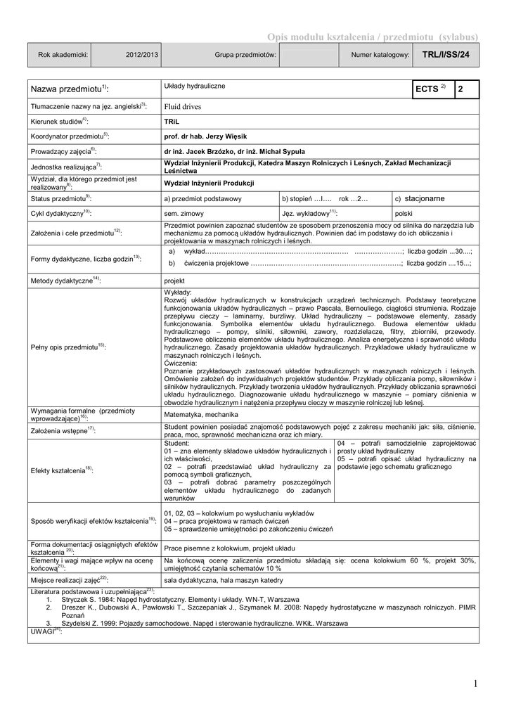 Opis modułu kształcenia / przedmiotu (sylabus) Rok akademicki: 2012/2013 Grupa przedmiotów: Numer katalogowy: Układy hydrauliczne Nazwa przedmiotu1): 3) TRL/I/SS/24 ECTS 2) 2 Fluid drives Tłumaczenie nazwy na jęz. angielski : 4) Kierunek studiów : TRiL 5) Koordynator przedmiotu : prof. dr hab. Jerzy Więsik 6) Prowadzący zajęcia : dr inż. Jacek Brzózko, dr inż. Michał Sypuła Jednostka realizująca : Wydział Inżynierii Produkcji, Katedra Maszyn Rolniczych i Leśnych, Zakład Mechanizacji Leśnictwa Wydział, dla którego przedmiot jest 8) realizowany : Wydział Inżynierii Produkcji 7) 9) Status przedmiotu : b) stopień …I…. Cykl dydaktyczny : sem. zimowy Jęz. wykładowy : Założenia i cele przedmiotu : Przedmiot powinien zapoznać studentów ze sposobem przenoszenia mocy od silnika do narzędzia lub mechanizmu za pomocą układów hydraulicznych. Powinien dać im podstawy do ich obliczania i projektowania w maszynach rolniczych i leśnych. 10) 12) 13) Formy dydaktyczne, liczba godzin : 14) Metody dydaktyczne : rok …2… c) stacjonarne a) przedmiot podstawowy 11) polski a) wykład……………………………………………………… …………………; liczba godzin ...30....; b) ćwiczenia projektowe …………………………………………………………; liczba godzin ....15...; projekt Pełny opis przedmiotu : Wykłady: Rozwój układów hydraulicznych w konstrukcjach urządzeń technicznych. Podstawy teoretyczne funkcjonowania układów hydraulicznych – prawo Pascala, Bernouliego, ciągłości strumienia. Rodzaje przepływu cieczy – laminarny, burzliwy. Układ hydrauliczny – podstawowe elementy, zasady funkcjonowania. Symbolika elementów układu hydraulicznego. Budowa elementów układu hydraulicznego – pompy, silniki, siłowniki, zawory, rozdzielacze, filtry, zbiorniki, przewody. Podstawowe obliczenia elementów układu hydraulicznego. Analiza energetyczna i sprawność układu hydraulicznego. Zasady projektowania układów hydraulicznych. Przykładowe układy hydrauliczne w maszynach rolniczych i leśnych. Ćwiczenia: Poznanie przykładowych zastosowań układów hydraulicznych w maszynach rolniczych i leśnych. Omówienie założeń do indywidualnych projektów studentów. Przykłady obliczania pomp, siłowników i silników hydraulicznych. Przykłady tworzenia układów hydraulicznych. Przykłady obliczania sprawności układu hydraulicznego. Diagnozowanie układu hydraulicznego w maszynie – pomiary ciśnienia w obwodzie hydraulicznym i natężenia przepływu cieczy w maszynie rolniczej lub leśnej. Wymagania formalne (przedmioty 16) wprowadzające) : Matematyka, mechanika 15) Student powinien posiadać znajomość podstawowych praca, moc, sprawność mechaniczna oraz ich miary. Student: 01 – zna elementy składowe układów hydraulicznych i ich właściwości, 02 – potrafi przedstawiać układ hydrauliczny za pomocą symboli graficznych, 03 – potrafi dobrać parametry poszczególnych elementów układu hydraulicznego do zadanych warunków 17) Założenia wstępne : 18) Efekty kształcenia : 19) Sposób weryfikacji efektów kształcenia : pojęć z zakresu mechaniki jak: siła, ciśnienie, 04 – potrafi samodzielnie zaprojektować prosty układ hydrauliczny 05 – potrafi opisać układ hydrauliczny na podstawie jego schematu graficznego 01, 02, 03 – kolokwium po wysłuchaniu wykładów 04 – praca projektowa w ramach ćwiczeń 05 – sprawdzenie umiejętności po zakończeniu ćwiczeń Forma dokumentacji osiągniętych efektów Prace pisemne z kolokwium, projekt układu 20) kształcenia : Elementy i wagi mające wpływ na ocenę Na końcową ocenę zaliczenia przedmiotu składają się: ocena kolokwium 60 %, projekt 30%, 21) końcową : umiejętność czytania schematów 10 % 22) Miejsce realizacji zajęć : sala dydaktyczna, hala maszyn katedry 23) Literatura podstawowa i uzupełniająca : 1. Stryczek S. 1984: Napęd hydrostatyczny. Elementy i układy. WN-T, Warszawa 2. Dreszer K., Dubowski A., Pawłowski T., Szczepaniak J., Szymanek M. 2008: Napędy hydrostatyczne w maszynach rolniczych. PIMR Poznań 3. Szydelski Z. 1999: Pojazdy samochodowe. Napęd i sterowanie hydrauliczne. WKiŁ. Warszawa 24) UWAGI : 1 Wskaźniki ilościowe charakteryzujące moduł/przedmiot25) : Szacunkowa sumaryczna liczba godzin pracy studenta (kontaktowych i pracy własnej) niezbędna dla osiągnięcia 18) 2 zakładanych efektów kształcenia - na tej podstawie należy wypełnić pole ECTS : Łączna liczba punktów ECTS, którą student uzyskuje na zajęciach wymagających bezpośredniego udziału nauczycieli akademickich: Łączna liczba punktów ECTS, którą student uzyskuje w ramach zajęć o charakterze praktycznym, takich jak zajęcia laboratoryjne, projektowe, itp.: Tabela zgodności kierunkowych efektów kształcenia efektami przedmiotu Nr /symbol efektu 74 h 1,7 ECTS 0,8 ECTS 26) Wymienione w wierszu efekty kształcenia: 01 zna elementy składowe układów hydraulicznych i ich właściwości Odniesienie do efektów dla programu kształcenia na kierunku K_W10, K_W11, K_W15 02 potrafi przedstawiać układ hydrauliczny za pomocą symboli graficznych K_W11 03 potrafi dobrać parametry poszczególnych elementów układu hydraulicznego do K_W10, K_W11 zadanych warunków 04 potrafi samodzielnie zaprojektować prosty układ hydrauliczny K_U13 05 potrafi opisać układ hydrauliczny na podstawie jego schematu graficznego K_K04, K_K08 2