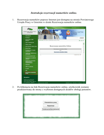 Instrukcja rezerwacji numerków online. 1. Rezerwacja numerków poprzez Internet jest dostępna na stronie Powiatowego Urzędu Pracy w Gnieźnie w dziale Rezerwacja numerków online. 2. Po kliknięciu na link Rezerwacja numerków online, uŜytkownik zostanie przekierowany do strony z wyborem dostępnych działów obsługi petentów. 3. Po wybraniu interesującego nas działu, przechodzimy do okna logowania. JeŜeli wcześniej dokonaliśmy rejestracji to logujemy się do systemu na podstawie posiadanych danych. Natomiast jeŜeli jest to pierwsza rezerwacja online naleŜy się zarejestrować, aby uzyskać dostęp do dalszej części rezerwacji poprzez przycisk Rejestrować. 4. Rejestracja polega na wprowadzeniu wymaganych danych i potwierdzeniu przyciskiem Rejestrować. Po prawidłowym wypełnieniu danych w celu zapewnienia bezpieczeństwa do administratora systemu wysłana jest informacja na podstawie, której administrator aktywuje konto i potwierdza tą operację wiadomością email wysłana na konto uŜytkownika podane podczas rejestracji. 5. 6. Aby się zalogować do systemu rezerwacji online po otrzymaniu w/w emaila wprowadzamy dane i potwierdzamy przyciskiem Wejść. Po poprawnym zalogowaniu ukaŜe nam się okno wyboru, które przykładowo dla Pośredników pracy wygląda następująco: 7. Po wybraniu działu obsługującego daną grupę nazwisk ukazuje się terminarz, w którym wybieramy interesujący nas termin (datę oraz godzinę). 8. Ostatnim etapem rejestracji jest potwierdzenie wybranego terminu, a następnie zapamiętanie lub zapisanie wygenerowanego przez system numeru biletu. Po zgłoszeniu się do Urzędu Pracy klient zostanie wywołany pod swoim numerem przez system zarządzania kolejkowego.