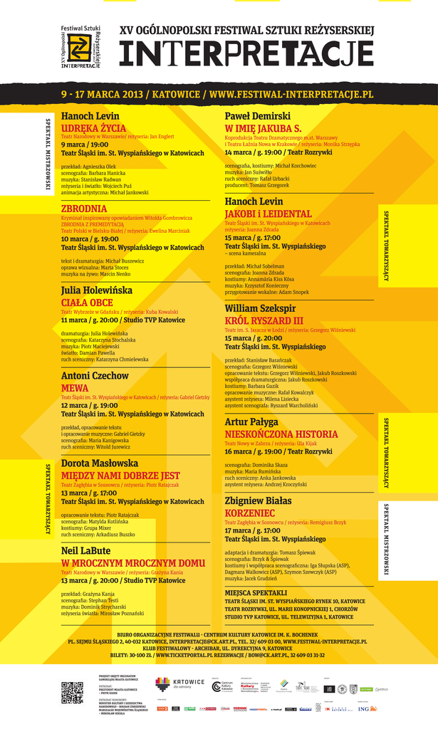 XV OGÓLNOPOLSKI FESTIWAL SZTUKI REŻYSERSKIEJ IMPR EZA TOW AR ZYSZ¥C A FES TIWALU 9 - 17 marca 2013 / Katowice / www.festiwal-interpretacje.pl SPEKTAKL MISTRZOWSKI Hanoch Levin UDRĘKA ŻYCIA Paweł Demirski W IMIĘ JAKUBA S. 9 marca / 19:00 Teatr Śląski im. St. Wyspiańskiego w Katowicach 14 marca / g. 19:00 / Teatr Rozrywki Teatr Narodowy w Warszawie/ reżyseria: Jan Englert przekład: Agnieszka Olek scenografia: Barbara Hanicka muzyka: Stanisław Radwan reżyseria i światło: Wojciech Puś animacja artystyczna: Michał Jankowski Kryminał inspirowany opowiadaniem Witolda Gombrowicza ZBRODNIA Z PREMEDYTACJĄ Teatr Polski w Bielsku-Białej / reżyseria: Ewelina Marciniak 10 marca / g. 19:00 Teatr Śląski im. St. Wyspiańskiego w Katowicach tekst i dramaturgia: Michał Buszewicz oprawa wizualna: Marta Stoces muzyka na żywo: Marcin Nenko Julia Holewińska CIAŁA OBCE Teatr Wybrzeże w Gdańsku / reżyseria: Kuba Kowalski 11 marca / g. 20:00 / Studio TVP Katowice dramaturgia: Julia Holewińska scenografia: Katarzyna Stochalska muzyka: Piotr Maciejewski światło: Damian Pawella ruch sceniczny: Katarzyna Chmielewska Antoni Czechow MEWA Teatr Śląski im. St. Wyspiańskiego w Katowicach / reżyseria: Gabriel Gietzky przekład, opracowanie tekstu i opracowanie muzyczne: Gabriel Gietzky scenografia: Maria Kanigowska ruch sceniczny: Witold Jurewicz Teatr Zagłębia w Sosnowcu / reżyseria: Piotr Ratajczak 13 marca / g. 17:00 Teatr Śląski im. St. Wyspiańskiego w Katowicach opracowanie tekstu: Piotr Ratajczak scenografia: Matylda Kotlińska kostiumy: Grupa Mixer ruch sceniczny: Arkadiusz Buszko Neil LaBute W MROCZNYM MROCZNYM DOMU Teatr Narodowy w Warszawie / reżyseria: Grażyna Kania 13 marca / g. 20:00 / Studio TVP Katowice przekład: Grażyna Kania scenografia: Stephan Testi muzyka: Dominik Strycharski reżyseria światła: Mirosław Poznański Teatr Śląski im. St. Wyspiańskiego w Katowicach reżyseria: Joanna Zdrada 15 marca / g. 17:00 Teatr Śląski im. St. Wyspiańskiego – scena kameralna przekład: Michał Sobelman scenografia: Joanna Zdrada kostiumy: Annamária Kiss Kósa muzyka: Krzysztof Konieczny przygotowanie wokalne: Adam Snopek William Szekspir KRÓL RYSZARD III Teatr im. S. Jaracza w Łodzi / reżyseria: Grzegorz Wiśniewski 15 marca / g. 20:00 Teatr Śląski im. St. Wyspiańskiego przekład: Stanisław Barańczak scenografia: Grzegorz Wiśniewski opracowanie tekstu: Grzegorz Wiśniewski, Jakub Roszkowski współpraca dramaturgiczna: Jakub Roszkowski kostiumy: Barbara Guzik opracowanie muzyczne: Rafał Kowalczyk asystent reżysera: Milena Lisiecka asystent scenografa: Ryszard Warcholiński Artur Pałyga NIESKOŃCZONA HISTORIA Teatr Nowy w Zabrzu / reżyseria: Ula Kijak 16 marca / g. 19:00 / Teatr Rozrywki scenografia: Dominika Skaza muzyka: Maria Rumińska ruch sceniczny: Anka Jankowska asystent reżysera: Andrzej Kroczyński Zbigniew Białas KORZENIEC Teatr Zagłębia w Sosnowcu / reżyseria: Remigiusz Brzyk 17 marca / g. 17:00 Teatr Śląski im. St. Wyspiańskiego adaptacja i dramaturgia: Tomasz Śpiewak scenografia: Brzyk & Śpiewak kostiumy i współpraca scenograficzna: Iga Słupska (ASP), Dagmara Walkowicz (ASP), Szymon Szewczyk (ASP) muzyka: Jacek Grudzień MIEJSCA SPEKTAKLI Teatr Śląski im. St. Wyspiańskiego Rynek 10, Katowice Teatr Rozrywki, ul. Marii Konopnickiej 1, Chorzów Studio TVP Katowice, ul. Telewizyjna 1, Katowice BIURO ORGANIZACYJNE FESTIWALU - Centrum Kultury Katowice im. K. Bochenek pl. Sejmu Śląskiego 2, 40-032 Katowice, [email protected], tel. 32/ 609 03 00, www.festiwal-interpretacje.pl KLUB FESTIWALOWY - Archibar, ul. Dyrekcyjna 9, Katowice BILETY: 30-100 zł / www.ticketportal.pl REZERWACJE / [email protected], 32 609 03 31-32 Projekt objęty Mecenatem Samorządu Miasta Katowice Patronat: Prezydent Miasta Katowice – Piotr Uszok Patronat honorowy: Minister Kultury i Dziedzictwa Narodowego – Bogdan Zdrojewski Marszałek Województwa Śląskiego – Mirosław Sekuła SPEKTAKL MISTRZOWSKI SPEKTAKL TOWARZYSZĄCY Dorota Masłowska MIĘDZY NAMI DOBRZE JEST Hanoch Levin JAKOBI i LEIDENTAL SPEKTAKL TOWARZYSZĄCY 12 marca / g. 19:00 Teatr Śląski im. St. Wyspiańskiego w Katowicach scenografia, kostiumy: Michał Korchowiec muzyka: Jan Suświłło ruch sceniczny: Rafał Urbacki producent: Tomasz Grzegorek SPEKTAKL TOWARZYSZĄCY ZBRODNIA Koprodukcja Teatru Dramatycznego m.st. Warszawy i Teatru Łaźnia Nowa w Krakowie / reżyseria: Monika Strzępka