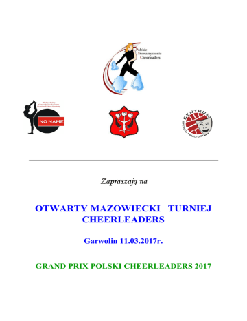 Zapraszają na OTWARTY MAZOWIECKI TURNIEJ CHEERLEADERS Garwolin 11.03.2017r. GRAND PRIX POLSKI CHEERLEADERS 2017 REGULAMIN Nazwa turnieju: OTWARTY MAZOWIECKI TURNIEJ CHEERLEADERS z cyklu GRAND PRIX POLSKI CHEERLEADERS 2017 Miejsce: Hala Sportowa przy SP nr. 1 w Garwolinie, Al. Żwirki i Wigury 16 Data: 11.03.2017 Organizator: Polskie Stowarzyszenie Cheerleaders, Centrum Sportu i Kultury w Garwolinie, MGT – UKS „NO NAME”, Biuro Organizacyjne: 08-400 Garwolin, ul. Korczaka 10 w czasie turnieju Al. Żwirki i Wigury 16 Kierownik Organizacyjny: Zofia Kisiel, tel. 505 166 345 [email protected]; [email protected] [email protected] 1. Formalne zgłoszenie udziału w Otwartym Mazowieckim Turnieju Cheerleaders 2017 Garwolin polega na równoczesnym spełnieniu poniższych warunków: • Dokładne wypełnienie karty zgłoszenia. • Dokonanie stosownych opłat startowych określonych w regulaminie. W turnieju mogą uczestniczyć zawodnicy i trenerzy, którzy są aktualnymi członkami Polskiego Stowarzyszenia Cheerleaders z opłaconą składką członkowską za rok bieżący oraz zespoły niezrzeszone w PSCH (jednorazowa licencja na dany turniej w wysokości 10 zł), zespoły nowe lub zalegające z opłatą muszą uregulować ją dokonując wpłaty na konto Polskiego Stowarzyszenia Cheerleaders: PKO BP 21 1440 1299 0000 0000 0234 1662 2. Turniej rozgrywany będzie w 2 dywizjach: - CHEER Dance /Freestyle Pom/ - zespoły i duety, - POM Dance /Pom Dance Elite, Pom Dance Premier/ - zespoły i duety, KATEGORIE WIEKOWE I LICZEBNOŚĆ ZESPOŁÓW WG KONKURENCJI: Pom Dance: zespoły Pom Dance Elite i Pom Dance Premier Grupa wiekowa wiek Liczebność zespołu Senior II Powyżej 29 6-25 osób Senior 14 – 29 lat Junior 12-16 lat Junior młodszy 7 - 13 lat Dzieci Do 8 lat Cheer Dance: zespoły Freestyle Pom, Grupa wiekowa wiek Liczebność zespołów Senior 14 lat i starsi Freestyle pom 6-25os. Junior 12- 16 lat Junior młodszy Do 13 lat 3. Turniej zostanie rozegrany zgodnie z Przepisami Turniejowymi Polskiego Stowarzyszenia Cheerleaders obowiązującymi od 01.01.2017, dostępnymi na stronie www.psch.pl 4. Każdy podmiot zgłaszając organizatorowi listę startową z danymi personalnymi swoich członków zobowiązany jest podać dane pełnoletniej osoby, która w trakcie turnieju będzie oficjalnym przedstawicielem (kierownikiem) podmiotu. Kierownik podmiotu musi być członkiem PSCh. 4a. Każdy zespół uczestniczący w zawodach musi zapewnić opiekę w czasie trwania turnieju dla wszystkich niepełnoletnich zawodników (1 osoba na 15 zawodników), 4b. Każdy zawodnik musi posiadać legitymację szkolną lub inny dokument ze zdjęciem. 4c. W trakcie rejestracji zawodnicy mogą być weryfikowani na podstawie karty zgłoszeniowej oraz dokumentu ze zdjęciem. 5. Zasady udziału w rywalizacji : 5a. Każdy zawodnik dywizji cheer dance i pom dance , w ramach tej samej dywizji, może jednocześnie brać udział w rywalizacji sportowej zarówno w konkurencji zespołów, jak i duetów w tej samej kategorii wiekowej. 6. Rekwizyty: Pom dance – pompony (min 50% czasu trwania prezentacji) Cheer dance - Freestyle Pom – pompony przez 100% czasu trwania prezentacji 7. Czas trwania prezentacji tanecznej: zespoły Pom Dance, Cheer Dance – max 150 sek. duety Pom Dance, Cheer Dance - max 90 sek 8.Specyfika poszczególnych dywizji i konkurencji zamieszczona w Przepisach Turniejowych PSCh jednoznacznie charakteryzuje poszczególne elementy dozwolone w prezentacjach choreograficznej. 9. Rundy Turnieju Wyróżnia się poniższe rundy turnieju: a) runda eliminacyjna (official practise) b) runda finałowa (finał) 10. Prezentacje taneczne zademonstrowane przez podmioty w eliminacjach, w przypadku zakwalifikowania się do finału, muszą być powtórzone. 11. Niedozwolone jest prezentowanie przez zespół tych samych układów choreograficznych dłużej niż przez jeden sezon licząc od daty ostatnich Mistrzostw Kraju. 12. Noszenie przez zawodników jakiejkolwiek biżuterii podczas wykonywania prezentacji choreograficznej jest surowo zabronione pod rygorem wykluczenia z uczestnictwa w turnieju. 13. Charakterystyka strojów dla danej dywizji/konkurencji dostępna jest w Przepisach Turniejowych PSCh. 14. W przypadku nie stosowania się członków zespołu do przepisów PSCh Sędzia Główny Turnieju ma obowiązek zdyskwalifikowania zespołu. 15. PRÓBA PARKIETU Każdy zespół uczestniczący w Turnieju ma prawo przeprowadzenia próby parkietu Próba parkietu przewidziana jest na 11.03.2017 od godz. 8.00 do 10.15 (godziny mogą ulec zmianie w zależności od ilości zgłoszonych zespołów) 16. Pół godziny przed rozpoczęciem Turnieju odbędzie się odprawa kierowników zespołów. Kolejność startowa będzie odwrotna do kolejności zgłoszeń na Turniej. 17. W trakcie Mistrzostw działają: Komisja Sędziowska, Komisja Techniczna, Komisja Skrutacyjna, Biuro Organizacyjne Turnieju, Służby medyczne, Służby porządkowe. 18. W trakcie Turnieju mają zastosowanie obowiązujące od 01.01.2017r. „Przepisy Turniejowe” oraz „Przepisy Sędziowskie” Polskiego Stowarzyszenia Cheerleaders dostępne na www.psch.pl 19. Niedozwolone jest rejestrowanie zawodów kamerami video. Układy prezentowane podczas Turnieju są własnością choreografów oraz występujących zespołów i chronione są ustawą i ochronie praw autorskich (Dz.U. Nr. 24 poz. 83 z dnia 04.02.1994r). 20. Zespoły biorące udział w Turnieju przyjeżdżają i ubezpieczają się na koszt własny lub instytucji delegującej. 21. Organizatorzy nie ponoszą odpowiedzialności za rzeczy pozostawione w garderobach lub zgubione na terenie hali. 22. W sprawach spornych lub nie ujętych w Regulaminie czy Przepisach Turniejowych decyduje Sędzia Główny Turnieju. 23. Każdy zespół i duet zobowiązany jest dokonać opłaty startowej: opłata za start – 20 zł od uczestnika dla danej konkurencji. Uwaga! Zespoły niezrzeszone – 20 zł od uczestnika na konto organizat