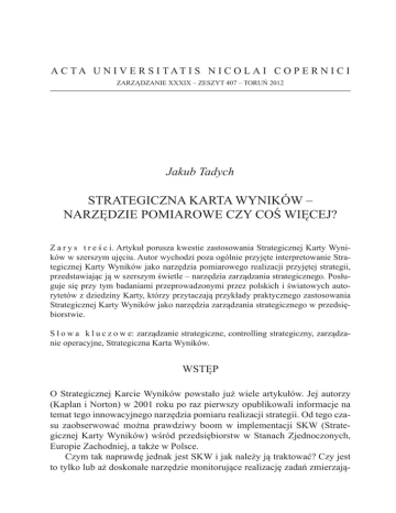 a c ta u n i v e r s i tat i s n i c o l a i c o p e r n i c i zarządzanie XXXIX – zeszyt 407 – toruń 2012 Jakub Tadych Strategiczna karta wyników – narzędzie pomiarowe czy coś więcej? Z a r y s t r e ś c i. Artykuł porusza kwestie zastosowania Strategicznej Karty Wyników w szerszym ujęciu. Autor wychodzi poza ogólnie przyjęte interpretowanie Strategicznej Karty Wyników jako narzędzia pomiarowego realizacji przyjętej strategii, przedstawiając ją w szerszym świetle – narzędzia zarządzania strategicznego. Posługuje się przy tym badaniami przeprowadzonymi przez polskich i światowych autorytetów z dziedziny Karty, którzy przytaczają przykłady praktycznego zastosowania Strategicznej Karty Wyników jako narzędzia zarządzania strategicznego w przedsiębiorstwie. S ł o w a k l u c z o w e: zarządzanie strategiczne, controlling strategiczny, zarządzanie operacyjne, Strategiczna Karta Wyników. WSTĘP O Strategicznej Karcie Wyników powstało już wiele artykułów. Jej autorzy (Kaplan i Norton) w 2001 roku po raz pierwszy opublikowali informacje na temat tego innowacyjnego narzędzia pomiaru realizacji strategii. Od tego czasu zaobserwować można prawdziwy boom w implementacji SKW (Strategicznej Karty Wyników) wśród przedsiębiorstw w Stanach Zjednoczonych, Europie Zachodniej, a także w Polsce. Czym tak naprawdę jednak jest SKW i jak należy ją traktować? Czy jest to tylko lub aż doskonałe narzędzie monitorujące realizację zadań zmierzają- 36 Jakub Tadych cych ku realizacji zdefiniowanej strategii w czterech perspektywach, czy też SKW to kompleksowy system zarządzania organizacją, który ma wpływ na udoskonalenie tego procesu? ROZWINIĘCIE Wydaje się, że w obecnych czasach globalizacji o przetrwaniu firmy decyduje jej konkurencyjność. Wpływ na ową konkurencyjność bez wątpienia ma stopień funkcjonalności wewnątrz organizacji, mierzony jej efektywnością. Ponadto firma aby być w stanie rywalizować, musi prowadzić szeroko pojętą działalność innowacyjną i ciągle poszukiwać nowych rozwiązań. Szybkie, nieprzewidywalne zmiany w otoczeniu, mające charakter nieciągły, dodatkowe zjawiska występujące w otoczeniu przedsiębiorstw wynikające z procesu globalizacji (wzrost współzależności, natężenie partnerstwa biznesowego, nieposkromiona konkurencja), wszystko to powoduje skutki dla kierowania przedsiębiorstwem, tak w wymiarze strategicznego, jak i operacyjnego zarządzania (Duczkowska-Piasecka, 2012, s. 191). Aby nie zagubić się w gąszczu wymagań rynkowych i mnogości zadań, które powinny być podejmowane przez firmę w celu utrzymania pozycji konkurencyjnej, niezbędna jest przejrzysta misja i wizja oraz – na ich podstawie – spójna strategia (Kozyra, on-line). Strategię samą w sobie można interpretować jako drogowskaz wskazujący kierunek działań nie tylko dla menadżerów, ale i pozostałych pracowników, identyfikujący podstawowe czynniki sukcesu. Ponadto wskazuje on ścieżkę rozwoju firmie, której powinno się trzymać, nie zważając na zawirowania wokół niej. Stąd bardzo istotnym, jeżeli nie najistotniejszym elementem jest prawidłowe zdefiniowanie i stworzenie strategii przedsiębiorstwa, które jednocześnie jest spoiwem łączącym wszystkie obszary funkcjonowania firmy oraz podstawowym czynnikiem sukcesu organizacji. Wspomnianą wcześniej efektywność przedsiębiorstwa należy nie tylko poprawiać, ale i nią zarządzać. Zarządzanie efektywnością (Performance Management), zespolone ze strategią i SWK, to jeden z najbardziej skutecznych, zintegrowanych procesów ustanawiania, monitorowania oraz pomiaru realizacji celów przez indywidualnych pracowników. Cele przypisane poszczególnym pracownikom wynikają ze strategii firmy, są kaskadowane w dół organizacji zgodnie ze Strategiczną Kartą Wyników. Cele podlegają ważeniu (ze względu na poziom ich istotności dla organizacji), kontroli i ocenie (Kozyra, on-line). Strategiczna Karta Wyników – narzędzie pomiarowe czy coś więcej? 37 Strategiczna Karta Wyników przekłada ogólną wizję strategiczną na działania operacyjne, a także cele w sposób przejrzysty i zrozumiały dla pracowników na wszystkich poziomach w organizacji. Źródłowy model Strategicznej Karty Wyników bazuje na koncepcji równoważenia celów krótkoterminowych z celami długoterminowymi (Jabłońska, Jabłoński, 2001). Logika karty jest bardzo przejrzysta. Występują w niej cztery perspektywy patrzenia na efektywność firmy: finansowa, klienta, procesów wewnętrznych i przyszłego sukcesu firmy (Kaplan, Norton, 2001). Definiując oczekiwane wyniki realizacji strategii i czynniki, które wpływają na jej sukces, kierownictwo próbuje ukierunkować energię, umiejętności i wiedzę organizacji na realizację jej celów długoterminowych. W ramach perspektywy finansowej Karta podsumowuje łatwo mierzalne czynniki ekonomiczne, ukazując tym samym, czy wdrożenie i realizacja strategii przyczynią się do poprawy wyników ekonomicznych firmy. Druga z zaproponowanych perspektyw – klienta – określa grupy klientów i segmenty rynku atrakcyjne z punktu widzenie kierownictwa przedsiębiorstwa. Karta w perspektywie klienta powinna zawierać kilka podstawowych mierników, takich jak np. satysfakcja klienta, utrzymanie, zdobycie i rentowność klientów, a także ilościowy i jakościowy udział w rynku docelowym. Perspektywa klienta jest ogromną pomocą przy formułowaniu strategii rynkowej. Perspektywa procesów wewnętrznych służy do identyfikacji kluczowych procesów wewnątrz przedsiębiorstwa, które docelowo mają umożliwić firmie spełnienie oczekiwań akcjonariuszy (w kontekście wyników finansowych) oraz kreować wartość, która przyciągnie i zatrzyma klientów docelowego segmentu rynku (Kaplan, Norton, 2001, s. 43). Zasadniczą różnicą, jaką wskazują autorzy Karty, pomiędzy tradycyjnym podejściem do mierzenia efe