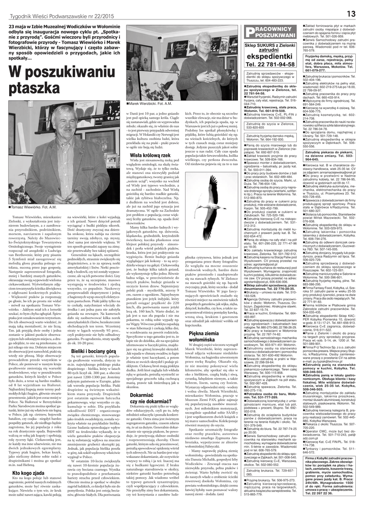 13 Tygodnik Wieści Podwarszawskie nr 22/2015 23 maja w Izbie Muzealnej Wodiczków w Wołominie odbyła się inauguracja nowego cyklu pt. „Spotkanie z przyrodą”. Gośćmi wieczoru byli przyrodnicy i fotografowie przyrody - Tomasz Wiewiórko i Marek Wierzbicki, którzy w fascynujący i często zabawny sposób opowiedzieli o przygodach, jakie ich spotkały… P racownicy poszukiwani Sklep SUKURS z Zielonki zatrudni ekspedientki Tel. 22 781-94-58 W poszukiwaniu ptaszka Zatrudnię sprzedawców - ekspedientki do sklepu spożywczego w Tłuszczu, tel. 604-483-223. Wierzbicki. Fot. A.M. Marek w Danii jest 10 par, a jedno gniazdo jest pod opieką samego króla. Ciągle się zastanawiali, gdzie on wyprowadza młode; okazało się, że właśnie do nas - to jest pierwszy przypadek odwrotnej migracji. W Holandii czy Norwegii jest wielka kultura osobista ludzi, która przekłada się na ptaki - ptaki prawie w ogóle nie boją się ludzi. Wisła królową rzek Tomasz Wiewiórko. Fot. A.M. Tomasz Wiewiórko, mieszkaniec Zielonki, z wykształcenia jest inżynierem budowlanym, a z zamiłowania przyrodnikiem, podróżnikiem, morsem, narciarzem i zapalonym rowerzystą. Należy do Mazowiecko-Świętokrzyskiego Towarzystwa Ornitologicznego. Swoje wystąpienie rozpoczął od anegdotki o Ludwigu van Beethovenie, który przy pisaniu 5 Symfonii miał zasugerować się melodią głosu ptaszka polnego ortolana, nuconą przez jego gosposię. Następnie zaprezentował fotografie, mniej i bardziej znanych gatunków, okraszając swoją wypowiedź wieloma ciekawostkami. Wyświetlanym zdjęciom towarzyszyła ścieżka dźwiękowa z odgłosami konkretnych ptaków. - Większość ptaków ja rozpoznaję po głosie, bo ich po prostu nie widać - mówił na spotkaniu Tomasz Wiewiórko. - Jakbym miał ich z lornetki szukać, to bym chyba ogłupiał. Śpiew ptaka jest oznakowaniem terytorium. Do ich obserwacji warto wiedzieć, że mają taką mentalność, że nie liczą. Tzn. jak przyjdą dwie osoby i jedna zostanie w jakimś punkcie obserwacyjnym lub osłoniętym miejscu, a druga odejdzie, to one są przekonane, że już nikogo nie ma. Dobrym miejscem do obserwacji jest samochód, ptaki się wtedy nie płoszą. Moje obserwacje prowadziłem przede wszystkim w Polsce, ale ponieważ w naszym kraju gwałtownie zmieniają się warunki środowiskowe, więc w poszukiwaniu gatunków, których kiedyś w Polsce było dużo, a teraz są bardzo rzadkie, od 8 lat wyjeżdżam na Białoruś. Najbardziej frapują mnie tereny podmokłych łąk i bagien, głównie otwarte przestrzenie, jakich jest coraz mniej w Polsce. Na Białorusi w Berezyńskim Parku Narodowym można spotkać gatunki, które już się właściwie nie legną w Polsce, jak np. cietrzew, bojownik batalion, czy czajka - niegdyś bardzo pospolity gatunek, ale niedługo będzie zagrożona, bo jej populacja z roku na rok drastycznie spada. Bojowniki walczą ze sobą jak koguty i spełniają rolę rycerzy łąki. Ciekawostką jest, że każdy ma inne ubarwienie, nie ma dwóch jednakowych egzemplarzy. Typowy ptak bagien, bekas kszyk, jako nieliczny dobrze sobie radzi z drapieżnikami i można go spotkać m.in. nad Biebrzą. Kto kogo zjada Kto na kogo poluje lub stanowi zagrożenie, pośród naszych rodzimych gatunków, może być równie zaskakujące. Niewielu o tym wie, że kruk może zabić nawet zająca, kawki polują na wiewiórki, które z kolei wyjadają z ich gniazd. Nawet dzięcioł potrafi wyciągnąć z budki pisklęta sikorek. Dość drastyczny zwyczaj ma dzierzba srokosz, która nabija na ciernie tarniny swoją zdobycz, np. myszy, choć sama jest niewiele większa. W ten sposób gromadzi zapasy na zimę; nie przetrwałaby bez takiej spiżarni. Generalnie na łąkach, szczególnie podmokłych, strasznie zwiększyło się drapieżnictwo, a to za sprawą norki amerykańskiej i lisów. Norki pouciekały z hodowli, czy też zostały wypuszczone, ale są ich potworne ilości. Lisy przez to, że są szczepione, masowo występują w środowisku i zjedzą wszystko, co popadnie. Naukowcy przeprowadzili eksperyment i jedną z bagiennych wysp otoczyli elektrycznym pastuchem. Ptaki jakby tylko na to czekały, natychmiast wleciały do środka i ani jedna para nie założyła gniazda na zewnątrz. Na kamerach dało się zaobserwować kilka norek amerykańskich i lisów, bezskutecznie obchodzących ten teren. Wcześniej straty w lęgach wynosiły 95 proc., czyli praktycznie nie było odbudowy gatunku. Po ogrodzeniu, straty spadły do ok. 10-20 proc. Bieliki i bociany górą Są też gatunki, których populacja gwałtownie wzrosła, dotyczy to m.in. największego polskiego ptaka drapieżnego - bielika, który w latach 80-tych liczył ok. 300 par, a obecnie jest nawet 1200-1300 par. Jesteśmy jedynym państwem w Europie, gdzie tak wzrosła populacja bielika. Ptaki drapieżne są świetnym wskaźnikiem stanu przyrody. Drapieżnik jest ostatnim ogniwem łańcucha pokarmowego, więc wszystko co zje, kumuluje w sobie. Dla przykładu szkodliwość DDT - organicznego związku chemicznego, stosowanego jako środek owadobójczy, została wykryta właśnie na przykładzie bielika. Liczne badania sprawdzające wpływ DDT na środowisko wykazały, że u wielu gatunków ptaków ekspozycja na tę substancję wpływa na znaczne zmniejszenie grubości skorupki jaj. Jednak, jak populacja bielika poszła w górę, tak sokół wędrowny właściwie wyginął w Polsce. W ostatnim 10-leciu zwiększyła się nawet 10-krotnie populacja żurawia czy bociana czarnego. Wynika to prawdopodobnie z przełamania bariery strachu przed człowiekiem. Obecnie można je spotkać w obrębie zagród ludzkich, co kiedyś było nie do pomyślenia. Polska jest ostoją bocianów, głównie białych. Dla porównania Wisła jest niesamowitą rzeką pod względem ornitologii, na skalę światową. Wydaje się, że to tylko rzeka, ale stanowi ona niezwykły podział międzygatunkowy, tworzy granicę jak „nożem uciął”; 