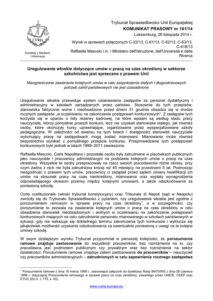 Trybunał Sprawiedliwości Unii Europejskiej KOMUNIKAT PRASOWY nr 161/14 Luksemburg, 26 listopada 2014 r. Kontakty z Mediami i Informacja Wyrok w sprawach połączonych C-22/13, C-61/13, C-62/13, C-63/13, C-418/13 Raffaella Mascolo i in. / Ministero dell'Istruzione, dell'Università e della Ricerca Uregulowanie włoskie dotyczące umów o pracę na czas określony w sektorze szkolnictwa jest sprzeczne z prawem Unii Nieograniczone zawieranie kolejnych umów w celu zaspokojenia stałych i długookresowych potrzeb szkół państwowych nie jest uzasadnione Uregulowanie włoskie przewiduje system ustanawiania zastępstw za personel dydaktyczny i administracyjny w szkołach zarządzanych przez państwo. Stosownie do tych przepisów, stanowiska faktycznie wolne i nieobsadzone przed dniem 31 grudnia obsadza się w drodze rocznych zastępstw „w oczekiwaniu na zakończenie postępowań konkursowych”. Z zastępstw tych korzysta się w oparciu o listy rezerwy kadrowej, na które wpisani są według stażu pracy nauczyciele, którzy pomyślnie przeszli konkurs, lecz nie uzyskali stanowiska stałego, jak również osoby, które ukończyły kursy uprawniające, organizowane przez wyspecjalizowane szkoły pedagogiczne. W zależności od awansu na tych listach i dostępności stanowisk nauczyciele wykonujący pracę na zastępstwach mogą zostać mianowani. Mianowanie może również bezpośrednio wynikać z pomyślnego przejścia konkursu. Przeprowadzanie tych postępowań konkursowych było jednak w latach 1999–2011 zawieszone. Raffaella Mascolo, Carla Napolitano i pozostałe osoby były zatrudniane w placówkach publicznych jako nauczyciele i pracownicy administracyjni na podstawie kolejnych umów o pracę na czas określony. Wszystkie te osoby przepracowały na rzecz swoich pracodawców różne okresy, przy czym żadna z nich nie była zatrudniona krócej niż 45 miesięcy na przestrzeni 5 lat. Podnosząc niezgodność z prawem tych umów, pracownicy ci zażądali przed sądem zmiany kwalifikacji ich umów na stosunek pracy na czas nieokreślony, mianowania oraz wypłaty wynagrodzenia odpowiadającego okresom przerwy między kolejnymi umowami, a także odszkodowania za poniesioną szkodę. Corte costituzionale (włoski trybunał konstytucyjny) oraz Tribunale di Napoli (sąd w Neapolu) zwróciły się do Trybunału Sprawiedliwości z pytaniem, czy uregulowanie włoskie jest zgodne z porozumieniem ramowym w sprawie pracy na czas określony1, a w szczególności, czy porozumienie to zezwala na zawieranie kolejnych umów o pracę na czas określony w celu obsadzenia stanowisk nieobsadzonych i wolnych w oczekiwaniu na zakończenie postępowań konkursowych mających na celu zatrudnienie personelu mianowanego w szkołach państwowych w sytuacji, gdy nie wskazuje się dokładnego terminu zakończenia tych konkursów i wyklucza się jakąkolwiek możliwość uzyskania odszkodowania za ewentualnie poniesioną z uwagi na te kolejne umowy szkodę. W swym dzisiejszym wyroku Trybunał przypomniał w pierwszej kolejności, że porozumienie ramowe znajduje zastosowanie do wszystkich pracowników, bez rozróżnienia na to, czy pracodawca jest podmiotem publicznym czy prywatnym oraz bez rozróżnienia na sektor działalności. Porozumienie ramowe znajduje zatem zastosowanie do pracowników – nauczycieli czy pracowników administracyjnych – zatrudnionych w celu zapewnienia rocznego zastępstwa 1 Porozumienie ramowe z dnia 18 marca 1999 r., stanowiące załącznik do dyrektywy Rady 99/70/WE z dnia 28 czerwca 1999 r. dotyczącej Porozumienia ramowego w sprawie pracy na czas określony, zawartego przez UNICE, CEEP oraz ETUC (Dz.U. L 175, s. 43). www.curia.europa.eu w szkołach publicznych2. Aby zapobiec korzystaniu z kolejnych umów o pracę na czas określony w sposób stanowiący nadużycie, porozumienie ramowe zobowiązuje3 państwa członkowskie do wprowadzenia, po pierwsze, co najmniej jednego z następujących rozwiązań: wskazania obiektywnych powodów uzasadniających ponowne zawarcie umów lub określenia maksymalnego łącznego czasu trwania umów lub też określenia liczby ponownie zawieranych umów. Ponadto, aby zagwarantować pełną skuteczność porozumienia ramowego, w wypadku korzystania z kolejnych umów o pracę na czas określony w sposób stanowiący nadużycie powinna być stosowana sankcja. Sankcja ta powinna być proporcjonalna, skuteczna i odstraszająca. Środki zapobiegające nadużyciom Uregulowanie włoskie nie przewiduje żadnego rozwiązania ograniczającego maksymalny całkowity czas trwania umów czy liczbę ponownie zawieranych umów; nie przewiduje również rozwiązania z nimi równorzędnego. W tych okolicznościach, ponowne zawieranie umów powinno być uzasadnione „obiektywnym powodem”, takim jak szczególny charakter zadań, ich swoiste cechy lub realizacja słusznego celu polityki społecznej. Zdaniem Trybunału, tymczasowe zastępowanie pracowników ze względów polityki społecznej (nieobecność wskutek choroby, urlopy rodzicielskie, macierzyńskie i inne) stanowi obiektywny powód uzasadniający określony czas trwania umowy. Trybunał zauważył również, że szkolnictwo odpowiada prawu podstawowemu gwarantowanemu na podstawie włoskiej konstytucji, które ustanawia po stronie państwa włoskiego obowiązek zorganizowania usług szkolnictwa w taki sposób, by zapewnić stałą zgodność pomiędzy liczbą nauczycieli a liczbą uczniów, co zależy od wielu czynników, z których niektóre mogą być trudne do kontrolowania czy przewidzenia. Czynniki te świadczą o szczególnej potrzebie elastyczności, która może obiektywnie uzasadniać korzystanie z kolejnych umów o pracę na czas określony. Podobnie Trybunał przyznał, że w sytuacji, gdy państwo członkowskie zastrzega, w szkołach, nad którymi sprawuje zarząd, dostęp do stałych stanowisk dla członków personelu, którzy pomyślnie przeszli postępowanie konkursowe, poprzez mianowanie, może b