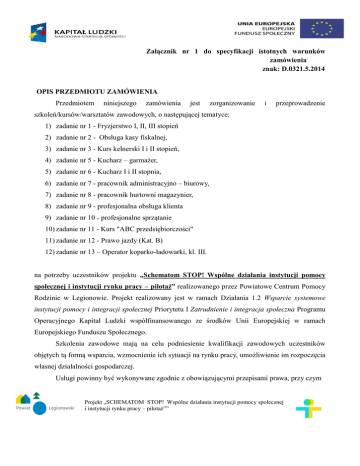 Załącznik nr 1 do specyfikacji istotnych warunków zamówienia znak: D.0321.5.2014 OPIS PRZEDMIOTU ZAMÓWIENIA Przedmiotem niniejszego zamówienia jest zorganizowanie i przeprowadzenie szkoleń/kursów/warsztatów zawodowych, o następującej tematyce: 1) zadanie nr 1 - Fryzjerstwo I, II, III stopień 2) zadanie nr 2 - Obsługa kasy fiskalnej, 3) zadanie nr 3 - Kurs kelnerski I i II stopień, 4) zadanie nr 5 - Kucharz – garmażer, 5) zadanie nr 6 - Kucharz I i II stopnia, 6) zadanie nr 7 - pracownik administracyjno – biurowy, 7) zadanie nr 8 - pracownik hurtowni magazynier, 8) zadanie nr 9 - profesjonalna obsługa klienta 9) zadanie nr 10 - profesjonalne sprzątanie 10) zadanie nr 11 - Kurs "ABC przedsiębiorczości" 11) zadanie nr 12 - Prawo jazdy (Kat. B) 12) zadanie nr 13 – Operator koparko-ładowarki, kl. III. na potrzeby uczestników projektu „Schematom STOP! Wspólne działania instytucji pomocy społecznej i instytucji rynku pracy – pilotaż” realizowanego przez Powiatowe Centrum Pomocy Rodzinie w Legionowie. Projekt realizowany jest w ramach Działania 1.2 Wsparcie systemowe instytucji pomocy i integracji społecznej Priorytetu I Zatrudnienie i integracja społeczna Programu Operacyjnego Kapitał Ludzki współfinansowanego ze środków Unii Europejskiej w ramach Europejskiego Funduszu Społecznego. Szkolenia zawodowe mają na celu podniesienie kwalifikacji zawodowych uczestników objętych tą formą wsparcia, wzmocnienie ich sytuacji na rynku pracy, umożliwienie im rozpoczęcia własnej działalności gospodarczej. Usługi powinny być wykonywane zgodnie z obowiązującymi przepisami prawa, przy czym Projekt „SCHEMATOM STOP! Wspólne działania instytucji pomocy społecznej i instytucji rynku pracy – pilotaż”” minimalny czas poszczególnych kursów/szkoleń/warsztatów nie może być krótszy niż: w przypadku szkolenia Fryzjerstwo I, II, III stopień – 120 godz. (teoretycznych i praktycznych) w przypadku szkolenia Obsługa kasy fiskalnej - 30 godz. (teoretycznych i praktycznych) w przypadku szkolenia Kurs kelnerski I i II stopień - 80 godz. (teoretycznych i praktycznych) w przypadku szkolenia Księgowość od podstaw z obsługą programów użytkowych - 80 godz. (teoretycznych i praktycznych) w przypadku szkolenia Kucharz – garmażer, 120 godz. (teoretycznych i praktycznych) w przypadku szkolenia Kucharz I i II stopnia - 160 godz. (teoretycznych i praktycznych) w przypadku szkolenia pracownik administracyjno – biurowy - 140 godz. (teoretycznych i praktycznych) w przypadku szkolenia pracownik hurtowni magazynier - 80 godz. (teoretycznych i praktycznych) w przypadku szkolenia profesjonalna obsługa klienta - 100 godz. (teoretycznych i praktycznych) w przypadku szkolenia profesjonalne sprzątanie - 80 godz. (teoretycznych i praktycznych) w przypadku szkolenia Kurs "ABC przedsiębiorczości" - 80 godz. (teoretycznych i praktycznych) w przypadku kursu „Prawo jazdy (Kat. B)” – zgodnie z normami Ustawy z dnia 5 stycznia 2011 r. o kierujących pojazdami (Dz. U. 2011, nr 30 poz. 151) oraz Rozporządzenie Ministra Transportu, Budownictwa i Gospodarki Morskiej z dnia 13 lipca 2012 r. w sprawie szkolenia osób ubiegających się o uprawnienia do kierowania pojazdami, instruktorów i wykładowców (Dz. U. 2012 poz. 1019). w przypadku kursu „Operator koparko-ładowarki kl. III” - zgodnie z rozporządzeniem Ministra Gospodarki z dnia 20 września 2001 r. w sprawie bezpieczeństwa i higieny pracy podczas eksploatacji maszyn i innych urządzeń technicznych do robót ziemnych, budowlanych i drogowych (Dz. U. z 2001 r., Nr 118 poz. 1263). Program szkolenia – Projekt „SCHEMATOM STOP! Wspólne działania instytucji pomocy społecznej i instytucji rynku pracy – pilotaż”” 2 minimum 202 godziny Wykonawca w ofercie cenowej podaje cenę w przeliczeniu na jednego uczestnika danego szkolenia, przy założeniu następującego obłożenia osobowego na poszczególnych kursach: zadanie nr 1 - Fryzjerstwo I, II, III stopień – 3 osoby zadanie nr 2 - Obsługa kasy fiskalnej – 3 osoby zadanie nr 3 - Kurs kelnerski I i II stopień – 2 osoby zadanie nr 4 - Księgowość od podstaw z obsługą programów użytkowych – 1 osoba zadanie nr 5 - Kucharz – garmażer – 1 osoba zadanie nr 6 - Kucharz I i II stopnia – 3 osoby zadanie nr 7 - pracownik administracyjno – biurowy – 3 osoby zadanie nr 8 - pracownik hurtowni magazynier – 1 osoba zadanie nr 9 - profesjonalna obsługa klienta – 1 osoba 10. zadanie nr 10 - profesjonalne sprzątanie – 2 osoby 11. zadanie nr 11 - Kurs "ABC przedsiębiorczości" – 2 osoby 12. zadanie nr 12 - Prawo jazdy (Kat. B) – 4 osoby 13. zadanie nr 13 – Operator koparko-ładowarki kl. III – 1 osoba Założenia organizacyjne szkolenia Fryzjerstwo I, II, III stopień Celem szkolenia jest przygotowanie słuchaczy do pracy w zawodzie fryzjera. Program szkolenia powinien obejmować zagadnienia dot. m.in.: organizacji stanowiska pracy oraz zasad BHP, anatomii i fizjologii włosów, mycia oraz technik masażu skóry głowy, pielęgnacji włosów – dobór i charakterystyka odpowiednich środków, technik strzyżenia i modelowania włosów, koloryzacji włosów – baleage, pasemka, refleksy, przygotowywania zabiegu trwałej ondulacji, fryzur okolicznościowych : fale, loki upięcia, Projekt „SCHEMATOM STOP! Wspólne działania instytucji pomocy społecznej i instytucji rynku pracy – pilotaż”” 3 przedłużania włosów Założenia organizacyjne szkolenia Obsługa kasy fiskalnej. Celem szkolenia jest przygotowanie słuchaczy do obsługi kasy fiskalnej, a w szczególności obejmować: budowa i obsługa kasy fiskalnej, wystawiania faktur i rachunków, sprzedaż towarów na kasie, drukowanie raportów kasowych, zasady przechowywania i magazynowania towarów, zasady BHP w obiekcie handlowym. Założenia organizacyjne szkolenia Kurs kelnerski I i II stopień Celem szkolenia jest przygotowanie słuchaczy do pracy w za