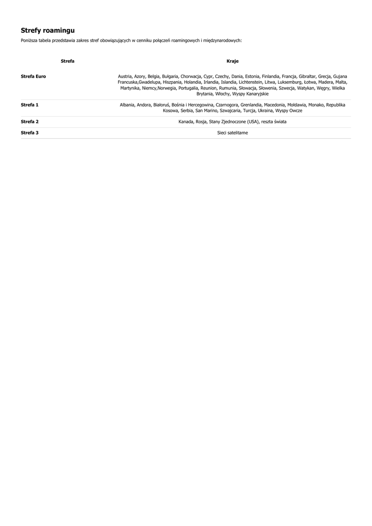 Strefy roamingu Poniższa tabela przedstawia zakres stref obowiązujących w cenniku połączeń roamingowych i międzynarodowych: Strefa Strefa Euro Kraje Austria, Azory, Belgia, Bułgaria, Chorwacja, Cypr, Czechy, Dania, Estonia, Finlandia, Francja, Gibraltar, Grecja, Gujana Francuska,Gwadelupa, Hiszpania, Holandia, Irlandia, Islandia, Lichtenstein, Litwa, Luksemburg, Łotwa, Madera, Malta, Martynika, Niemcy,Norwegia, Portugalia, Reunion, Rumunia, Słowacja, Słowenia, Szwecja, Watykan, Węgry, Wielka Brytania, Włochy, Wyspy Kanaryjskie Strefa 1 Albania, Andora, Białoruś, Bośnia i Hercegowina, Czarnogora, Grenlandia, Macedonia, Mołdawia, Monako, Republika Kosowa, Serbia, San Marino, Szwajcaria, Turcja, Ukraina, Wyspy Owcze Strefa 2 Kanada, Rosja, Stany Zjednoczone (USA), reszta świata Strefa 3 Sieci satelitarne