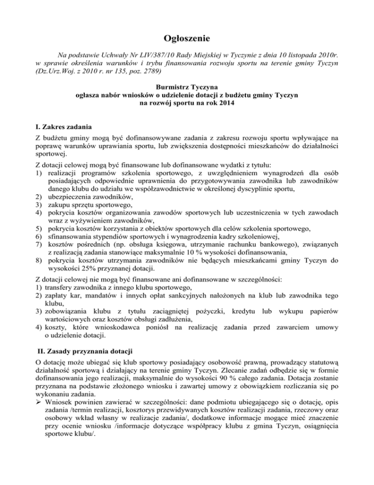 Ogłoszenie Na podstawie Uchwały Nr LIV/387/10 Rady Miejskiej w Tyczynie z dnia 10 listopada 2010r. w sprawie określenia warunków i trybu finansowania rozwoju sportu na terenie gminy Tyczyn (Dz.Urz.Woj. z 2010 r. nr 135, poz. 2789) Burmistrz Tyczyna ogłasza nabór wniosków o udzielenie dotacji z budżetu gminy Tyczyn na rozwój sportu na rok 2014 I. Zakres zadania Z budżetu gminy mogą być dofinansowywane zadania z zakresu rozwoju sportu wpływające na poprawę warunków uprawiania sportu, lub zwiększenia dostępności mieszkańców do działalności sportowej. Z dotacji celowej mogą być finansowane lub dofinansowane wydatki z tytułu: 1) realizacji programów szkolenia sportowego, z uwzględnieniem wynagrodzeń dla osób posiadających odpowiednie uprawnienia do przygotowywania zawodnika lub zawodników danego klubu do udziału we współzawodnictwie w określonej dyscyplinie sportu, 2) ubezpieczenia zawodników, 3) zakupu sprzętu sportowego, 4) pokrycia kosztów organizowania zawodów sportowych lub uczestniczenia w tych zawodach wraz z wyżywieniem zawodników, 5) pokrycia kosztów korzystania z obiektów sportowych dla celów szkolenia sportowego, 6) sfinansowania stypendiów sportowych i wynagrodzenia kadry szkoleniowej, 7) kosztów pośrednich (np. obsługa księgowa, utrzymanie rachunku bankowego), związanych z realizacją zadania stanowiące maksymalnie 10 % wysokości dofinansowania, 8) pokrycia kosztów utrzymania zawodników nie będących mieszkańcami gminy Tyczyn do wysokości 25% przyznanej dotacji. Z dotacji celowej nie mogą być finansowane ani dofinansowane w szczególności: 1) transfery zawodnika z innego klubu sportowego, 2) zapłaty kar, mandatów i innych opłat sankcyjnych nałożonych na klub lub zawodnika tego klubu, 3) zobowiązania klubu z tytułu zaciągniętej pożyczki, kredytu lub wykupu papierów wartościowych oraz kosztów obsługi zadłużenia, 4) koszty, które wnioskodawca poniósł na realizację zadania przed zawarciem umowy o udzielenie dotacji. II. Zasady przyznania dotacji O dotację może ubiegać się klub sportowy posiadający osobowość prawną, prowadzący statutową działalność sportową i działający na terenie gminy Tyczyn. Zlecanie zadań odbędzie się w formie dofinansowania jego realizacji, maksymalnie do wysokości 90 % całego zadania. Dotacja zostanie przyznana na podstawie złożonego wniosku i zawartej umowy z obowiązkiem rozliczania się po wykonaniu zadania. Wniosek powinien zawierać w szczególności: dane podmiotu ubiegającego się o dotację, opis zadania /termin realizacji, kosztorys przewidywanych kosztów realizacji zadania, rzeczowy oraz osobowy wkład własny w realizacje zadania/, dodatkowe informacje mogące mieć znaczenie przy ocenie wniosku /informacje dotyczące współpracy klubu z gmina Tyczyn, osiągnięcia sportowe klubu/. Do wniosku należy dołączyć: aktualny wyciąg z Krajowego Rejestru Sądowego lub innego rejestru albo ewidencji właściwych dla formy organizacyjnej danego klubu sportowego oraz aktualny statut. Wniosek należy składać na formularzu zgodnym z Uchwałą Nr V/41/11 Rady Miejskiej w Tyczynie z dnia 7 marca 2011 r. w sprawie zmiany uchwały LIV/387/10 Rady Miejskiej w Tyczynie z dnia 10 listopada 2010r. w sprawie określenia warunków i trybu finansowania rozwoju sportu na terenie gminy Tyczyn /Dz.Urz.Woj. z 2011r., nr 43, poz. 909/. Wzór wniosku do pobrania w Urzędzie Miejskim w Tyczynie w pok. 25 lub na stronie internetowej www.bip.tyczyn.pl w zakładce Konkursy dla stowarzyszeń. Kompletne wnioski należy składać w terminie do 15 października 2013 r. do godz. 15.30 w sekretariacie Urzędu Miejskiego w Tyczynie, ul Rynek 18. Wnioski niekompletne i złożone po terminie nie będą rozpatrywane. Burmistrz Tyczyna po zapoznaniu się ze złożonym wnioskiem podejmuje decyzję w sprawie przyznania dotacji celowej i jej wysokości dla klubu sportowego w ramach środków zaplanowanych na ten cel w budżecie gminy Tyczyn w formie zarządzenia. Decyzja Burmistrza Tyczyna jest ostateczna i nie przysługuje od niej odwołanie. Przy ocenie złożonych wniosków brane będzie pod uwagę: - znaczenie zgłoszonego zadania dla rozwoju sportu na terenie gminy Tyczyn, - wysokość środków budżetowych przeznaczonych na rozwój sportu, - przedstawiony kosztorys i opis przedsięwzięcia, - doświadczenie w dotychczasowej współpracy z wnioskodawcą, - dotychczasowe wyniki i osiągnięcia sportowe wnioskodawcy. Wysokość przyznanej dotacji może być niższa od wnioskowanej przez klub sportowy. W takim przypadku warunkiem zawarcia umowy jest korekta kosztorysu zadania. Termin realizacji zadania od daty podpisania umowy do 31 grudnia 2014 r. Burmistrz Tyczyna zastrzega sobie możliwość unieważnienia naboru wniosków bez podania przyczyn. Wyniki naboru wniosków podane będą w terminach: - do dnia 22 października 2013 r. pod względem formalnym, - do 7 dni po uchwaleniu budżetu gminy Tyczyn na rok 2014 pod względem merytorycznym z podaniem wysokości przyznanej dotacji na realizację zadania. Ogłoszenie o wynikach naborach wniosków opublikować: - w BIP-ie www.bip.tyczyn.pl, - na tablicy ogłoszeń w siedzibie Urzędu Miejskiego w Tyczynie. Informacje o naborze wniosków można uzyskać w Urzędzie Miejskim w Tyczynie w pok. 25 lub pod numerem telefonu 17 22 19 318, wew. 25, w godzinach od 7.30 do 15.30, od poniedziałku do piątku.