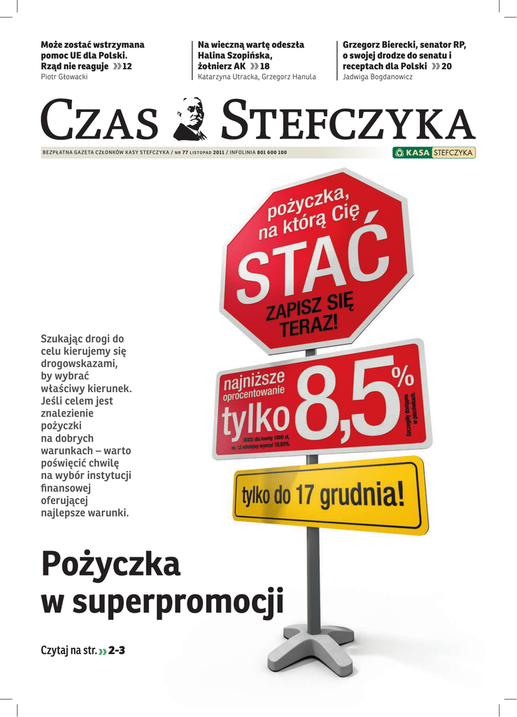 Może zostać wstrzymana pomoc UE dla Polski. Rząd nie reaguje 12 Na wieczną wartę odeszła Halina Szopińska, żołnierz AK 18 Grzegorz Bierecki, senator RP, o swojej drodze do senatu i receptach dla Polski 20 Piotr Głowacki Katarzyna Utracka, Grzegorz Hanula Jadwiga Bogdanowicz bezpł atna ga zeta członków k a sy stefcz yk a / nr 77 listopad 2011 / infolinia 801 600 100 Szukając drogi do celu kierujemy się drogowskazami, by wybrać właściwy kierunek. Jeśli celem jest znalezienie pożyczki na dobrych warunkach – warto poświęcić chwilę na wybór instytucji finansowej oferującej najlepsze warunki. Pożyczka w superpromocji Czytaj na str. 2-3 aktualności słowood prezesa Andrzej Sosnowski prezes Kasy Stefczyka Szanowni Państwo, skutkiem tegorocznych wyborów parlamentarnych Platforma Obywatelska ponownie tworzy rząd. Ponownie premierem jest Donald Tusk. Taka była wola narodu. Jednak wola zaledwie części narodu (biorąc pod uwagę frekwencję przy urnach wyborczych) nie jest gwarancją rządów, dzięki którym Polakom będzie żyło się lepiej. Wyniki wyborów nie mogą zwolnić nas z patrzenia na ręce rządzącym. Zadziwiający jest brak reakcji polskiego rządu na pakiet legislacyjny Komisji Europejskiej, który zakłada możliwość pozbawienia Polski środków europejskich (str. 12-13). Na dodatek dzieje się to w czasie polskiej prezydencji w UE! Czy opozycja parlamentarna, będąca przecież mniejszością, może wpłynąć na decyzje podejmowane przez rząd? Jedynie pod warunkiem, że rząd będzie otwarty na propozycje dobrych rozwiązań obecnych problemów. Grzegorz Bierecki, prezes Krajowej SKOK, po raz pierwszy został senatorem. W wywiadzie (str. 20-23) stwierdził: „Wyborcy najprawdopodobniej uznali, że wybór kogoś spoza lokalnych układów będzie dla nich korzystny. Nie jestem w te układy uwikłany, mogę podjąć działania, których inni się boją, bo kalkulują”. Śledźmy, jak jego propozycje tworzenia dobrego, korzystnego dla Polaków prawa będą traktować rządzący. Prezes Bierecki Grzegorz Bierecki, prezes Krajowej Spółdzielczej Kasy Oszczędnościowo-Kredytowej uzyskał podczas ostatnich wyborów do senatu najlepszy wynik w okręgu 17. obejmującym trzy powiaty w województwie lubelskim: bialski, parczewski i radzyński oraz Białą Podlaską. D la wielu obserwatorów sceny politycznej dużym zaskoczeniem jest fakt, że mieszkańcy południowego Podlasia postanowili obdarzyć zaufaniem uznanego w świecie eksperta z dziedziny finansów, spółdzielczości i prawa, z którego doświadczenia korzystają organizacje i rządy krajów Europy Środkowo-Wschodniej, a nie któregoś z kandydatów reprezentujących ten region w poprzednich kadencjach. Bierecki to człowiek, który zbudował od podstaw SKOK-i, podobne do przedwojennych Kas Stefczyka i unii kredytowych działających na całym świecie: w USA, Kanadzie, Australii, Brazylii. Jest Polakiem zajmującym najwyższe stanowisko w międzynarodowych organizacjach finansowych – wiceprzewodniczącym Światowej Rady Unii Kredytowych liczbyKasy Stefczyka 5 530 000 000 zł depozyty 4 440 000 000 zł pożyczki 6 220 000 000 zł aktywa 377 oddziały 804 000 Współwłaściciele wstępne dane na 30 września 2011 r. 2 c z as stefc z yk a www.k asastefc z yk a.pl aktualności senatorem RP fot. ap zrzeszającej Kasy ze stu krajów świata, 180 milionów ludzi i dysponującą kwotą 1,5 biliona dolarów. Być może to przykład rodzimego, polskiego sukcesu, zarówno osobistego jak i przynoszącego konkretne korzyści społeczne i wiara w możliwość jego powtórzenia na innym polu kierowała wyborcami. Bierecki to w przeszłości działacz podziemnego Niezależnego Zrzeszenia Studentów i „Solidarności”. Głęboko zaangażowany społecznie, działa aktywnie na rzecz zlikwidowania zjawiska wykluczenia społecznego i finansowego, ochrony dziedzictwa kultury. Najbardziej dumny jest z tytułów i odznaczeń przyznanych mu przez jasnogórskich paulinów i redakcję Tygodnika Katolickiego „Niedziela” w uznaniu zasług jakie położył dla Jasnej Góry i środowisk związanych z organizacjami katolickimi w Polsce. Rozmowa z senatorem Biereckim na stronach 20-23. Po co – w imię lojalności wobec banku – brać droższy kredyt? Pożyczka w superpromocji Szukając drogi do celu kierujemy się drogowskazami, by wybrać właściwy kierunek. Jeśli celem jest znalezienie pożyczki na dobrych warunkach – warto poświęcić chwilę na wybór instytucji finansowej oferującej najlepsze warunki. – Lojalność wobec banku się nie opłaca – przekonuje Jarosław Sadowski, analityk firmy Expander, która 27 września 2011 r. przygotowała raport na ten temat. Czytamy w nim: „Kredyty gotówkowe są jedną z popularniejszych form finansowania różnego rodzaju wydatków. Ich dużą zaletą jest prosta, zrozumiała niemal dla wszystkich forma spłaty. Wadą jest natomiast stosunkowo wysoki koszt. Klienci zainteresowani takim kredytem starają się więc znaleźć sposób, aby za taki kredyt nie przepłacać. Niestety często kierują się stereotypem, że najtaniej będzie w tym banku, w którym od wielu lat posiadają konto”. Expander przygotował zestawienie kredytów w bankach. W sześciu bankach kredyt dla nowego i starego klienta kosztuje dokładnie tyle samo, a w czterech bankach (BNP Paribas, Meritum Bank, Euro Bank, Getin Bank) oferta kierowana do wszystkich jest tańsza niż oferty dla stałych klientów w innych bankach. – Z tego wynika, że jeśli zależy nam na tanim kredycie, to nie należy kierować się lojalnością, lecz po prostu szukać atrakcyjnej oferty – czytamy w raporcie. infolinia 801 600 100 Kasy Stefczyka działają inaczej niż banki. Doceniają lojalnych członków Kas oferując niższe oprocentowanie pożyczek i wyższe oprocentowanie lokat – w zależności od stażu członkowskiego i dobrej historii kredytowej. Dlaczego? Bo nie są bankami, ale spół