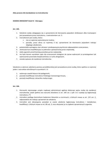 Akty prawne dla kandydatow na instruktorów KODEKS DROGOWY Dział IV - Kierujący Art. 105. 1. 2. 3. 4. 5. 6. 7. Szkolenie osoby ubiegającej się o uprawnienie do kierowania pojazdem silnikowym albo tramwajem jest prowadzone przez instruktora, z zastrzeżeniem ust. 3. Instruktorem jest osoba, która: • ma co najmniej wykształcenie średnie, • posiada, przez okres co najmniej 3 lat, uprawnienie do kierowania pojazdami rodzaju objętego szkoleniem, potwierdziła wymagany stan zdrowia i predyspozycje psychiczne odpowiednim orzeczeniem, ukończyła kurs kwalifikacyjny w jednostce upoważnionej przez wojewodę, zdała egzamin przed komisją powołaną przez wojewodę, nie była karana wyrokiem sądu lub orzeczeniem kolegium do spraw wykroczeń za przestępstwo lub wykroczenie przeciwko bezpieczeństwu w ruchu drogowym, została wpisana do ewidencji instruktorów. Szkolenie w zakresie udzielania pomocy przedlekarskiej jest prowadzone przez osobę, która spełnia co najmniej jeden z warunków określonych w punktach 1-3: 1. 2. 3. wykonuje zawód lekarza lub pielęgniarki, posiada kwalifikacje instruktora Polskiego Czerwonego Krzyża, posiada kwalifikacje ratownika medycznego. Art. 106. 1. 2. 3. Kierownik rejonowego urzędu rządowej administracji ogólnej dokonuje wpisu osoby do ewidencji instruktorów, jeżeli spełnia ona warunki określone w art. 105 ust. 2 pkt 1-6 i wydaje jej legitymację instruktora. (*) Instruktor podlega kontrolnym badaniom lekarskim w terminach, o których mowa w art. 122 ust. 2, odpowiednio do rodzaju uprawnień do szkolenia. Instruktor jest obowiązany posiadać w czasie szkolenia legitymację instruktora i świadectwo kwalifikacji, o którym mowa w art. 89 ust. 3, oraz okazywać je na żądanie uprawnionych organów. Art. 107. 1. 2. Kierownik rejonowego urzędu rządowej administracji ogólnej skreśla instruktora z ewidencji, jeżeli instruktor: • nie spełnia warunków określonych w art. 105 ust. 2 pkt 1-6, • nie przedstawił orzeczenia lekarskiego z badań kontrolnych o braku przeciwwskazań zdrowotnych do wykonywania czynności instruktora, • nie zdał egzaminu, o którym mowa w art. 108 ust. 2 pkt 2, w wyznaczonym terminie, • dopuścił się rażącego naruszenia przepisów w zakresie szkolenia. W przypadku skreślenia instruktora z ewidencji z przyczyny określonej w ust. 1 pkt 4, ponowny wpis do ewidencji nie może być dokonany wcześniej niż po upływie 2 lat od dnia, w którym decyzja o skreśleniu stała się ostateczna. ROZPORZĄDZENIE MINISTRA INFRASTRUKTURY z dnia 27 października 2005 r. w sprawie szkolenia, egzaminowania i uzyskiwania uprawnień przez kierujących pojazdami, instruktorów i egzaminatorów Rozdział 6 Kurs kwalifikacyjny dla instruktorów nauki jazdy § 33. Szkolenie kandydatów na instruktorów nauki jazdy i instruktorów nauki jazdy, w formie kursu kwalifikacyjnego, o którym mowa w art. 105 ust. 2 pkt 4 ustawy, prowadzi podmiot spełniający wymagania, o których mowa w § 3. § 34. Wykładowcy przedmiotu: 1. 2. 3. "Technika kierowania i obsługa pojazdu" - powinni posiadać uprawnienia instruktora lub egzaminatora oraz co najmniej 5 lat praktyki zawodowej w zakresie szkolenia lub egzaminowania kandydatów na kierowców w zakresie objętym nauczaniem; "Zasady prowadzenia ośrodka szkolenia kierowców" - powinni posiadać uprawnienia instruktora w zakresie objętym nauczaniem oraz co najmniej 5-letnią praktykę w kierowaniu ośrodkiem szkolenia kierowców; "Praktyka instruktorska" - powinni posiadać uprawnienia instruktora w zakresie objętym nauczaniem i praktykę zawodową w zakresie prowadzenia szkolenia kandydatów na kierowców od co najmniej 5 lat. § 35. 1. 2. Kandydat na instruktora nauki jazdy i instruktor nauki jazdy podlega szkoleniu, które obejmuje: • szkolenie podstawowe - przed przystąpieniem po raz pierwszy do egzaminu przed komisją egzaminacyjną powołaną przez wojewodę; • szkolenie dodatkowe: • każdorazowo po dwukrotnym uzyskaniu negatywnego wyniku egzaminu, o którym mowa w pkt 1, • jeżeli rozszerza posiadany zakres uprawnień instruktora, • jeżeli został skreślony z ewidencji instruktorów z powodu określonego w art. 107 ust. 1 pkt 4 ustawy. Szkolenia, o których mowa w ust. 1, prowadzi się na warunkach i w trybie określonym w programie szkolenia kandydatów na instruktorów i instruktorów nauki jazdy stanowiącym załącznik nr 6 do rozporządzenia. § 36. 1. 2. Szkolenie podstawowe dla kandydatów na instruktorów i instruktorów może rozpocząć osoba, która spełnia wymogi określone w art. 105 ust. 2 pkt 1-3 i 6 ustawy. Szkolenie dodatkowe może rozpocząć osoba, która posiada zaświadczenie o ukończeniu kursu podstawowego lub posiada uprawnienia instruktora nauki jazdy. § 37. 1. 2. 3. Jednostka prowadząca szkolenie przyjmując kandydata na instruktora lub instruktora na kurs: • zapoznaje go ze stosowanym na kursie regulaminem wewnętrznym, przygotowanym przez jednostkę prowadzącą szkolenie; • sprawdza spełnianie przez kandydatów na instruktorów i instruktorów wymogów, o których mowa w § 36; • rejestruje go przed rozpoczęciem szkolenia teoretycznego odpowiednio: • w książce ewidencji osób szkolonych, o której mowa w § 6 ust. 4 pkt 2, • w dzienniku lekcyjnym kursu, wpisując: • dane osobowe kandydata na instruktora lub instruktora wraz z kategoriami, w zakresie których jest szkolony i datę urodzenia lub nr PESEL - jeżeli kandydat na instruktora lub instruktor go posiada. • rodzaj szkolenia (podstawowe, dodatkowe), • wykaz zajęć teoretycznych, • wykaz osób prowadzących zajęcia teoretyczne; • przed rozpoczęciem zajęć praktycznych wydaje mu kartę przeprowadzonych zajęć, której wzór określa załącznik nr 7 do rozporządzenia. Po zakończeniu szkolenia wykładowcy odnotowują dla poszczególnych przedmiotów końcowy wynik nauczania osoby (pozytywny "P" albo negatywny "N"): • w dzienniku lekcyjnym - jeżeli s
