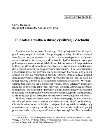 Człowiek w Kulturze 19 Curtis Hancock Rockhurst University, Kansas City, USA Filozofia a walka o duszę cywilizacji Zachodu Mortimer Adler w swojej książce pt. Dziesięć błędów filozoficznych, przekonany o tym, że ludzkie idee pociągają za sobą określone następstwa (czy też o tym, że wszelkie wydarzenia są następstwem wyłącznie idei), stwierdza, że łączny wynik licznych błędów filozoficznych popełnionych w okresie ostatnich kilkuset lat doprowadził do powstania kultury, w której doszło do niebezpiecznego rozdźwięku między wiedzą a poznawczymi predyspozycjami człowieka1. O ile indywidualne i społeczne życie ma rozwijać się w rozumnym kierunku, o tyle musi oprzeć się ono na rozumieniu prawdy i dobra. Dzisiaj jednak pogląd dominujący wśród intelektualistów sprowadza się do tego, że sądy na temat prawdy i dobra są w najlepszym wypadku relatywne. W relatywizmie tym zawiera się z kolei sceptycyzm, który uderza w podstawy zaufania do intelektu jako tego, który jest w stanie usprawiedliwić tezy teologiczne, metafizyczne i moralne. Nauki przyrodnicze również nie mogą czuć się bezpieczne w towarzystwie destrukcyjnego sceptycyzmu, który redukuje je do poziomu kulturowych konwencji lub wzorców. Wnioski wyprowadzone przez Adlera ostrzegają, że nie dowiemy się, dokąd zmierzamy, zanim nie zrozumiemy, skąd pochodzimy. Chodzi bowiem o to, że źródła dzisiejszej kultury wiele zawdzięczają nowożytnemu sceptycyzmowi. Aby więc rozumnie żeglować po jej przestworzach, należy ujawnić ten wpływ sceptyków. Do demasko1 M. J. Adler, Ten Philosophical Mistakes, New York: Macmillan Publ. Co., 1985, Wstęp, s. XII-XX. Wydanie polskie w tłumaczeniu Józefa Marzęckiego ukazało się nakładem Wydawnictwa Medium (Warszawa 1995). 318 Curtis Hancock wania sceptycyzmu i jego zgubnych konsekwencji przygotowują nas studia filozoficzne, które tym samym stają się warunkiem przywrócenia kulturze jej zdrowia. Nowożytny sceptycyzm jest jak słoń przebywający w jednym pokoju z ludźmi, którzy zajęci są udawaniem, że go tam nie ma. Doprowadził on do kryzysu ludzi odpowiedzialnych za edukację, pozbawiając ich możliwości znajdowania zasad usprawiedliwiających różne rodzaje wiedzy. Tym samym sceptycyzm spowodował erozję naszych instytucji kulturowych, bowiem jego aktualni propagatorzy zajmują w nich stanowiska kierownicze, zwłaszcza na poziomie akademickim. Stamtąd wywierają oni swoje wpływy, prowadząc pasożytnicze życie na gruncie cywilizacji zachodniej jako ostoi obiektywnej prawdy i dobra, czym jednocześnie przyczyniają się do jej osłabienia. Gdy człowiek zerwie kontakt z realnym bytem i zacznie szukać prawdy we własnych myślach, wówczas jego intelekt zaczyna liczyć jedynie na siebie, stając się swoim własnym przewodnikiem podczas prób odróżnienia rozumnego porządku od nieładu. Skutkiem tego jest orwellowski nieład. Peter Redpath streścił go we wprowadzeniu do swojej książki Cartesian Nightmare (Kartezjański koszmar) w następujący sposób: „Sceptyccy filozofowie, ateistyczni teologowie, niepiśmienni profesorowie języka angielskiego, psychologowie niewierzący w istnienie duszy, socjologowie niemający nic wspólnego z nauką, nauczyciele biznesu, którzy sami nigdy biznesu nie prowadzili, chemicy, którzy tak naprawdę są fizykami, fizycy, którzy tak naprawdę są matematykami, pracownicy administracji uniwersyteckiej i specjaliści od wykształcenia, którym brakuje podstawowego przygotowania w przedmiotach, jakie przez wieki stanowiły podstawę uniwersyteckiego programu nauczania – jednak to właśnie oni kierują dzisiaj naszymi uczelniami, to oni nierzadko przebywają w tych ośrodkach, które decydują o rozwoju wszystkich pozostałych instytucji we współczesnej kulturze zachodniej”2. Jeżeli zadanie edukacji, jak słusznie zauważył Arystoteles, ma polegać na porządkowaniu ludzkiego umysłu oraz korygowaniu nieładu, który może w tym umyśle powstać, to słowa profesora Redpatha, opi2 P. A. Redpath, Cartesian Nightmare, Amsterdam, The Netherlands, Rodopi Press, 1997, s. 3. Filozofia a walka o duszę cywilizacji Zachodu 319 sujące sytuację wielu dzisiejszych uniwersytetów, rzeczywiście wprawiają w poważne zakłopotanie. Niektórzy określają ten nieład mianem postmodernistycznej apatii. Oczywiście równie dobrze mógłby on zostać nazwany apatią modernistyczną, jako że postmodernizm powstaje właściwie na fundamencie sceptyckich i relatywistycznych założeń filozofii nowożytnej (modernistycznej). Modernizm, jako pogląd na temat wiedzy i kondycji człowieka zbudowany przez wpływowych myślicieli zarówno czasów renesansu, jak i kolejnych epok, jest światopoglądem, który prowadził długotrwały atak wymierzony w podstawy cywilizacji zachodniej. W terminologii Etienne Gilsona, modernizm jest atakiem na wiarę Zachodu, która, mówiąc ogólnie, odnosi się do zasad, jakie kształtowały zachodni świat, kiedy to Kościół katolicki zasymilował mądrość starożytnych Greków i Rzymian oraz wzmocnił ją dodatkowo mądrością Żydów i Muzułmanów. Świat w którym żyjemy dzisiaj jest, według Gilsona, zderzeniem dwóch przeciwstawnych światopoglądów: modernizmu i wiary Zachodu. Każdy światopogląd składa się z szeregu fundamentalnych prawd na temat wiedzy, rzeczywistości, ludzkiej natury, oraz prawa i dobra. Jeden modernista może interesować się niektórymi z tych zagadnień, a do pozostałych odnosić się obojętnie; inny natomiast może podchodzić na poważnie do wszystkich kwestii. Bez względu na to, wszyscy moderniści przyznają, że swoich przekonań bronili wspólnie i że w ciągu dziejów udało się im przekonać do uznania tych przekonań za oczywiste szerokie segmenty kultury popularnej i akademickiej. Z jakich elementów składają się konkurujące ze sobą światopoglądy? Modernizm jako siła kulturowa dysponuje tym oto