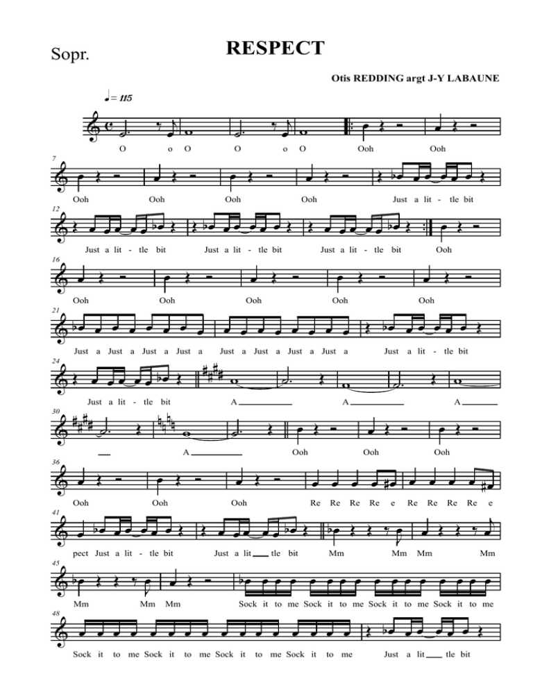 RESPECT Sopr. Otis REDDING argt J-Y LABAUNE »¡¡∞ q ‰ jw œ & c ˙. O o 7 & œ Œ Ó O O Ooh o O œ Œ Ó œ Œ Ó Ooh .. œ Œ Ó ‰ jw œ ˙. Ooh Ooh Œ bœ œ œ œ œ œ Œ œ Œ Ó Ooh œ Œ Ó Ooh Just a lit - tle bit & Œ œ œ œ œ œ b œ Œ Œ b œ œ œ œ œ œ Œ Œ œ œ œ œ œ b œ Œ .. œ Œ Ó 12 Just a lit - tle bit 16 & œ Œ Ó Just a lit - tle bit œ Œ Ó Ooh œ Œ Ó Ooh & bœ œ œ œ œ œ œ œ Just a Just a Just a Just a 24 & Œ œ œ œ œ œ bœ Œ & #### nnnn Œ ˙. Ooh w & œ Œ Ó œ Œ Ó Ooh Ooh ˙. Œ œ Œ Ó Mm Mm Just a lit œ Œ Ó Mm œ Œ Ó Ooh œ Œ Ó Ooh Ooh œ œ œ œ #œ œ œ œ œ #œ Re & œ bœ œ œ œ œ œ Œ Œ œ œ œ œ œ bœ Œ & b œ Œ Œ ‰ œJ A œ Œ Ó Ooh pect Just a lit - tle bit Œ w ˙. A 41 45 Just a lit - tle bit Œ w ˙. A 36 Ooh Just a Just a Just a Just a A w œ Œ Ó œ œ œ œ œ œ œ œ Œ bœ œ œ œ œ œ Œ #### Just a lit - tle bit Ooh œ Œ Ó Ooh 21 30 Just a lit - tle bit tle bit Re Re Re e bœ Œ Œ ‰ œ J Mm Mm Re Re Re Re e j œ Œ Œ ‰œ Mm Mm bœ œ œ œ œ œ œ œ œ œ œ œ œ œ œ œ Sock it to me Sock it to me Sock it to me Sock it to me 48 & œ œ œ œ œ œ œ œ œ œ œ œ œ œ œ œ Œ bœ œ œ œ œ œ Œ Sock it to me Sock it to me Sock it to me Sock it to me Just a lit tle bit RESPECT 2 50 & Œ œ œ œ œ œ bœ Œ Just a lit tle bit Œ bœ œ œ œ œ œ Œ Just a lit tle bit 53 & Œ bœ œ œ œ œ œ Œ Œ œ œ œ œ œ bœ Œ Just a lit tle bit Just a lit Œ œ œ œ œ œ bœ Œ tle bit Just a lit tle bit œ œ œ œ #œ œ œ œ œ #œ Re Re Re Re e Re Re Re Re e & œ b œ œ œ œ œ œ Œ Œ œ œ œ œ œ b œ Œ .. œ œ œ œ # œ œ œ œ œ # œ 57 pect Just a lit - tle bit 61 & œ pect bœ œ œ œ œ œ Œ Just a lit - tle bit Just a lit 1 Œ tle bit Re Re Re Re œ œ œ œ œ bœ Œ Just a lit tle bit e Re Re Re Re .. b œ Œ Ó 2 Ooh e