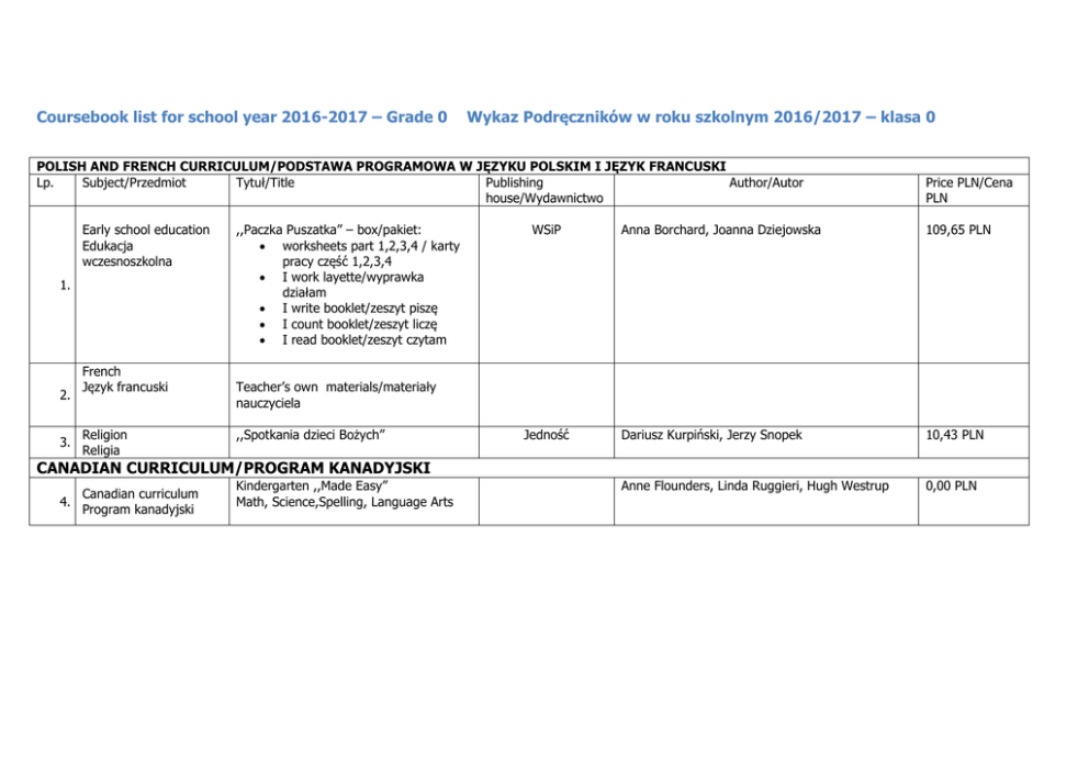 Coursebook list for school year 2016-2017 – Grade 0 Wykaz Podręczników w roku szkolnym 2016/2017 – klasa 0 POLISH AND FRENCH CURRICULUM/PODSTAWA PROGRAMOWA W JĘZYKU POLSKIM I JĘZYK FRANCUSKI Lp. Subject/Przedmiot Tytuł/Title Publishing Author/Autor house/Wydawnictwo Early school education Edukacja wczesnoszkolna 1. 2. 3. French Język francuski Religion Religia ,,Paczka Puszatka” – box/pakiet: worksheets part 1,2,3,4 / karty pracy część 1,2,3,4 I work layette/wyprawka działam I write booklet/zeszyt piszę I count booklet/zeszyt liczę I read booklet/zeszyt czytam WSiP Price PLN/Cena PLN Anna Borchard, Joanna Dziejowska 109,65 PLN Dariusz Kurpiński, Jerzy Snopek 10,43 PLN Anne Flounders, Linda Ruggieri, Hugh Westrup 0,00 PLN Teacher’s own materials/materiały nauczyciela ,,Spotkania dzieci Bożych” Jedność CANADIAN CURRICULUM/PROGRAM KANADYJSKI 4. Canadian curriculum Program kanadyjski Kindergarten ,,Made Easy” Math, Science,Spelling, Language Arts