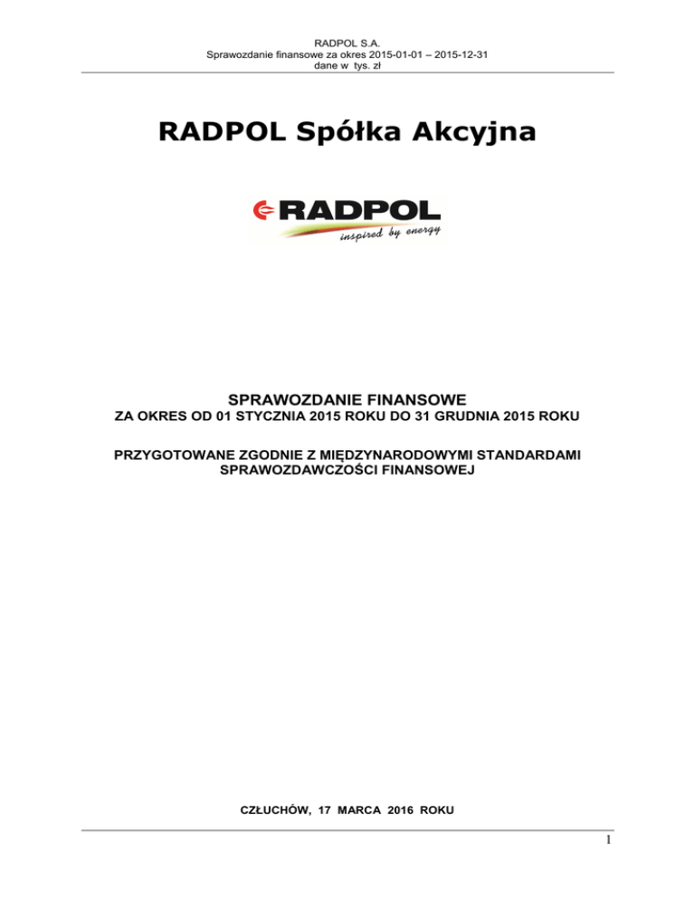 RADPOL S.A. Sprawozdanie finansowe za okres 2015-01-01 – 2015-12-31 dane w tys. zł RADPOL Spółka Akcyjna SPRAWOZDANIE FINANSOWE ZA OKRES OD 01 STYCZNIA 2015 ROKU DO 31 GRUDNIA 2015 ROKU PRZYGOTOWANE ZGODNIE Z MIĘDZYNARODOWYMI STANDARDAMI SPRAWOZDAWCZOŚCI FINANSOWEJ CZŁUCHÓW, 17 MARCA 2016 ROKU 1 RADPOL S.A. Sprawozdanie finansowe za okres 2015-01-01 – 2015-12-31 dane w tys. zł SPIS TREŚCI WYBRANE DANE FINASOWE SPRAWOZDANIA FINANSOWEGO ............................................ 4 SPRAWOZDANIE Z SYTUACJI FINANSOWEJ ................................................................................ 6 RACHUNEK ZYSKÓW I STRAT ........................................................................................................ 8 SPRAWOZDANIE Z CAŁKOWITYCH DOCHODÓW....................................................................... 9 SPRAWOZDANIE ZE ZMIAN W KAPITALE WŁASNYM............................................................. 10 SPRAWOZDANIE Z PRZEPŁYWÓW PIENIĘŻNYCH .................................................................... 11 NOTY OBJAŚNIAJĄCE DO SPRAW0ZDANIA FINANSOWEGO ................................................. 13 1. 2. 3. 4. 5. 6. 7. 8. 9. 10. 11. 12. 13. 14. 15. 16. 17. 18. 19. 20. 21. 22. 23. 24. 25. 26. 27. 28. 29. 30. 31. INFORMACJE PODSTAWOWE ......................................................................................................... 13 SKŁAD OSOBOWY ZARZĄDU I RADY NADZORCZEJ SPÓŁKI .......................................................... 13 JEDNOSTKI POWIĄZANE ............................................................................................................... 13 PODSTAWA PRAWNA SPORZĄDZENIA SPRAWOZDANIA FINANSOWEGO ....................................... 14 OŚWIADCZENIE O ZGODNOŚCI Z MSSF........................................................................................ 14 DATA ZATWIERDZENIA SPRAWOZDANIA FINANSOWEGO DO PUBLIKACJI .................................... 14 WALUTA FUNKCJONALNA I WALUTA SPRAWOZDAWCZA ............................................................ 14 KONTYNUACJA DZIAŁALNOŚCI .................................................................................................... 14 POŁĄCZENIE Z INNYMI SPÓŁKAMI ................................................................................................ 14 ZASADY WYCENY AKTYWÓW I PASYWÓW ORAZ POMIARU WYNIKU FINANSOWEGO, PRZYJĘTE PRZY SPORZĄDZANIU SPRAWOZDANIA FINANSOWEGO ............................................................... 22 ISTOTNE ZASADY RACHUNKOWOŚCI ............................................................................................ 25 NOWE STANDARDY RACHUNKOWOŚCI I INTERPRETACJE ............................................................ 25 ZMIANY SZACUNKÓW .................................................................................................................. 27 ZMIANY PREZENTACJI I KOREKTY BŁĘDÓW ................................................................................. 28 ZARZĄDZANIE RYZYKIEM FINANSOWYM ..................................................................................... 35 SEZONOWOŚĆ LUB CYKLICZNOŚĆ W DZIAŁALNOŚCI SPÓŁKI....................................................... 37 INFORMACJE DOTYCZĄCE SEGMENTÓW DZIAŁALNOŚCI .............................................................. 37 UJMOWANIE PROGRAMU MOTYWACYJNEGO DLA PRACOWNIKÓW .............................................. 43 INFORMACJA O NABYCIU AKCJI WŁASNYCH ................................................................................ 45 DYWIDENDY WYPŁACONE I ZAPROPONOWANE DO WYPŁATY ..................................................... 45 SPRAWY SĄDOWE ......................................................................................................................... 45 ZMIANY POLITYKI RACHUNKOWOŚCI I STWIERDZONE BŁĘDY DOTYCZĄCE LAT POPRZEDNICH I ICH WPŁYW NA WYNIK FINANSOWY I KAPITAŁ WŁASNY ............................................................. 45 RZECZOWE AKTYWA TRWAŁE...................................................................................................... 46 WARTOŚCI NIEMATERIALNE ........................................................................................................ 50 WARTOŚĆ FIRMY .......................................................................................................................... 51 AKCJE I UDZIAŁY .......................................................................................................................... 52 POZOSTAŁE AKTYWA TRWAŁE ..................................................................................................... 53 ZAPASY ........................................................................................................................................ 53 NALEŻNOŚCI ................................................................................................................................ 54 ŚRODKI PIENIĘŻNE ....................................................................................................................... 55 ROZLICZENIA MIĘDZYOKRESOWE ................................................................................................ 56 2 RADPOL S.A. Sprawozdanie finansowe za okres 2015-01-01 – 2015-12-31 dane w tys. zł 32. 33. 34. 35. 36. 37. 38. 39. 40. 41. 42. 43. 44. 45. 46. 47. 48. 49. 50. 51. 52. 53. 54. 55. 56. 57. KAPITAŁ PODSTAWOWY, ZYSK NA AKCJĘ I WARTOŚĆ KSIĘGOWA NA AKCJĘ .............................. 57 AKCJE WŁASNE ............................................................................................................................ 60 KAPITAŁ ZAPASOWY Z EMISJI AKCJI ............................................................................................ 60 ZYSKI ZATRZYMANE ................................................................................................................