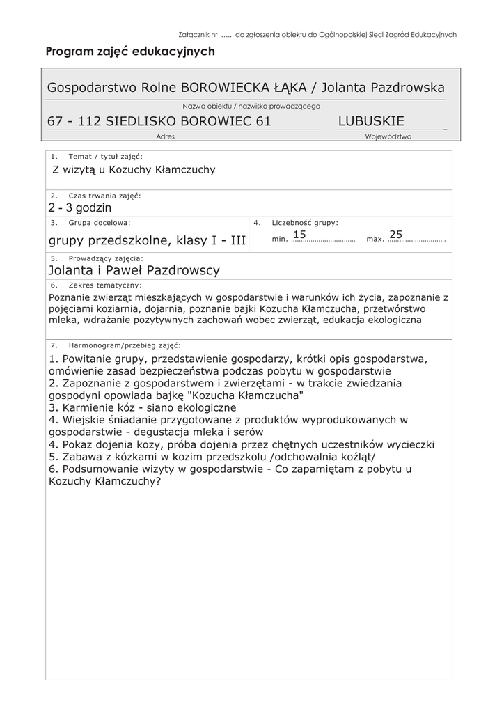 ZaãĈcznik nr ….. do zJãRVzenia obiektu do Ogólnopolskiej Sieci Zagród Edukacyjnych Program zajčþ edukacyjnych Gospodarstwo Rolne BOROWIECKA àĄKA / Jolanta Pazdrowska Nazwa obiektu / nazwisko prowadzĈcego LUBUSKIE 67 - 112 SIEDLISKO BOROWIEC 61 Adres 1. _ Województwo Temat / tytuá ]DMĊü: Z wizytą u Kozuchy Káamczuchy 2. Czas trwania zajĊü: 2 - 3 godzin 3. Grupa docelowa: grupy przedszkolne, klasy I - III 5. 4. LiczebnoĞü grupy: 15 min. …………………………… 25 max. ………………………… Prowad]ąFy zaMĊFia: Jolanta i Paweá Pazdrowscy Poznanie zwierząt mieszkających w gospodarstwie i warunków ich Īycia, zapoznanie z pojĊciami koziarnia, dojarnia, poznanie bajki Kozucha Káamczucha, przetwórstwo mleka, wdraĪanie pozytywnych zachowaĔ wobec zwierząt, edukacja ekologiczna 6. Zakres tematyczny: 7. Harmonogram/przebieg zajĊü 1. Powitanie grupy, przedstawienie gospodarzy, krótki opis gospodarstwa, omówienie zasad bezpieczeĔstwa podczas pobytu w gospodarstwie 2. Zapoznanie z gospodarstwem i zwierzĊtami - w trakcie zwiedzania gospodyni opowiada bajkĊ "Kozucha Káamczucha" 3. Karmienie kóz - siano ekologiczne 4. Wiejskie Ğniadanie przygotowane z produktów wyprodukowanych w gospodarstwie - degustacja mleka i serów 4. Pokaz dojenia kozy, próba dojenia przez chĊtnych uczestników wycieczki 5. Zabawa z kózkami w kozim przedszkolu /odchowalnia koĨląt/ 6. Podsumowanie wizyty w gospodarstwie - Co zapamiĊtam z pobytu u Kozuchy Káamczuchy? ZaãĈcznik nr ….. do zJãRVzenia obiektu do Ogólnopolskiej Sieci Zagród Edukacyjnych 8. Pomoce dydaktyczne: tekst bajki "Kozucha Káamczucha",deski serów i mleko do degustacji 9. Dodatkowe uwagi: KaĪdy uczestnik wyjeĪdĪa z kolorowanką - ZwierzĊta gospodarskie. Podczas Ğniadania dzieci otrzymują pajdĊ chleba z serem kozim z dĪemem lub miodem z lokalnej pasieki. KaĪda próba dojenia kozy przez uczestnika wycieczki koĔczy siĊ sukcesem! Istnieje moĪliwoĞü przeprowadzenia programu w jĊzyku angielskim. Podpis Data